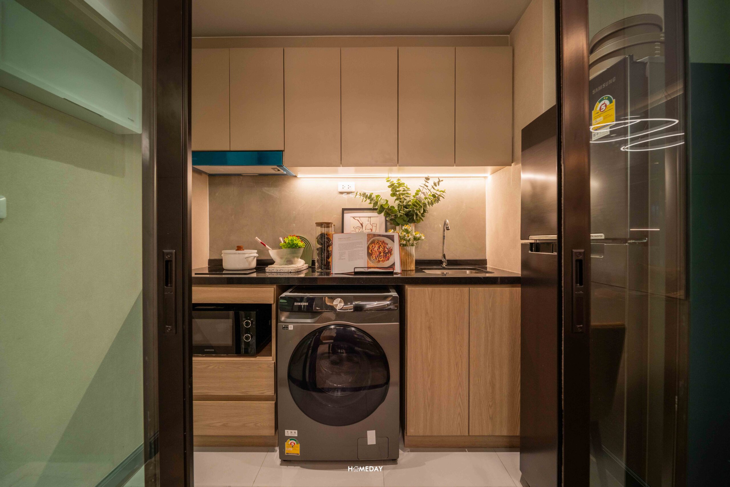 ถัดไปด้านในสุดเป็น Pantry ห้องครัวปิด กั้นเป็นสัดส่วนด้วยประตูบานเลื่อนแบบเปิดตรงกลาง กันกลิ่นรบกวนได้เป็นอย่างดี ภายในห้องครัวได้พื้นที่มาพอสมควร ใช้งานได้สะดวก ซึ่งทางโครงการได้ให้ชุดเคาน์เตอร์ครัวมาตรฐานตามนี้เลย ท็อปด้วยหินสังเคราะห์ หน้าบานตู้จะได้ Soft Close ทุกบาน ได้เป็นแบบบานเปิดและลิ้นชักไว้เก็บพวกแก้วน้ำ จาน ชาม ของเครื่องใช้ต่าง ๆ ได้ทั้งด้านบนและล่างให้เป็นระเบียบ เคาน์เตอร์อ่างล้างจานได้เป็นแบบหลุมเดียว พร้อม Blackspace ง่ายต่อการเช็ดทำความสะอาด, เตาไฟฟ้าแบบ 2 หัว และเครื่องดูดควัน นอกจากนี้มีช่องไว้รองรับเครื่องซักผ้า, ไมโครเวฟ และพื้นที่ไว้วางตู้เย็นขนาดกลางได้ สามารถบิลต์อินตู้ไว้พรางตาในส่วนของตู้ Load Center ก็ทำทำได้เช่นกัน ถือว่าให้มาค่อนข้างดีเลยครับ