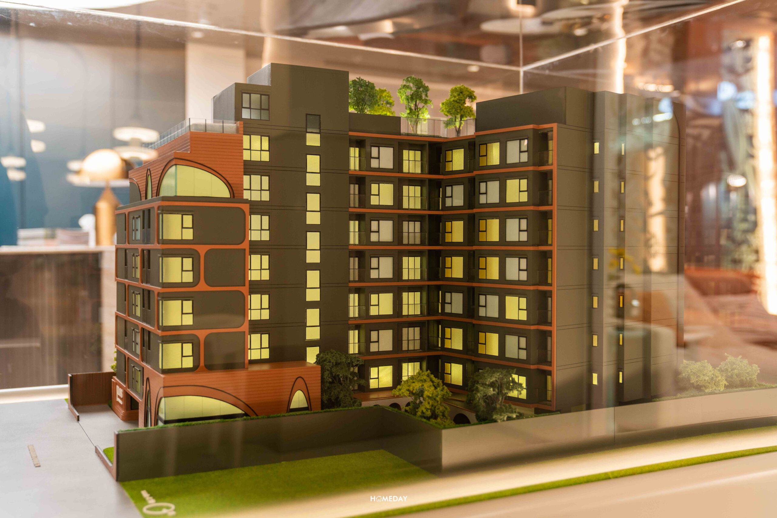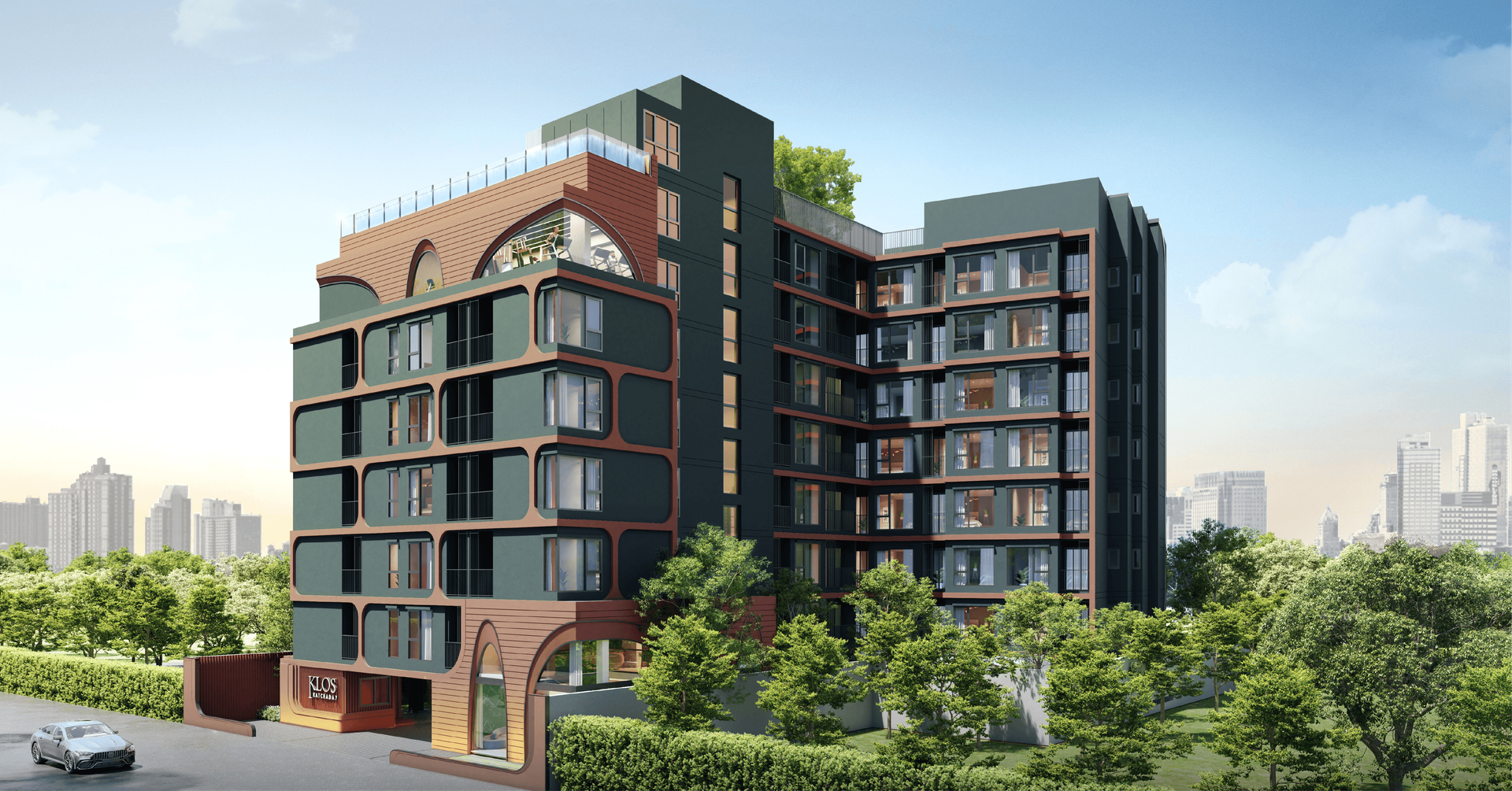 มาพูดถึงตัวอาคารกันบ้างครับ อาคารพักอาศัยจะเป็นรูปตัว L ออกแบบมาในสไตล์โมเดิร์น ภายนอกใช้เป็นโทนสีเขียวอมน้ำเงิน ให้ความรู้สึกกลมกลืนกับธรรมชาติในท่ามกลางป่าปูนของตึกรามต่าง ๆ และใช้สีส้มอิฐตัดเส้น ทำให้ดูโดดเด่นด้วยการเล่นเส้นสายและจังหวะความโค้งตรงช่วงด้านหน้า Facade กันได้อย่างลงตัว ผสมผสานกันอย่างสวยงามดูเป็นโมเดิร์น ตอบรับไลฟ์สไตล์คนรุ่นใหม่ได้เป็นอย่างดี