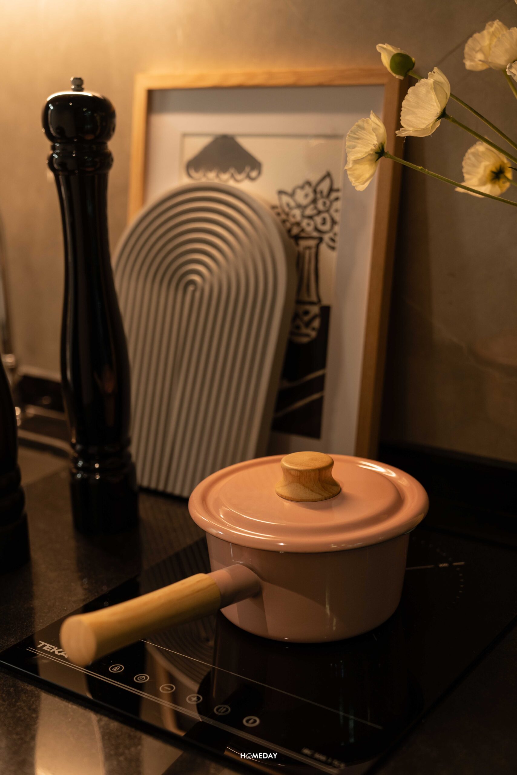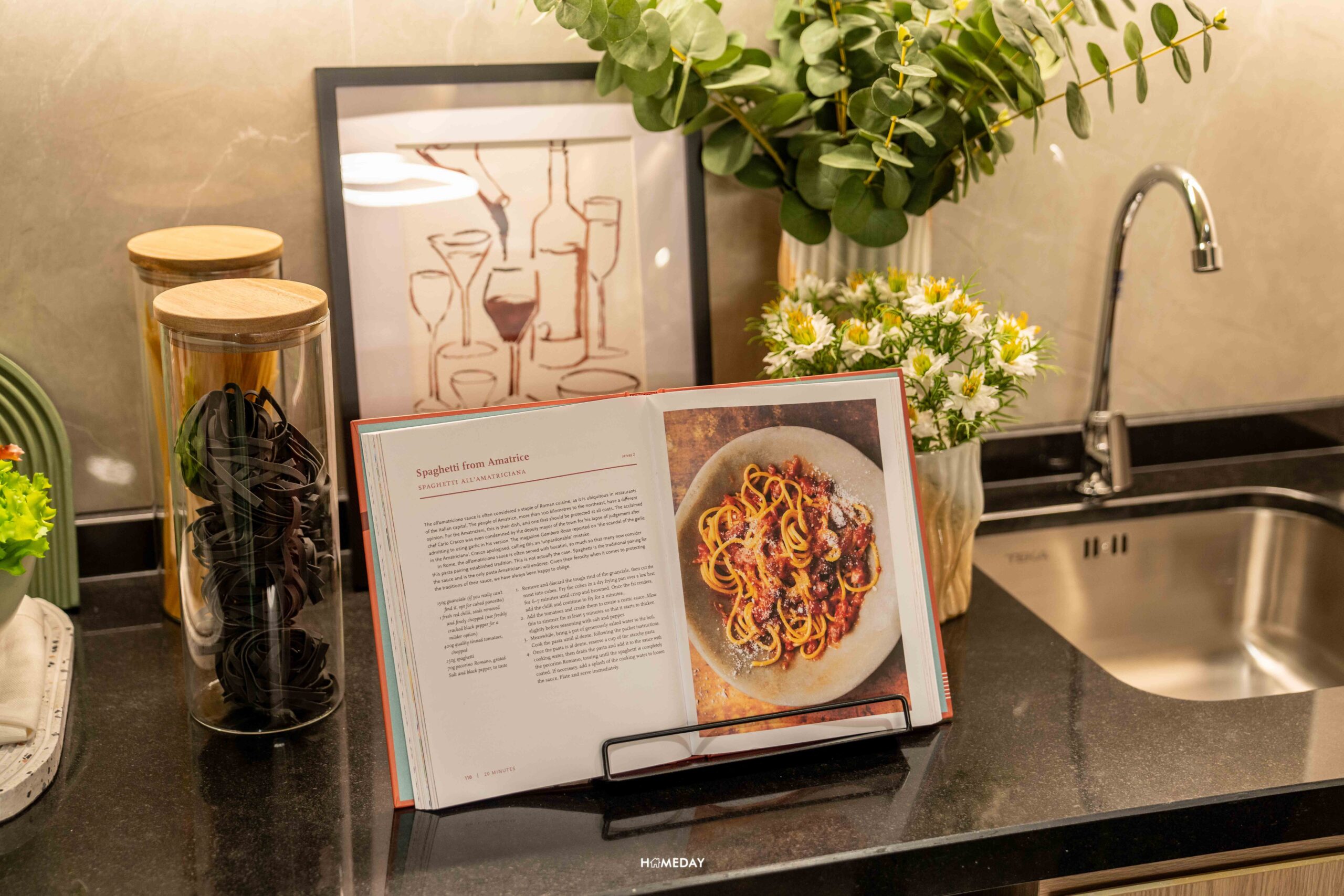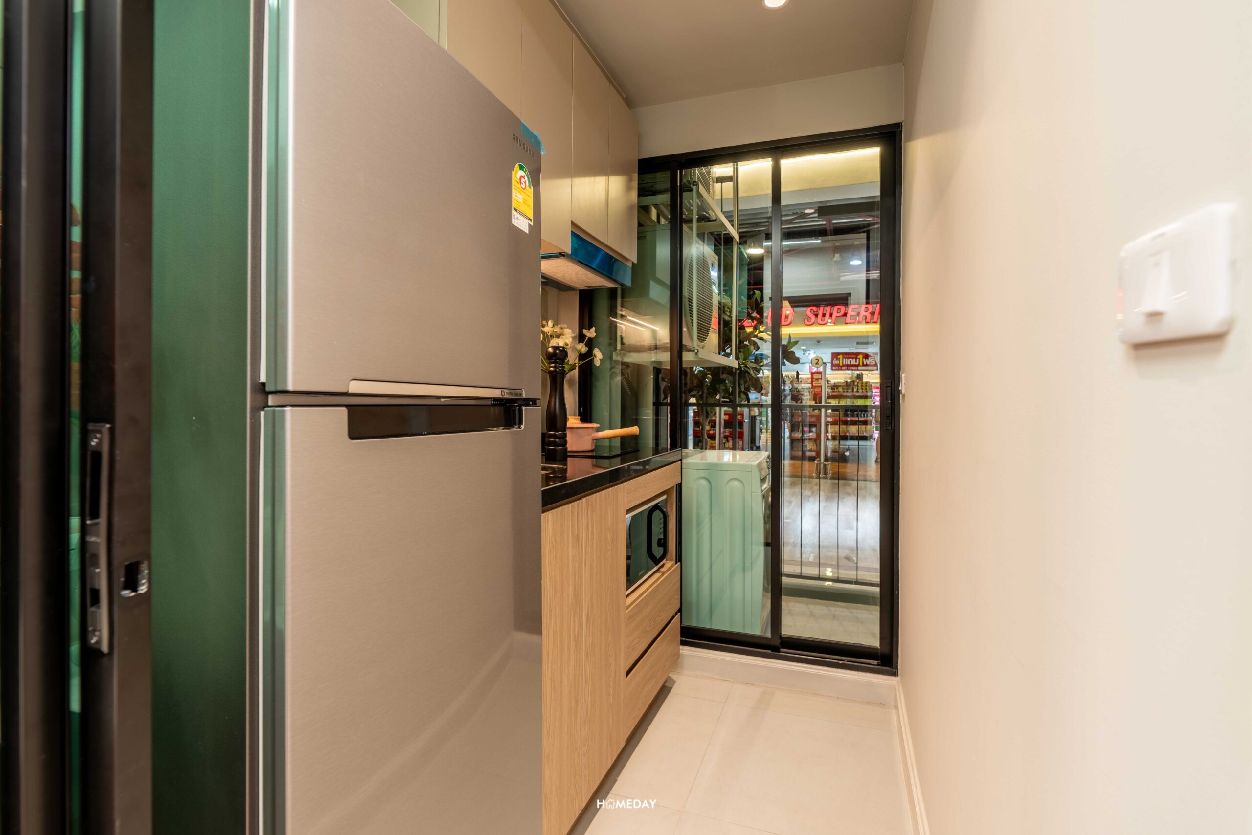 มาดูจุดเด่นที่เป็นห้องครัวปิดที่ติดระเบียง ประตูห้องครัวเป็นบานเลื่อน กั้นเป็นสัดส่วน กันกลิ่นมารบกวนด้านในโซนพักผ่อน และช่วยระบายกลิ่นออกไปที่ประตูระเบียง ห้องครัวมีพื้นที่ใช้งานที่กระชับ แต่ก็สามารถยืนทำอาหาร ล้างจาน เปิดตู้เย็นได้ ทางโครงการให้มาเป็น Fully Fitted เหมือนเช่นเคย ได้ชุดเคาน์เตอร์ครัวมาตรฐานตามนี้เลย ท็อปด้วยหินสังเคราะห์ หน้าบานตู้เป็น Soft Close ทุกบาน เคาน์เตอร์อ่างล้างจานได้เป็นแบบหลุมเดียว พร้อม Blackspace ง่ายต่อการเช็ดทำความสะอาด เตาไฟฟ้าแบบ 2 หัว และเครื่องดูดควัน พร้อมช่องใส่ไมโครเวฟ และพื้นที่ไว้วางตู้เย็นขนาดกลางได้