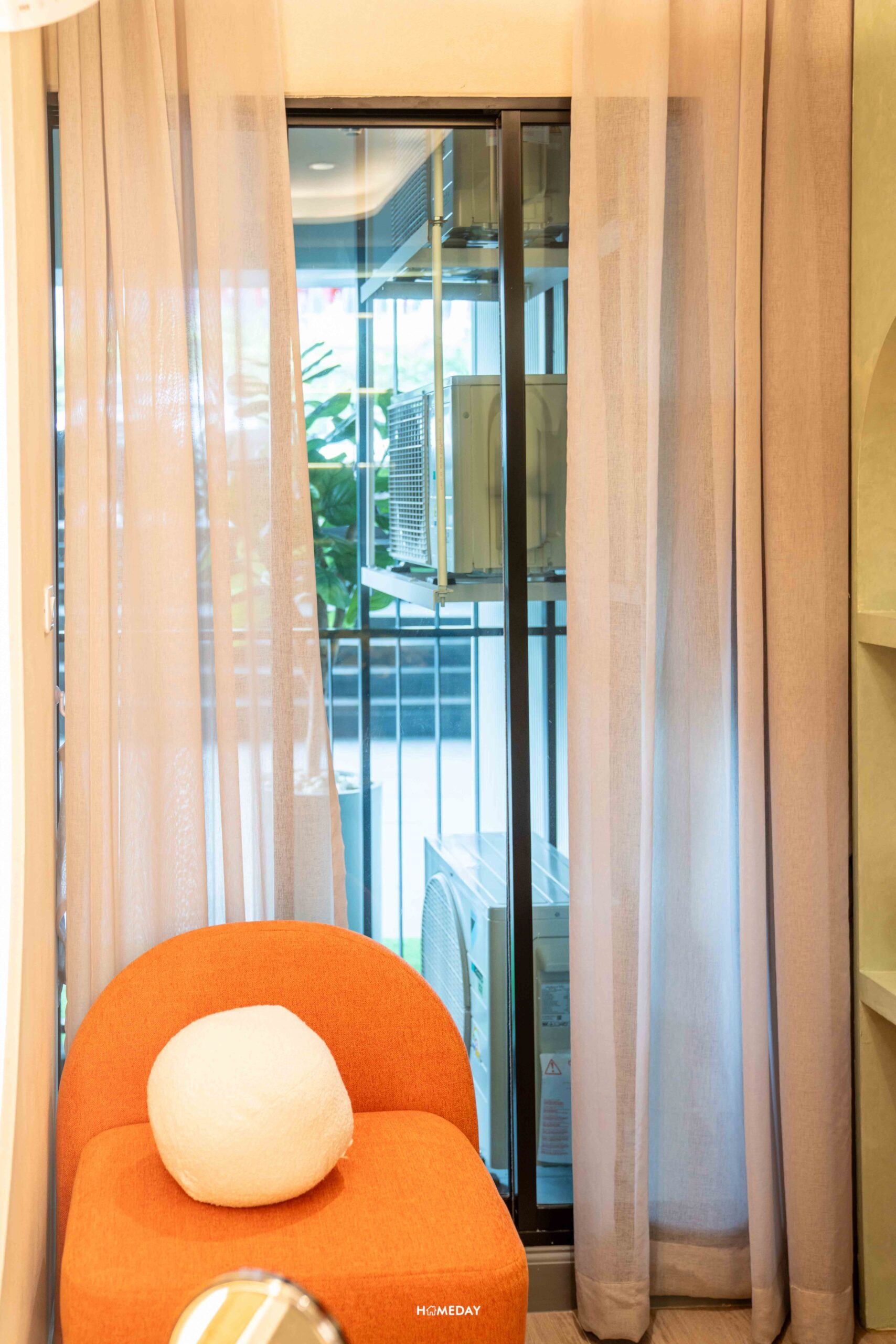 ติดกันจะเป็นประตูกระจกบานเลื่อนออกไปยังระเบียง พื้นที่ระเบียงมีขนาดกำลังดี สามารถวางราวตากผ้า หรือจะปลูกต้นไม้ในกระถางขนาดเล็ก จัดเป็นสวนไม้ตกแต่งเพื่อเพิ่มพื้นที่สีเขียวให้กับห้องได้ ราวระเบียงกันตกเป็นเหล็กทำสีดำ ที่ผนังแขวนคอมเพรสเซอร์แอร์ไว้ 3 ตัว