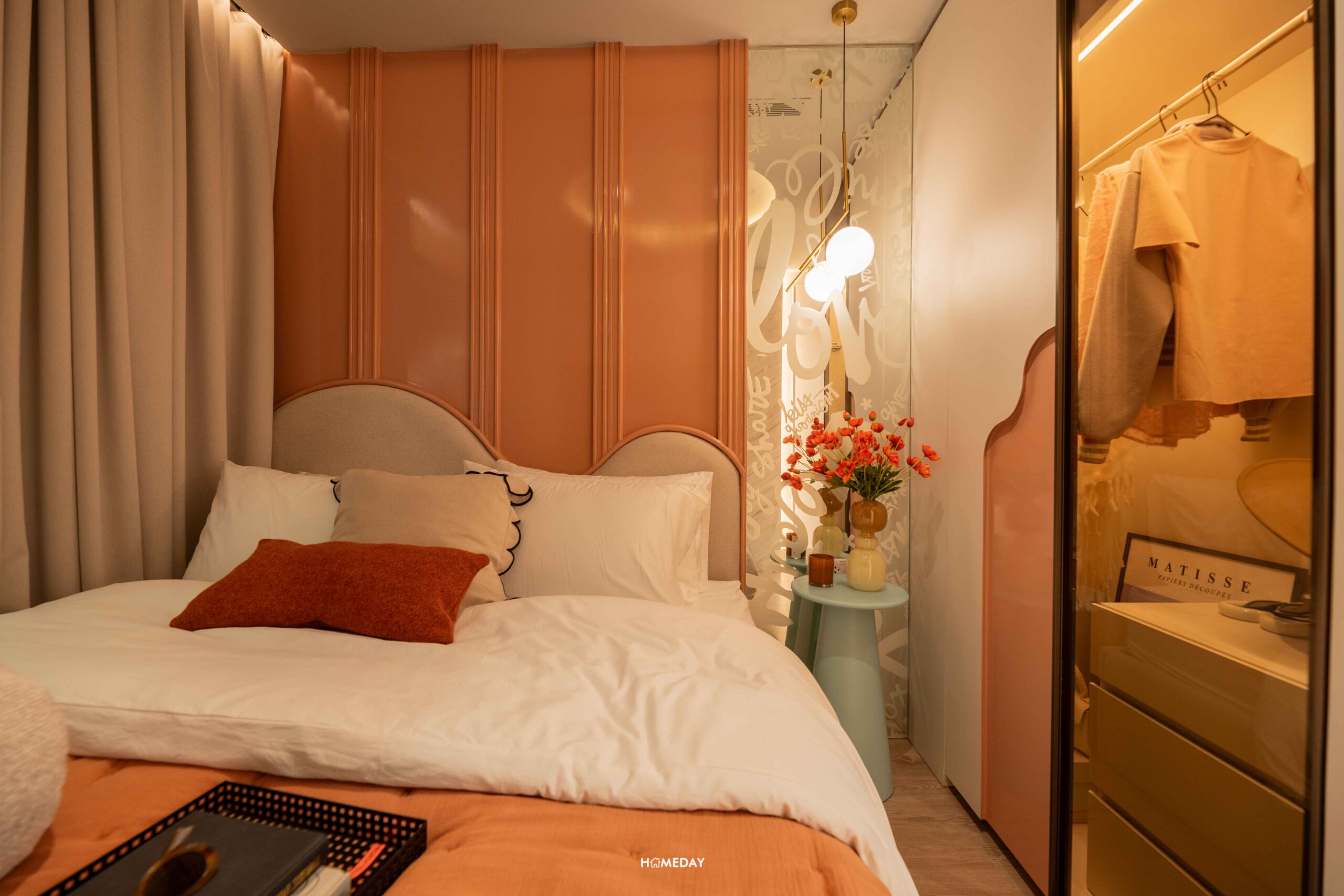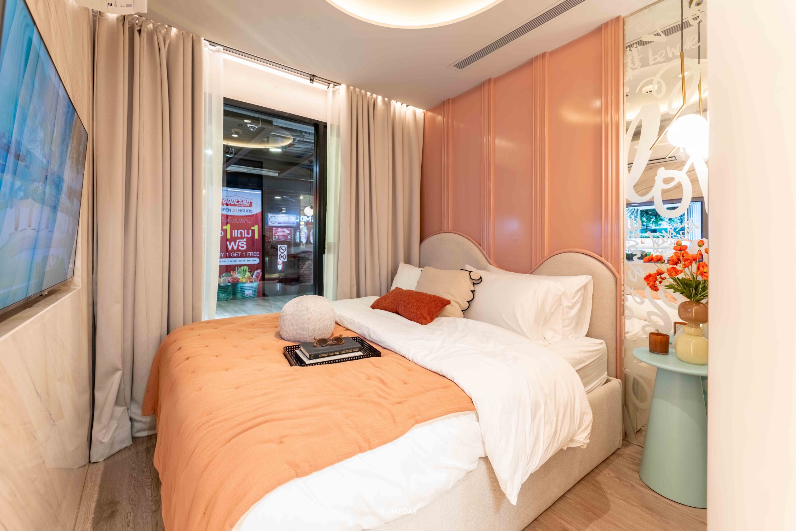 ภายในห้องนอนได้พื้นที่มาขนาดกว้างกำลังดี มีหน้าต่างกระจกบานใหญ่เหมือนเช่นเคย ช่วยให้ห้องไม่มืดทึบ ดูสว่างโปร่งโล่ง วางเตียงขนาด 5-6 ฟุตได้ บริเวณปลายเตียงติดตั้งทีวีแขวนซึ่งได้ระยะสายตากำลังพอดี ส่วนบริเวณข้างเตียงสามารถบิลต์อินตู้เสื้อผ้าทรงสูงได้อีกด้วยครับ มีพื้นที่เหลือรอบเตียงได้ทำความสะอาด และเปลี่ยนผ้าปูที่นอนได้สะดวกเลย