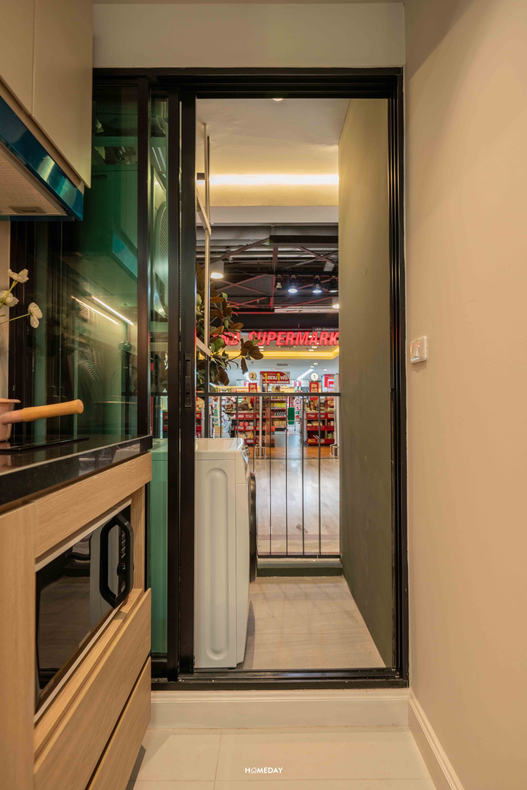 ในส่วนของระเบียงซักล้างจะได้เป็นประตูกระจกบานเลื่อนแบบ 3 ตอน ยกพื้นกั้นเพื่อป้องกันฝุ่น สิ่งสกปรก และกันฝนสาดเข้ามา ราวระเบียงได้เป็นระแนงเหล็ก ขนาดความกว้างของระเบียงกำลังดี พร้อมติดตั้งก๊อกสนาม, เต้าเสียบปลั๊กไฟพร้อมฝาครอบกันน้ำ และเจาะท่อระบายน้ำมาให้เรียบร้อย สามารถใช้เป็นพื้นที่วางเครื่องซักผ้าฝาหน้าหรือฝาบน ขนาด 7-12 กิโลกรัมได้เลย ส่วนด้านบนแขวนแอร์คอมเพรสเซอร์ได้ 2 ตัว แบบห้องไทป์นี้เหมาะที่จะอยู่คนเดียวได้อย่างสบาย ๆ เลยครับ