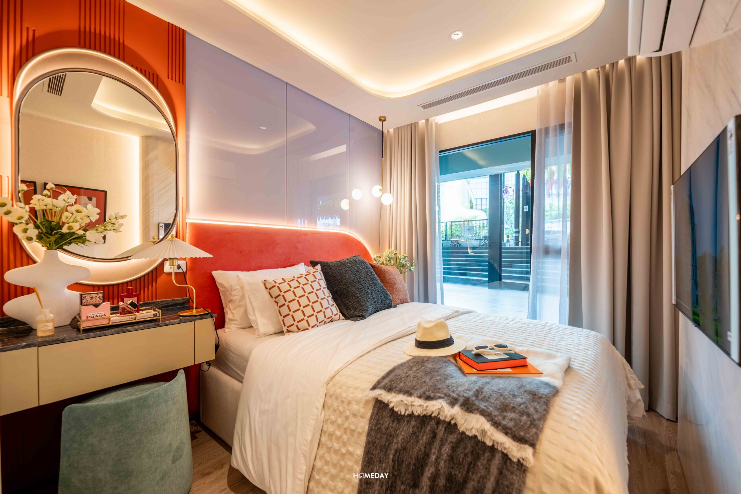 มาดูกันที่ห้องนอนกันครับ ประตูห้องนอนเป็นแบบบานเปิด กั้นความเป็นส่วนตัวแยกสัดส่วนได้ดี ภายในห้องนอนมีพื้นที่กว้าง เพิ่มความโปร่งโล่งรับแสงธรรมชาติด้วยหน้าต่างกระจกบานใหญ่ พร้อมบานกระทุ้ง 1 บาน ช่วยระบายอากาศภายในห้อง ซึ่งเราสามารถติดตั้งม่านเพิ่มเติมเพื่อกั้นความเป็นส่วนตัวได้ โดยพื้นที่ห้องนอนสามารถวางเตียงขนาด 6 ฟุตได้สบาย ๆ ปลายเตียงสามารถแขวนทีวี โดยยังมีเหลือพื้นที่ให้เดินรอบเตียงได้ไม่มีปัญหา บริเวณหัวเตียงวางโต๊ะหัวเตียงได้ 1 ฝั่ง ส่วนอีกด้านสามารถบิลต์อินตู้เสื้อผ้าไซซ์กลางแบบเต็มความสูงได้เลย พร้อมวางโต๊ะเครื่องแป้ง ที่ด้านข้างมีปลั๊กไฟรองรับไว้ให้ใช้งานอุปกรณ์ทำผม หรือเอาไว้ชาร์จสมาร์ตโฟนได้สะดวกอีกด้วยครับ