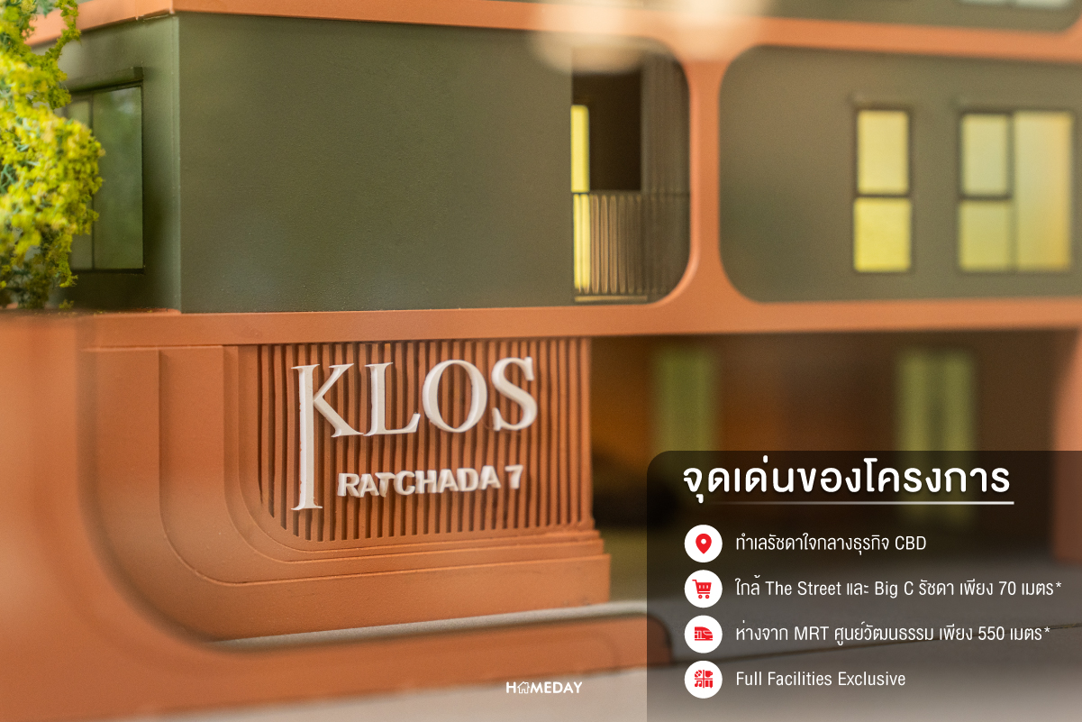 สิ่งอำนวยความสะดวกรอบโครงการ สรุป คอนโดที่เติมเต็มทุกช่องว่างให้ชีวิตติดเมือง ตอบโจทย์ทุกไลฟ์สไตล์กับคอนโดมิเนียม ‘KLOS รัชดา 7’ เป็นคอนโด Low-Rise สูง 8 ชั้น เป็นส่วนตัวด้วยจำนวน 111 ยูนิต บนทำเลศักยภาพใจกลางเมืองรัชดาภิเษก ซึ่งเป็นศูนย์กลางทั้งอยู่อาศัยและธุรกิจแห่งใหม่ New CBD ที่เชื่อมต่อกับโซนกรุงเทพชั้นใน รายล้อมไปด้วยแหล่งงาน อาคารสำนักงาน คอนโดมิเนียมที่อยู่อาศัย ศูนย์การค้าขนาดใหญ่ และโครงการมิกซ์ยูสที่กำลังพัฒนาอีกมากมาย เชื่อมต่อสู่ใจกลางเมืองได้อีกหลายโซน ใกล้ทางด่วนและจุดเชื่อมต่อรถไฟฟ้าทั้งสายสีส้ม สายแอร์พอร์ตลิ้งก์ และสายสีเหลือง ครบครันไปด้วยแหล่งรวมสีสันของชีวิตคนเมืองย่านรัชดาฯ ในแบบ Day & Night Lifestyle ตอบโจทย์ทุกความเป็นคุณได้อย่างเต็มที่ ตามคอนเซ็ปต์ที่ว่า “IT’S SO KLOS เติมเต็มทุกช่องว่างของคุณ”