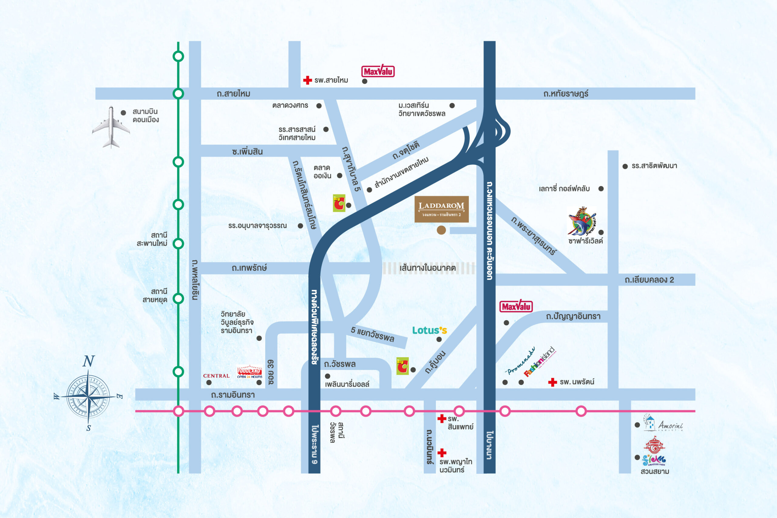 สถานศึกษารร.อุดมวิทยาม.กรุงเทพม.ธรรมศาสตร์ม.รังสิต ห้างสรรพสินค้าHomeproFuture Park รังสิตZpell รังสิตMajor รังสิตZeer รังสิตLotus’s การเดินทางรพ.เปาโลรพ.ปทุมเวชรพ.แพทย์รังสิตรพ.บางประกอก