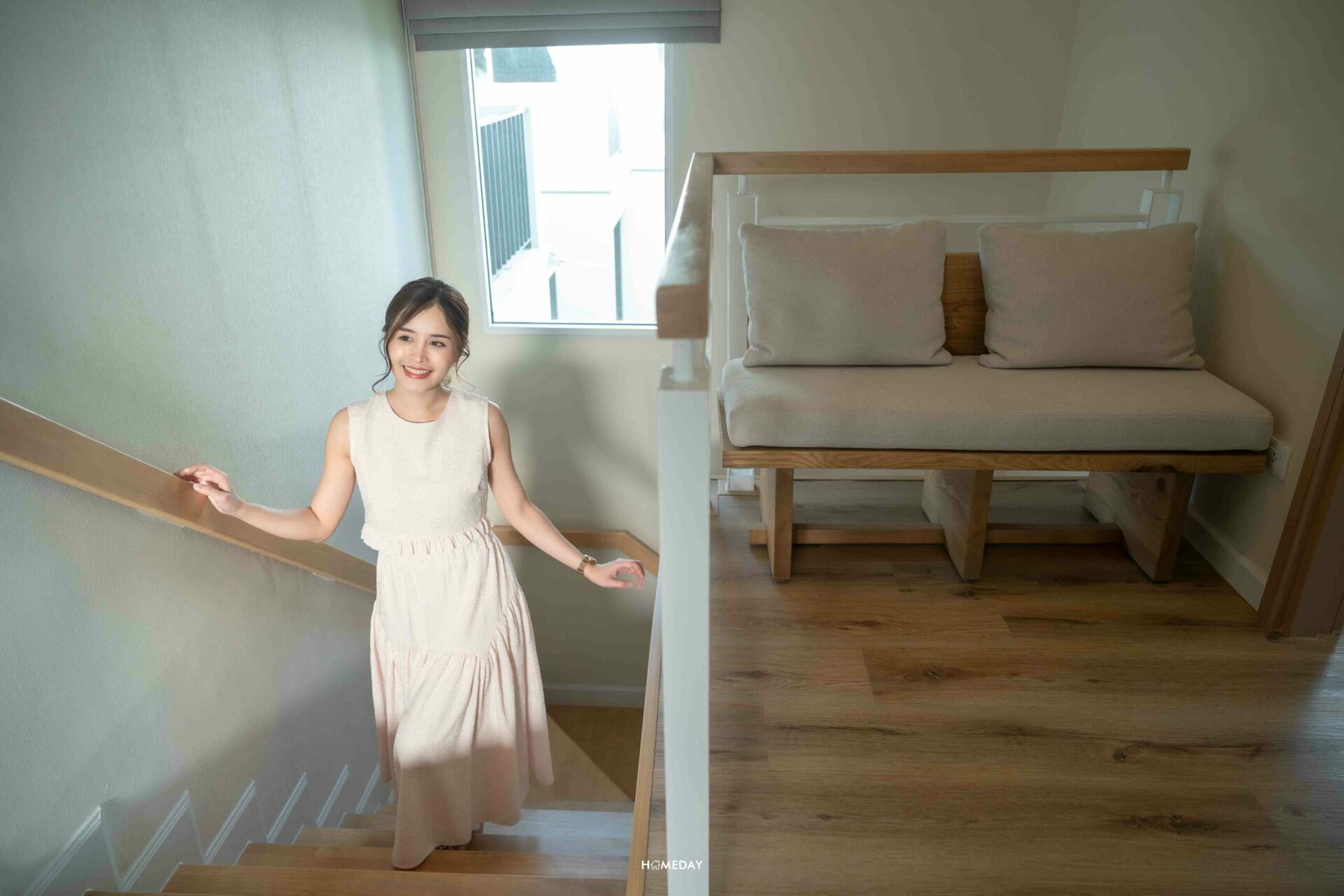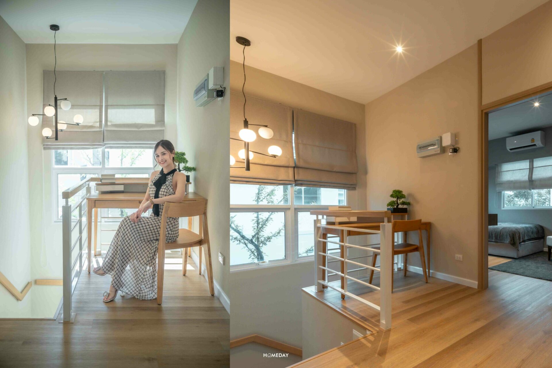 ขึ้นมาสำรวจที่ชั้น 2 กันต่อเลย จากโถงบันได ส่วนนี้จะได้บานหน้าต่างขนาดใหญ่ รับแสงช่วยเพิ่มความโปร่งให้กับบ้านในเวลากลางวัน ติดกับบันไดบริเวณด้านหน้าห้องนอน 3 ตรงนี้จะมีกิมมิกเล็ก ๆ น้อย ๆ ที่น่ารักมาก ๆ ทางโครงการเว้นพื้นที่เอาไว้ให้ ขนาดกำลังพอเหมาะ เราสามารถวางม้านั่ง, โต๊ะทำงาน, ชั้นวางของ, ตู้เก็บของ หรืออื่น ๆ ได้ตามใจชอบเลยค่ะ