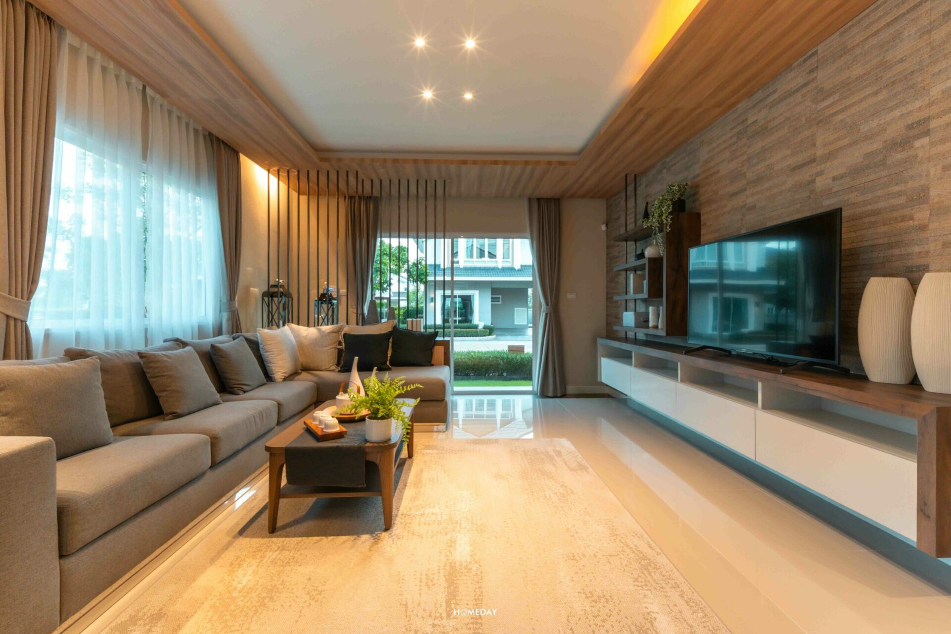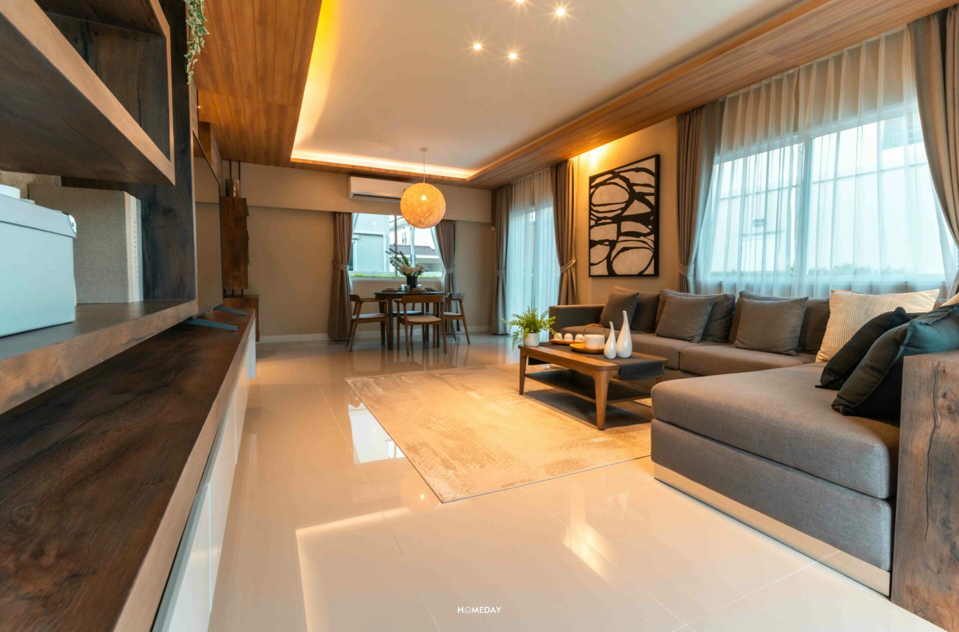 ระยะรับชมระหว่างทีวีและโซฟายังได้มาดีเหมือนเดิมเลย แม้แบบบ้านจะเล็กลง แต่พื้นที่ส่วน Living Area ถือได้ว่าไซซ์ค่อนข้างใกล้เคียงกับแบบบ้าน Lucerne ค่ะ เราสามารถบิลต์อินชั้นทีวี วางชุดโซฟาขนาดใหญ่ เพิ่มโต๊ะกลาง หรือจะใส่อาร์มแชร์เข้าไปด้วยแบบบ้านตัวอย่าง ก็ยังเหลือพื้นที่ค่อนข้างเยอะเลยค่ะ