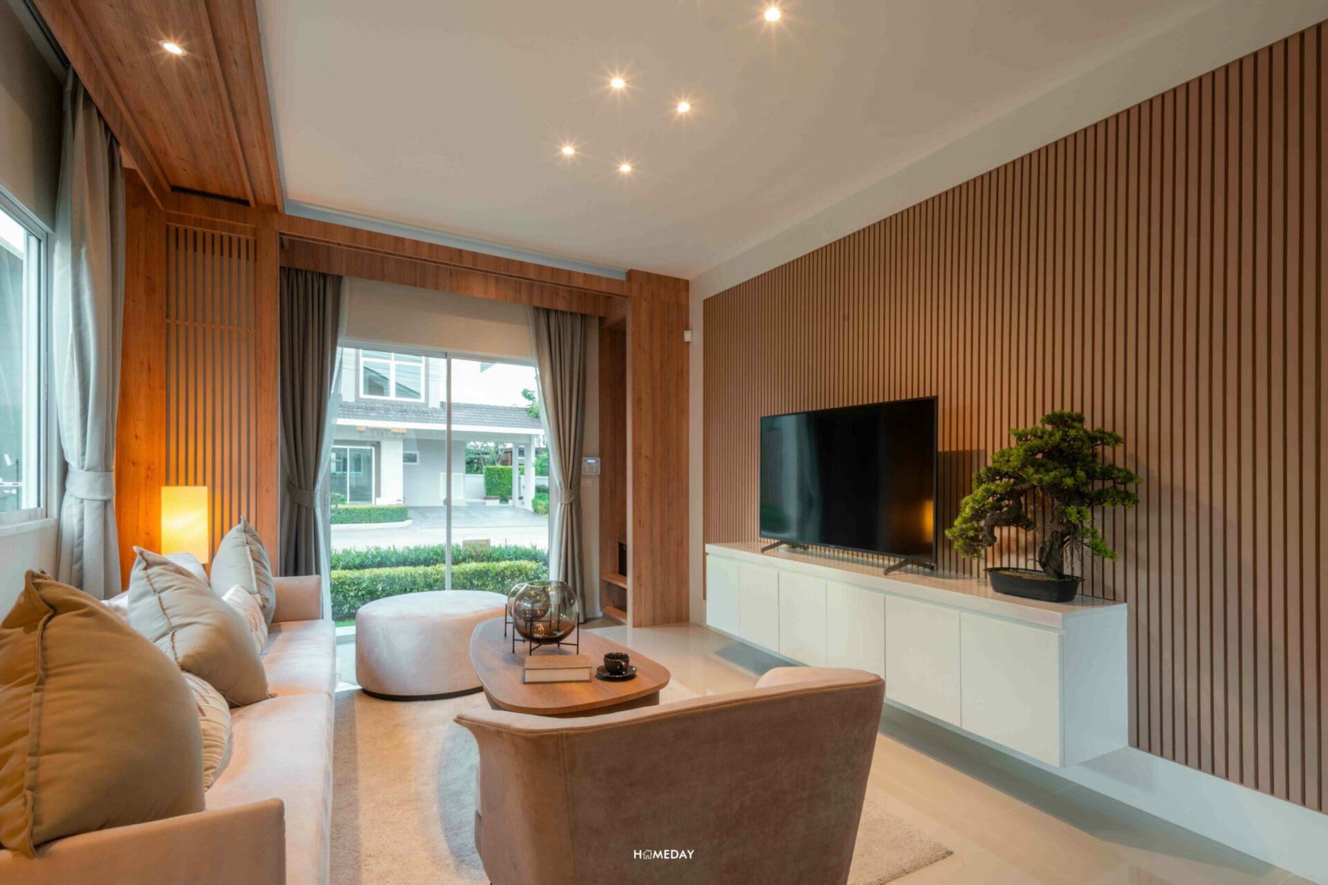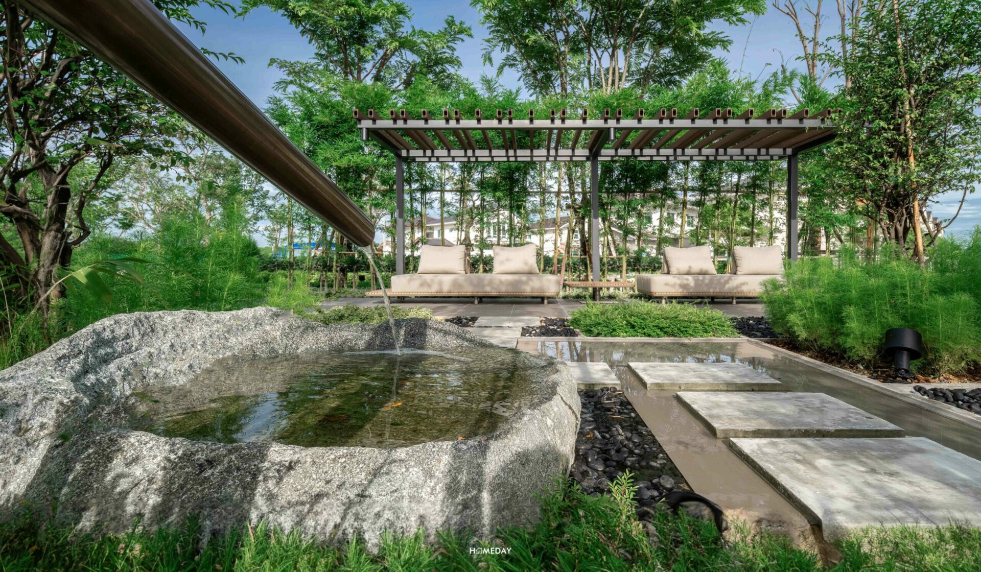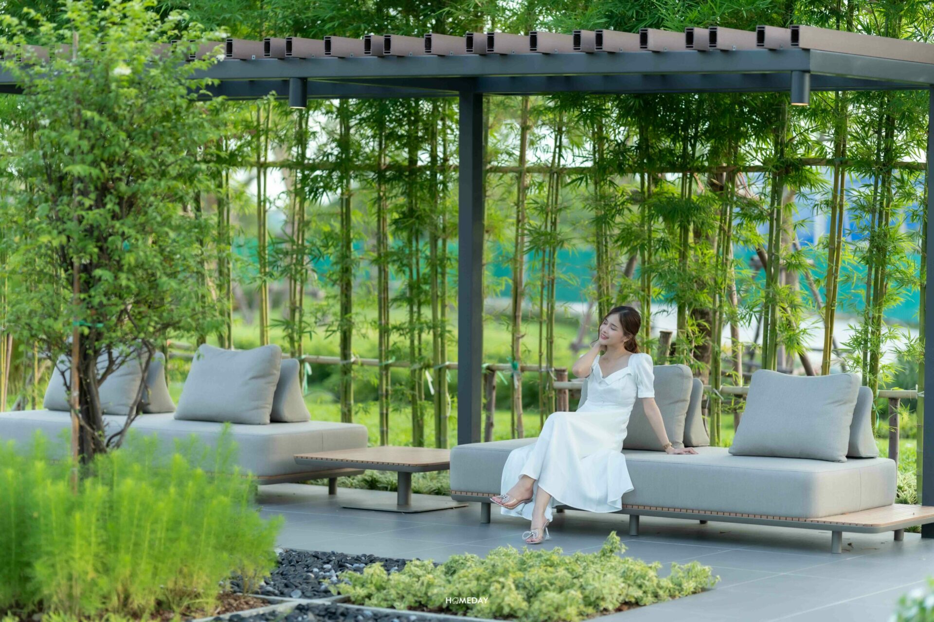 พื้นที่นั่งเล่นในแบบ Zen living รายล้อมด้วยธรรมชาติและสวนดอกไม้