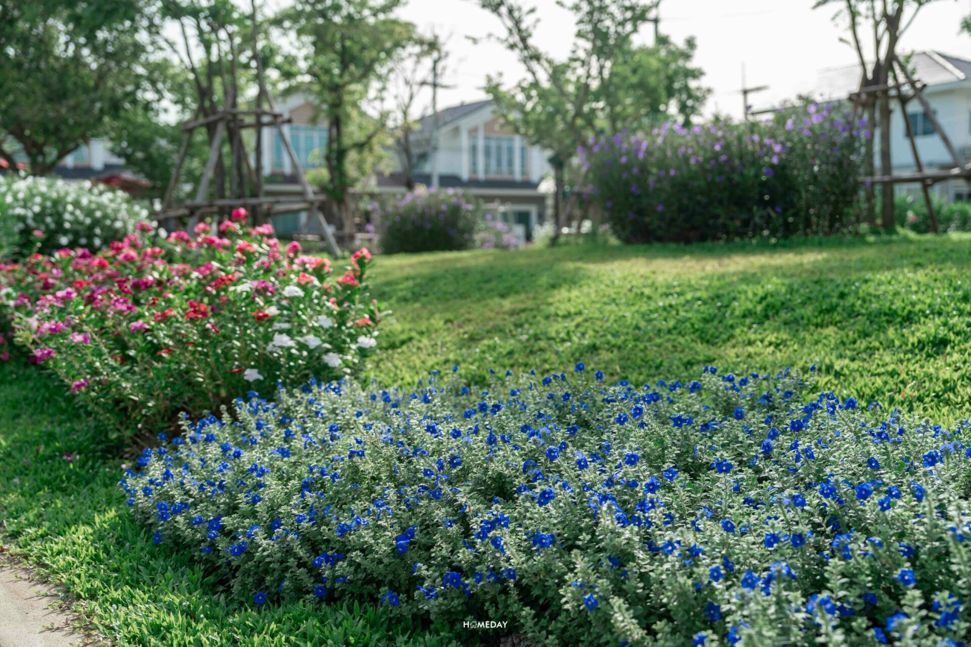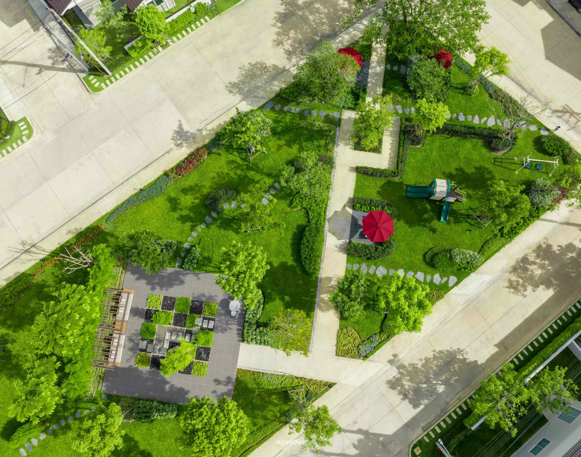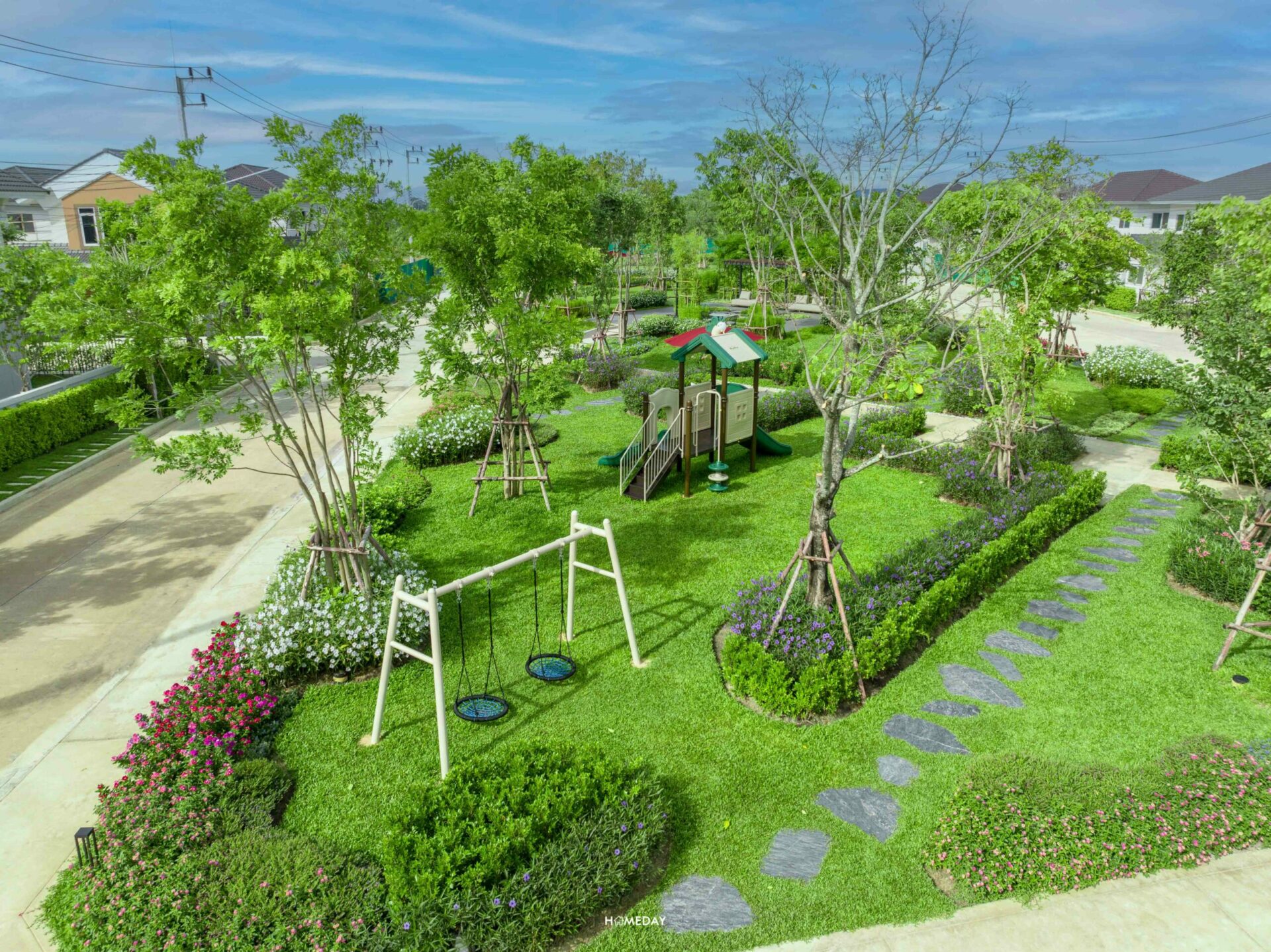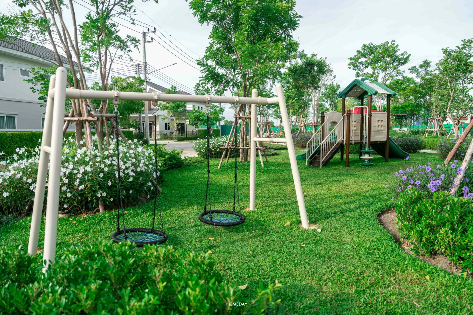 สนามเด็กเล่นของทางโครงการรายล้อมด้วยต้นไม้และดอกไม้ให้บรรยากาศร่มรื่น