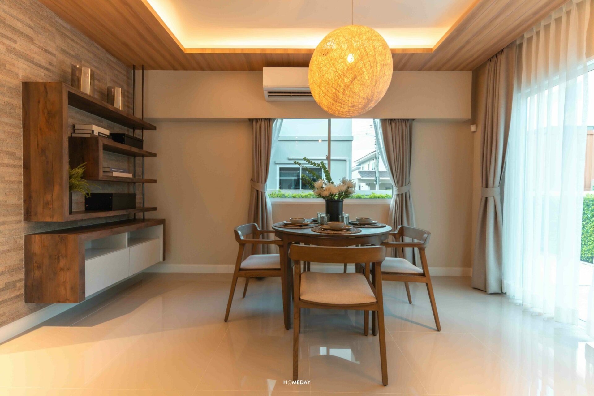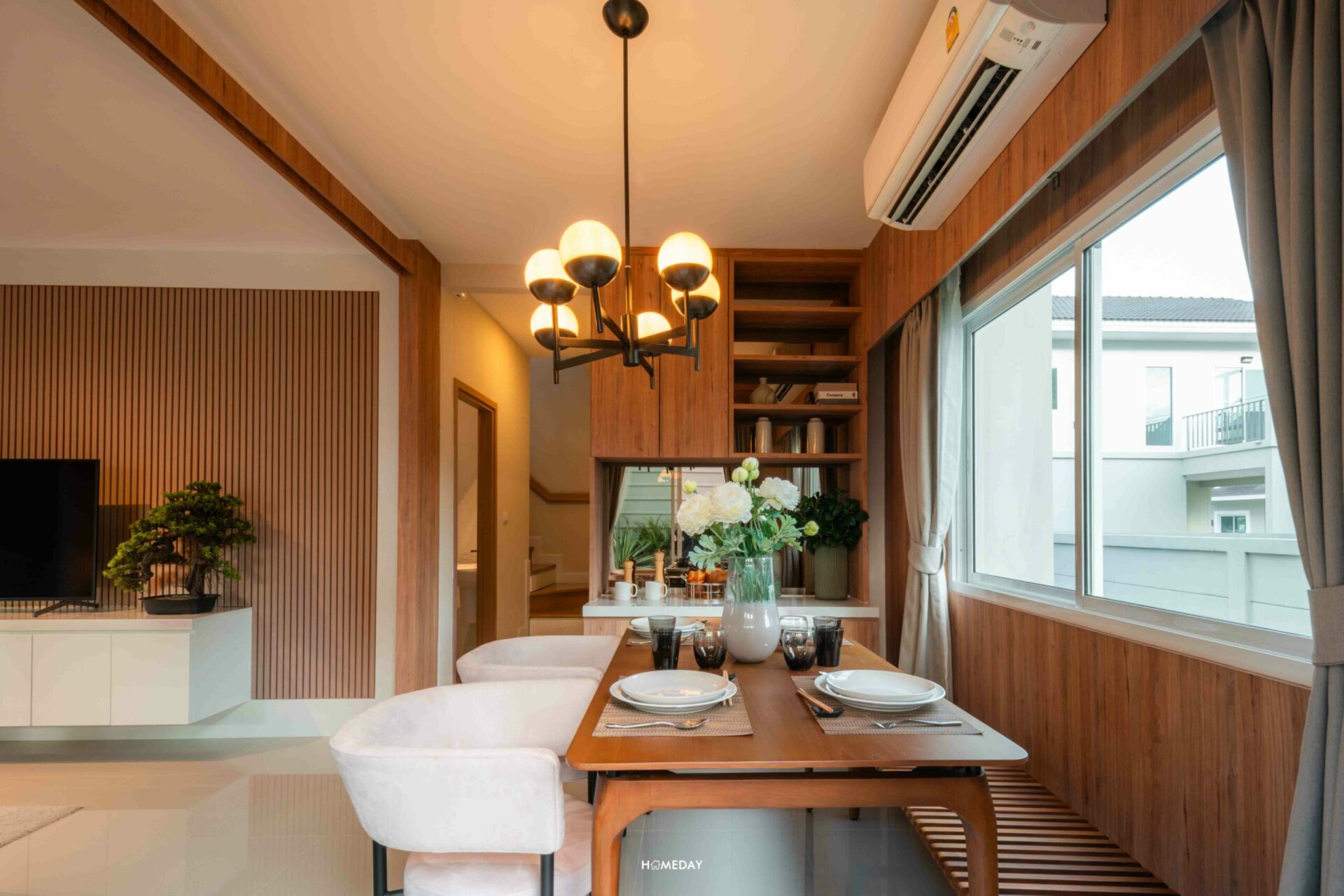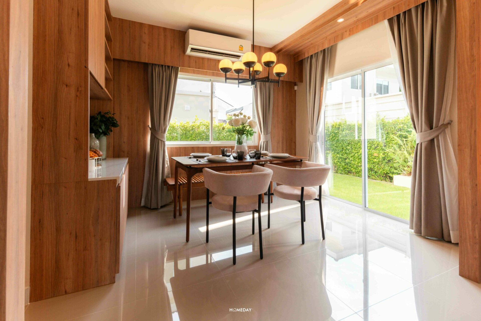 ทางด้านของ Dining Area ทางโครงการตกแต่งเป็นไอเดียให้ดูได้น่ารักมาก ๆ โดยเลือกบิลต์อินม้านั่งติดกำแพงสำหรับ 2 ที่นั่ง และวางเก้าอี้เพิ่มอีก 2 ตัว รวมเป็น 4 ที่นั่ง ทุกอย่างดูเข้ามุมได้อย่างลงตัว ไม่กินพื้นที่เลยค่ะ แถมยังเหลือพื้นที่ด้านข้างให้ใส่ฟังก์ชันอื่น ๆ เพิ่มเติมได้อีกด้วย นั่งทานข้าวชิลล์ ๆ รับวิวสวนข้างบ้านได้แบบเพลิน ๆ เลยค่ะสำหรับมุมนี้