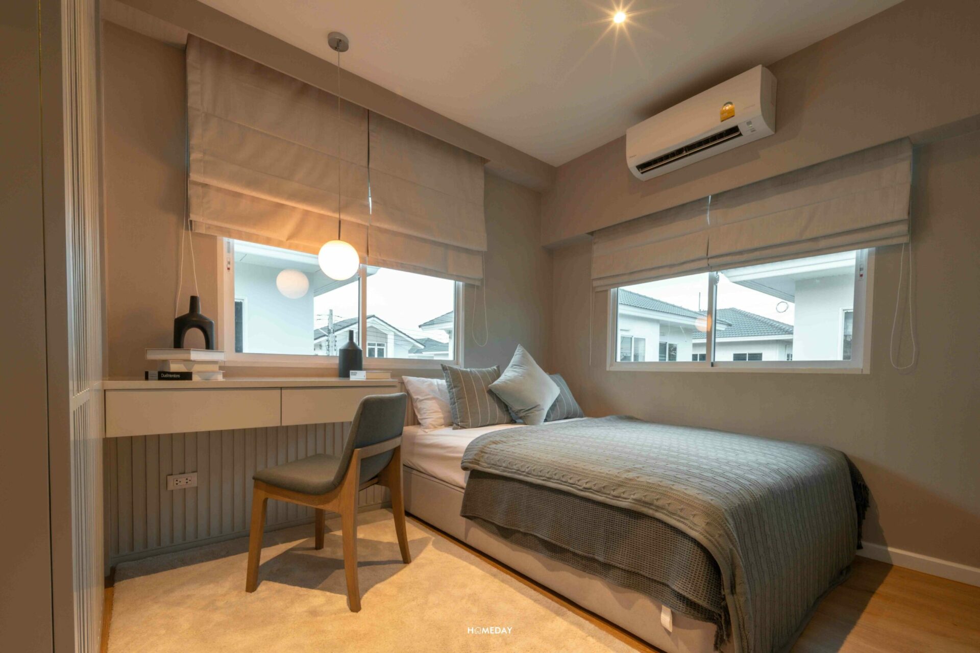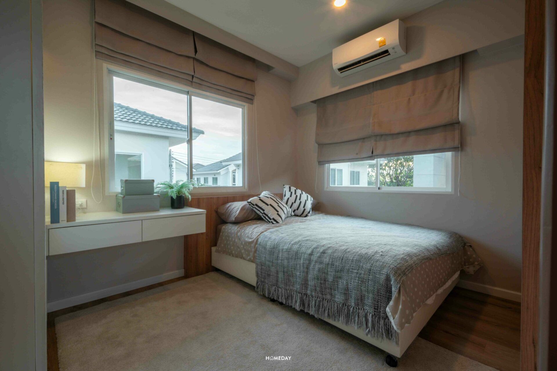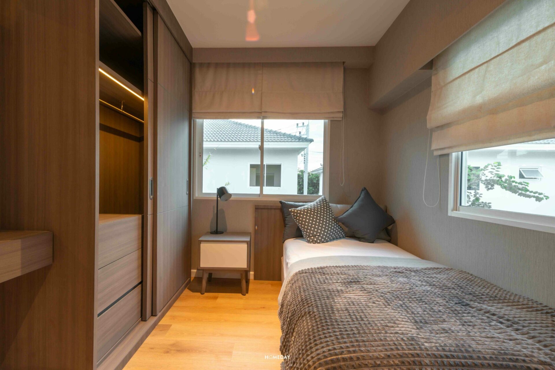 มาชม Bedroom 2 กันต่อเลย ห้องนี้ภายในวางเป็นเตียงขนาด 3.5 ฟุตจะกำลังดีเลยค่ะ ด้านข้างเหลือพื้นที่ใช้งานค่อนข้างกว้างเลย บ้านตัวอย่างตกแต่งให้ดูเป็นตู้เสื้อผ้าบิลต์อินเต็มความสูงของห้อง พร้อมโต๊ะอเนกประสงค์ ด้านข้างติดกับทางเข้ายังมีพื้นที่เหลือให้ใช้งานอยู่เลย ส่วนช่องแสงของห้องนี้ ก็แน่นอนว่าได้มา 2 ด้านเช่นเคย เปิดรับแสงเพิ่มความโปร่งให้กับห้องได้ในเวลากลางวันค่ะ