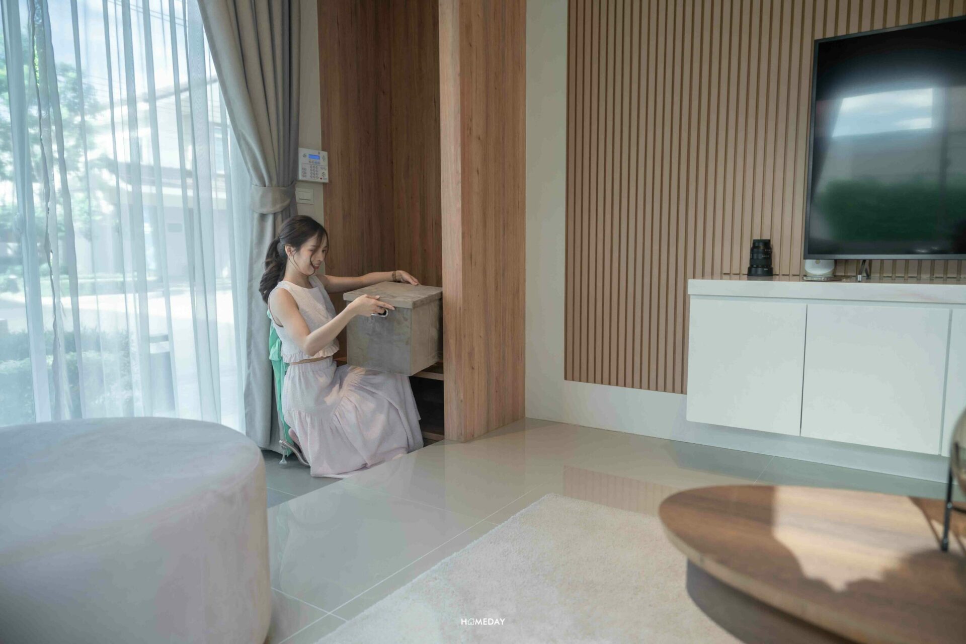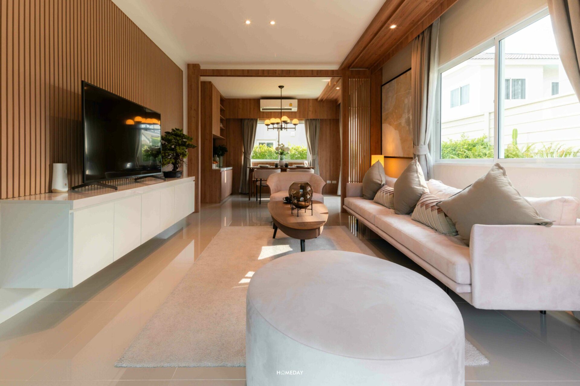 สำหรับ Living Area พื้นที่ห่างระหว่างโซฟาและทีวี ถือว่าดีมาก ๆ เลยค่ะ ด้วยระยะประมาณนี้ เราสามารถเลือกทีวีไซซ์ใหญ่ได้เลยโดยไม่ต้องกังวลว่าระยะการรับชมจะใกล้จนเกินไป และด้วยระยะห่างที่ค่อนข้างกว้าง ทำให้เราสามารถวางโต๊ะกลางและโซฟาแบบ L-Shape ได้เลย
