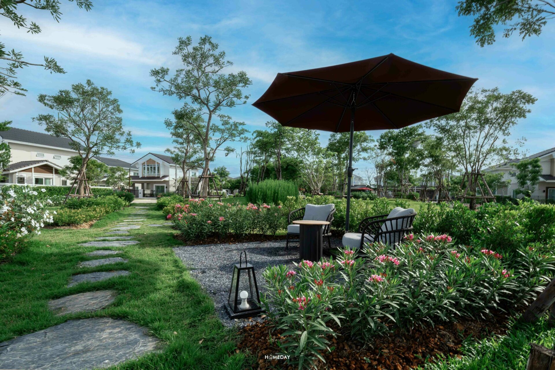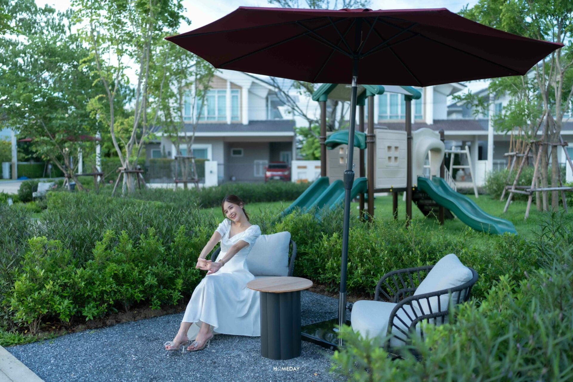 พักผ่อนให้สดชื่นได้ในทุกวัน ด้วยมุมนั่งเล่นพร้อมร่มและโต๊ะข้าง