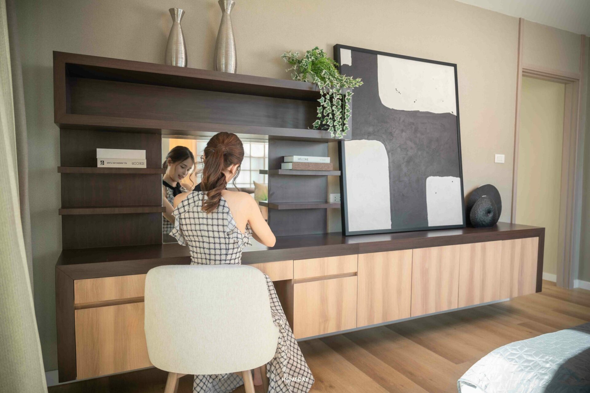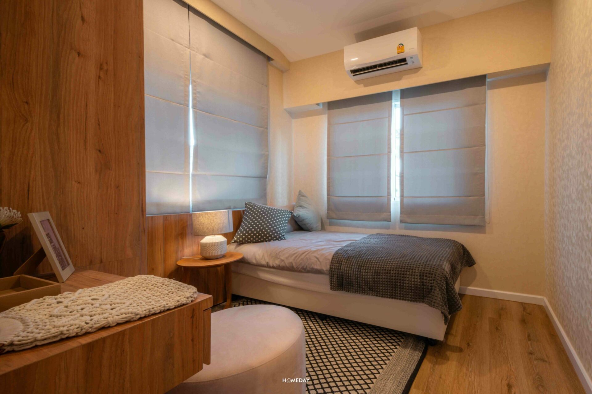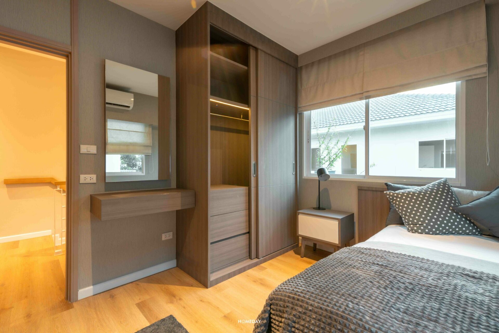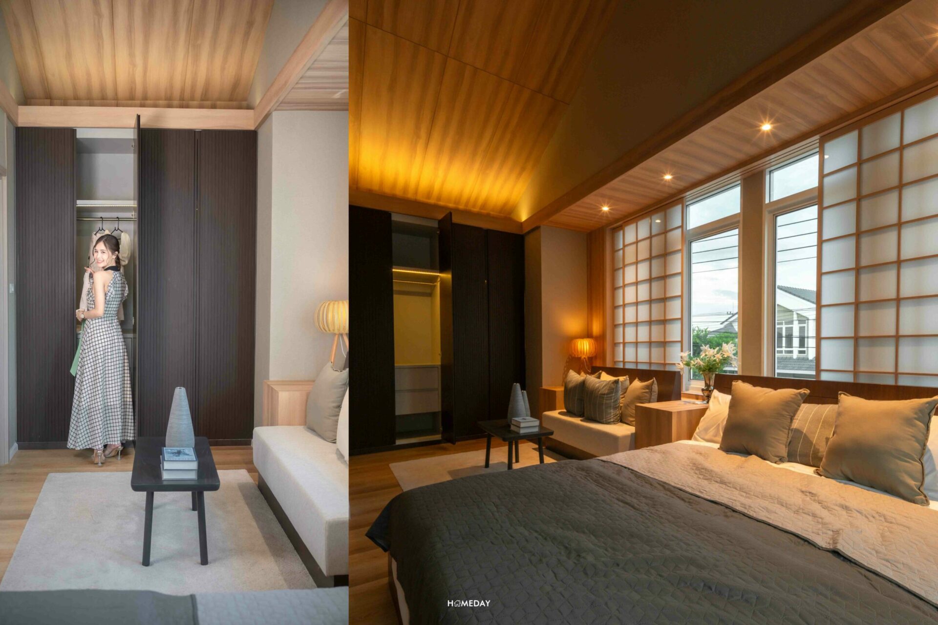 พื้นที่ข้างเตียง สามารถวางโต๊ะหัวเตียง, ตู้เสื้อผ้า และโต๊ะเครื่องแป้งได้แบบพอดิบพอดี ลงตัวมาก ๆ ซึ่งเราสามารถนำไอเดียการตกแต่งห้องของบ้านตัวอย่างไปปรับใช้ได้เลยนะคะ รับรองว่าได้บ้านที่มีกลิ่นอายสไตล์ญี่ปุ่น ที่ดูอบอุ่น Cozy อย่างแน่นอน