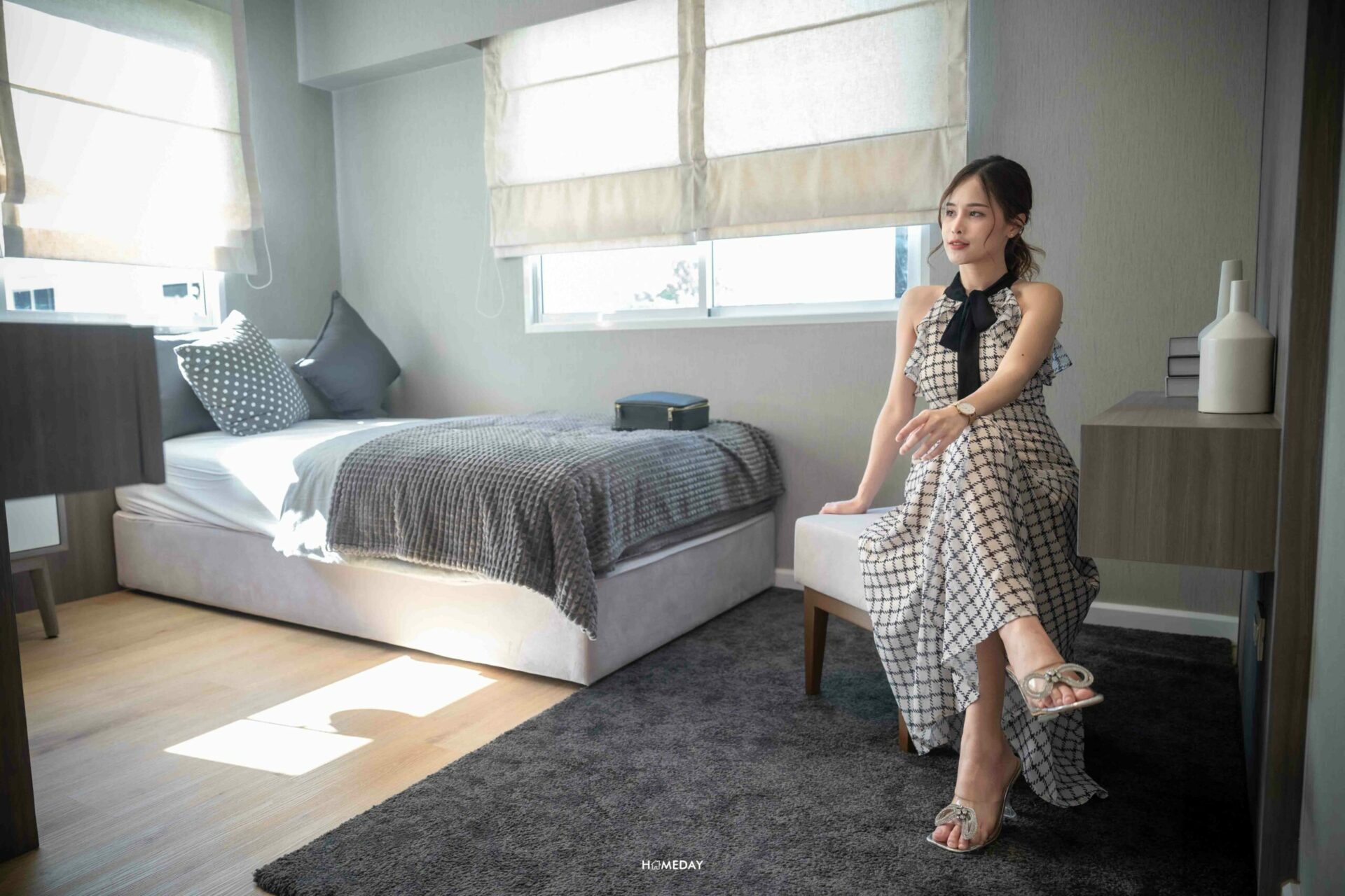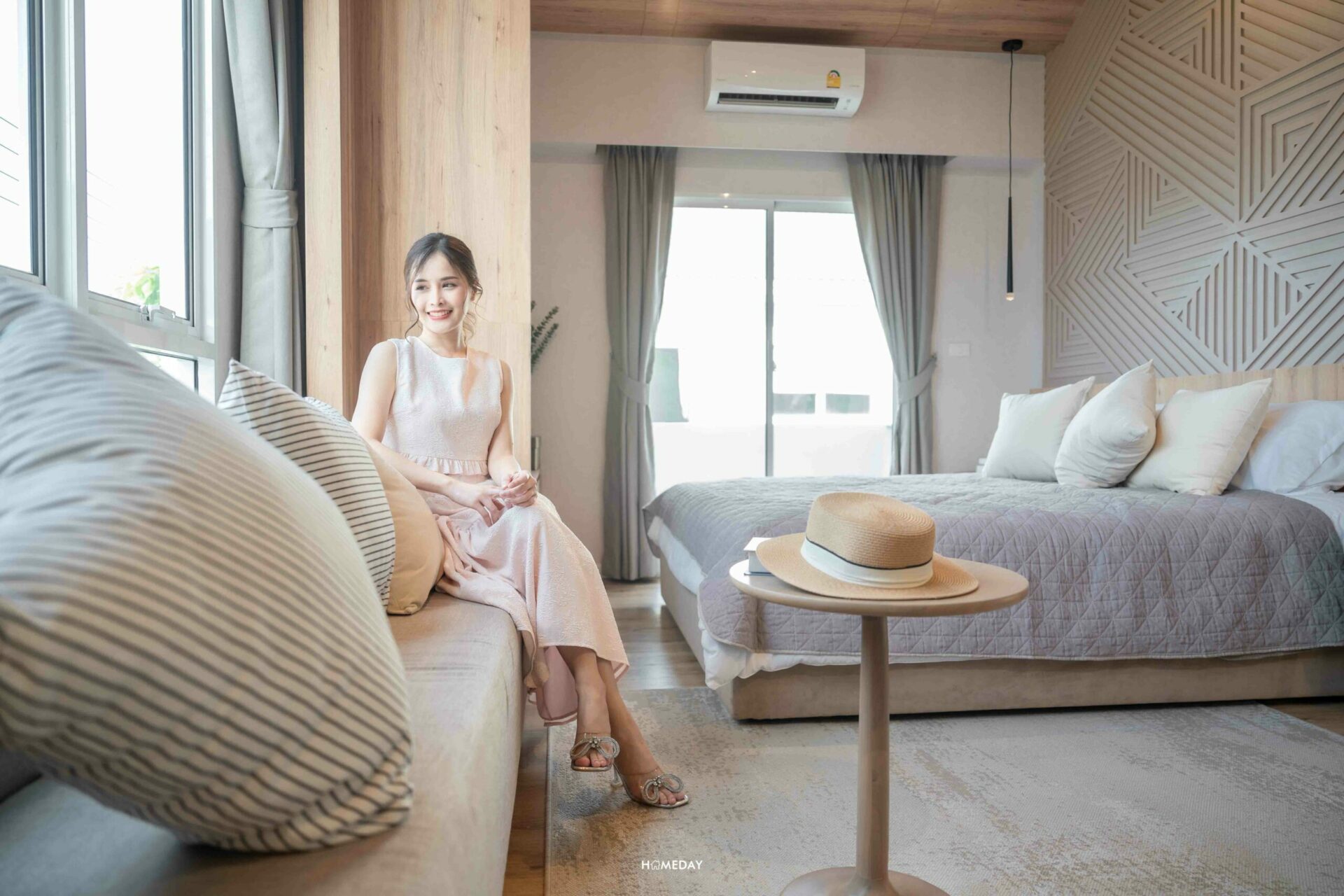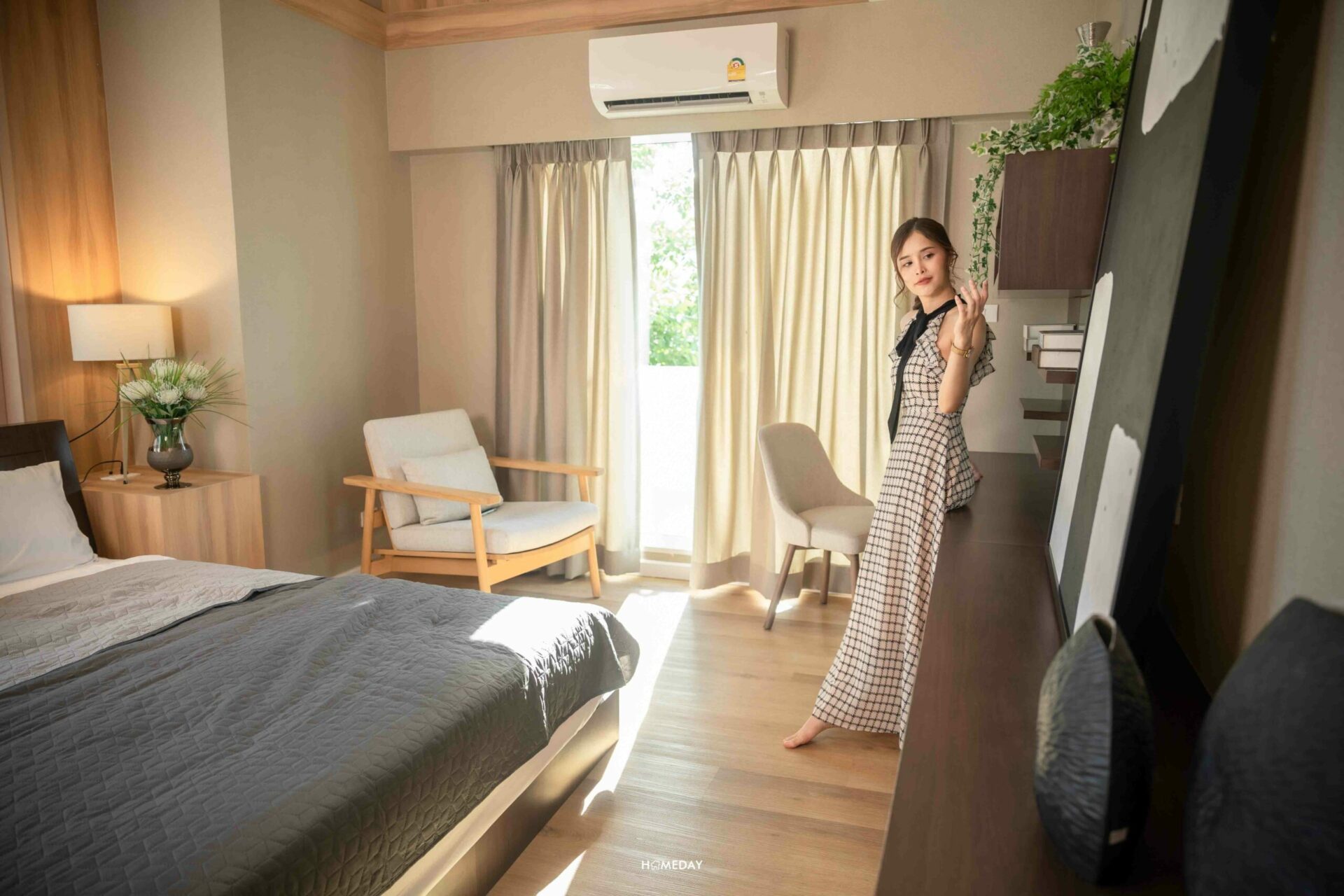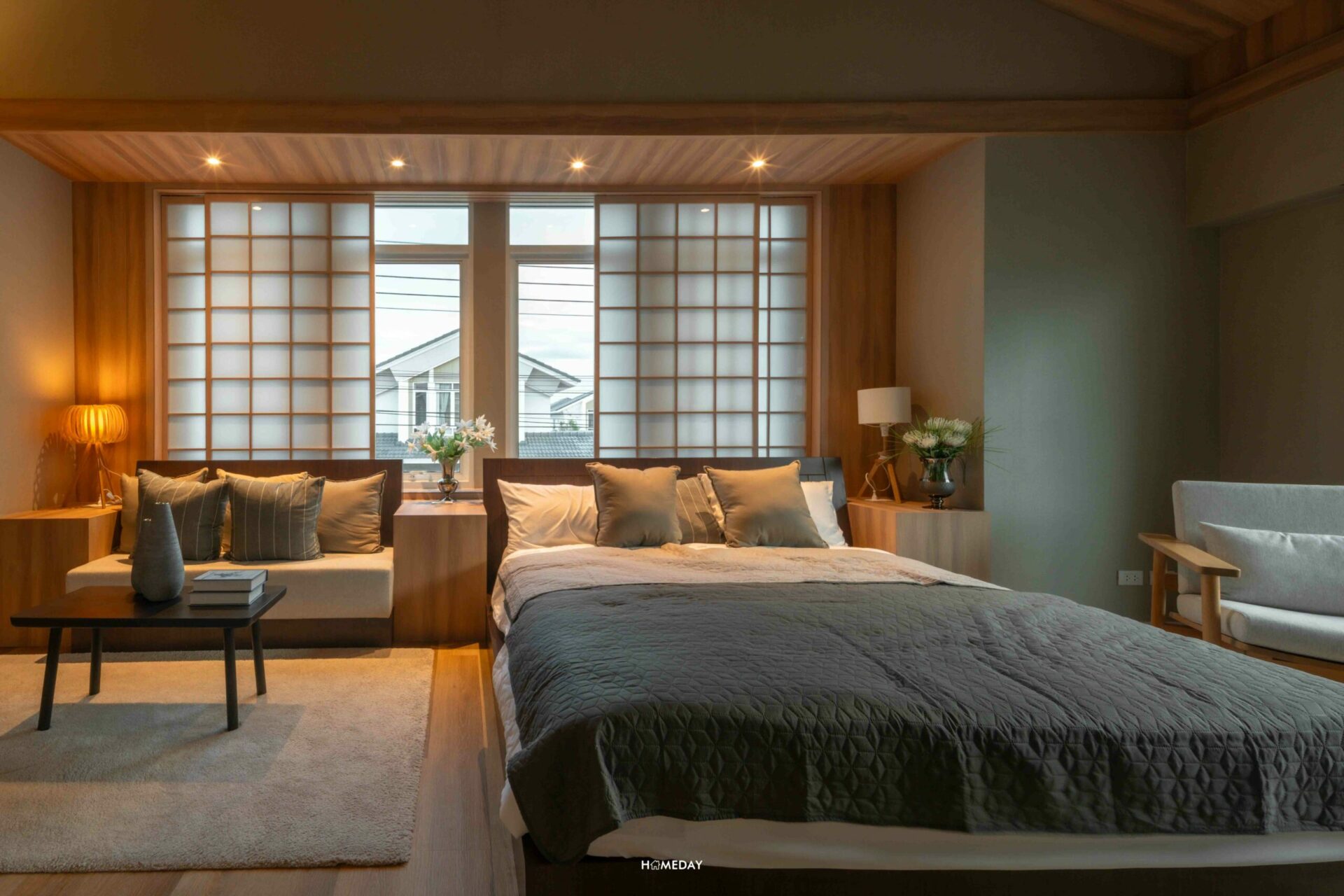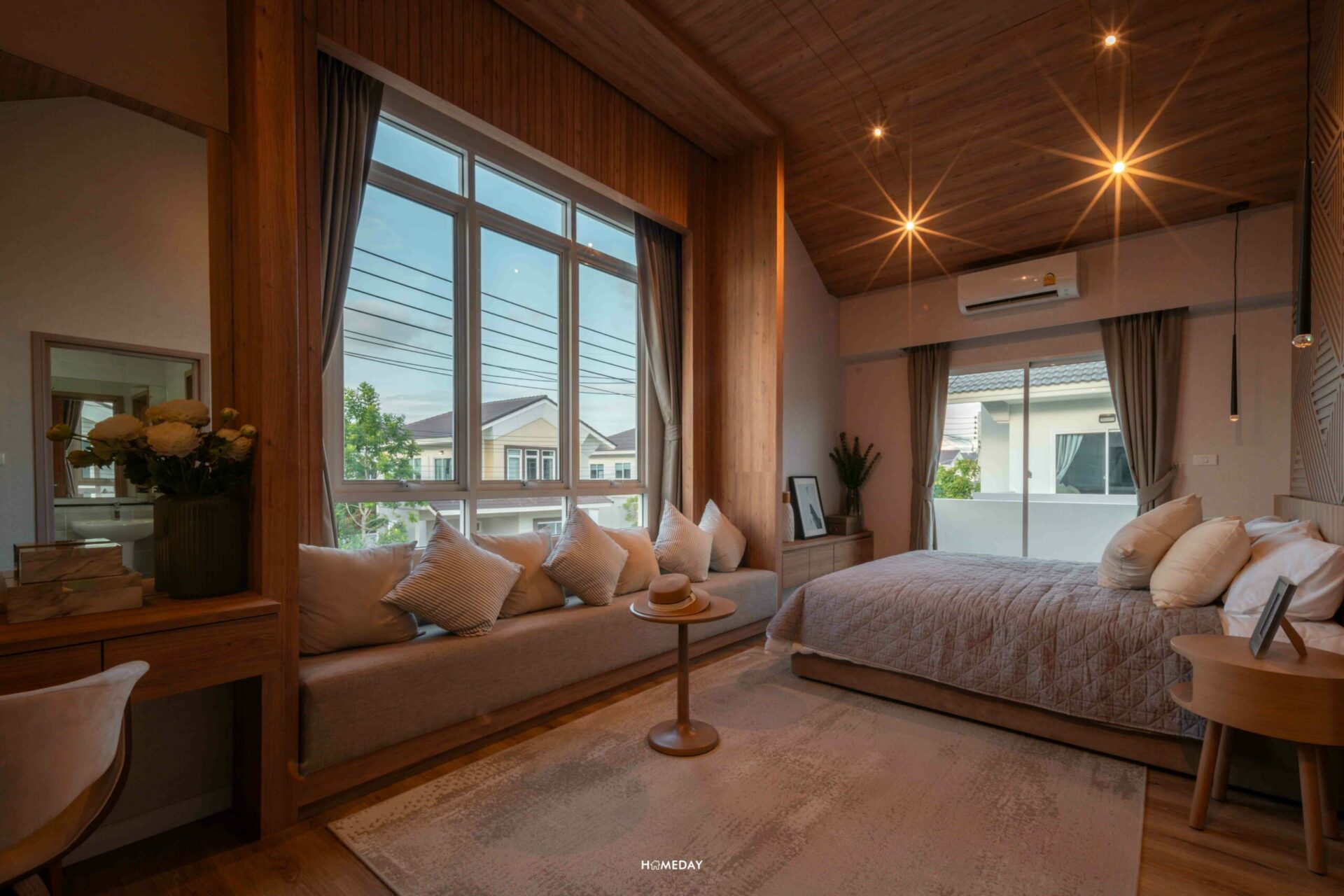 ส่วนพื้นที่พักผ่อน จะอยู่ทางด้านขวา ช่องแสงได้มาใหญ่จุใจตามที่เห็นเลยค่ะ ระเบียงที่อยู่ข้างเตียง สามารถเปิดออกรับลมได้ด้วยนะคะ เตียงก็แน่นอนว่าวาง King size ได้สบาย ๆ เหลือพื้นที่รอบ ๆ ให้ใช้งานอีกเพียบเลย อย่างบ้านตัวอย่างก็วางเป็นโต๊ะหัวเตียง, ตู้เก็บของ และม้านั่งตัวยาวพร้อมโต๊ะข้างเอาไว้ให้ดูเป็นแนวทาง บ้านจริงเราสามารถปรับฟังก์ชันการใช้งานเองได้ตามใจเลยค่ะ