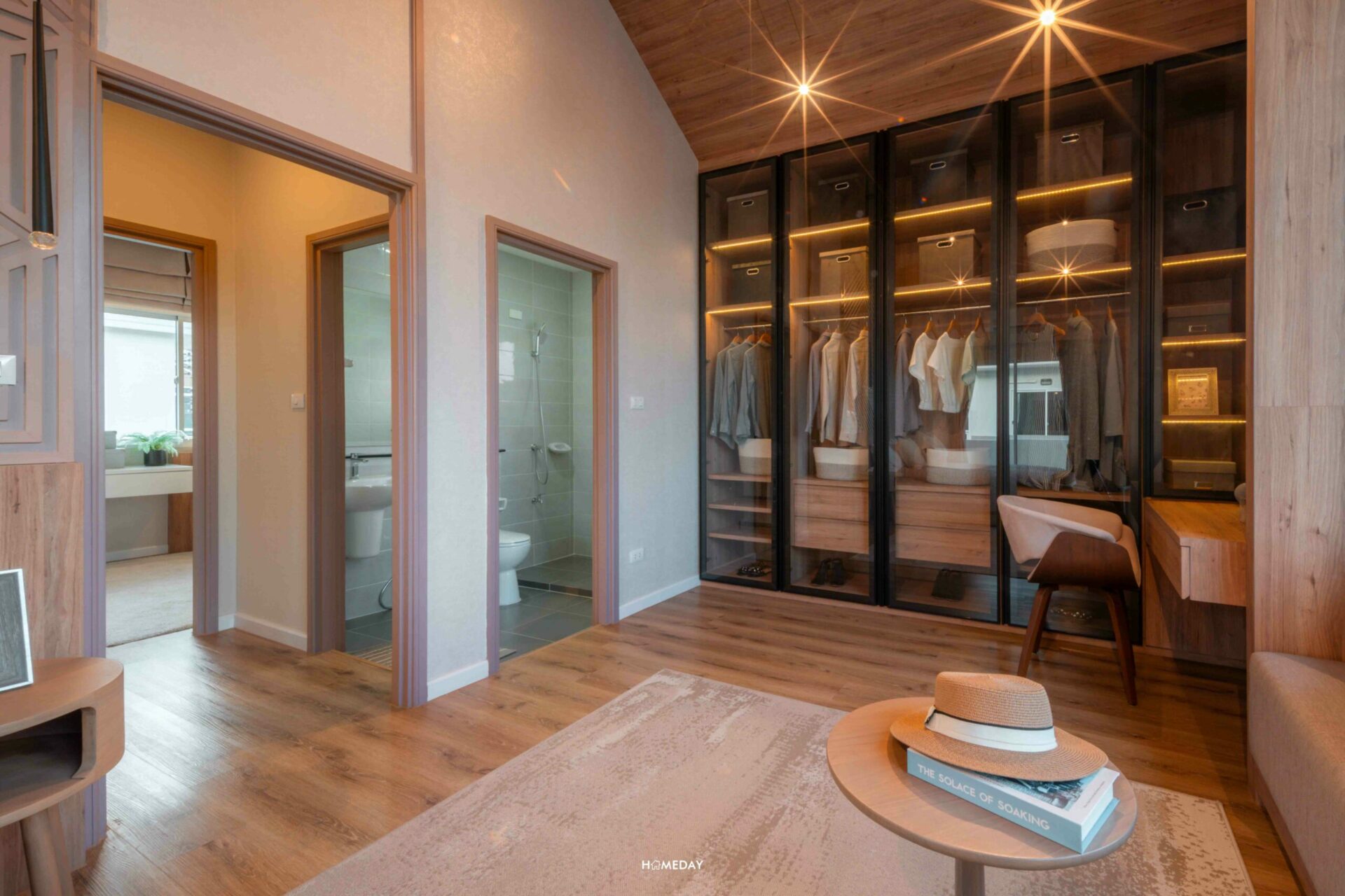 มาดูที่พื้นที่ใช้งานอีกฝั่งกันบ้าง ตรงนี้เราสามารถบิลต์อิน Walk-in Closet ตามแบบบ้านตัวอย่างได้เลยนะคะ ติดกันซ้ายมือก็จะเป็นห้องน้ำภายในของ Master Bedroom ส่วนพื้นที่ด้านหน้าห้องน้ำตรงนี้ ทางโครงการทำเป็นโซฟาขนาดกำลังดี เป็นพื้นที่พักผ่อนอีกจุด ซึ่งเราสามารถปรับใช้งานพื้นที่ให้เหมาะสมตามความชอบของเราได้เลย