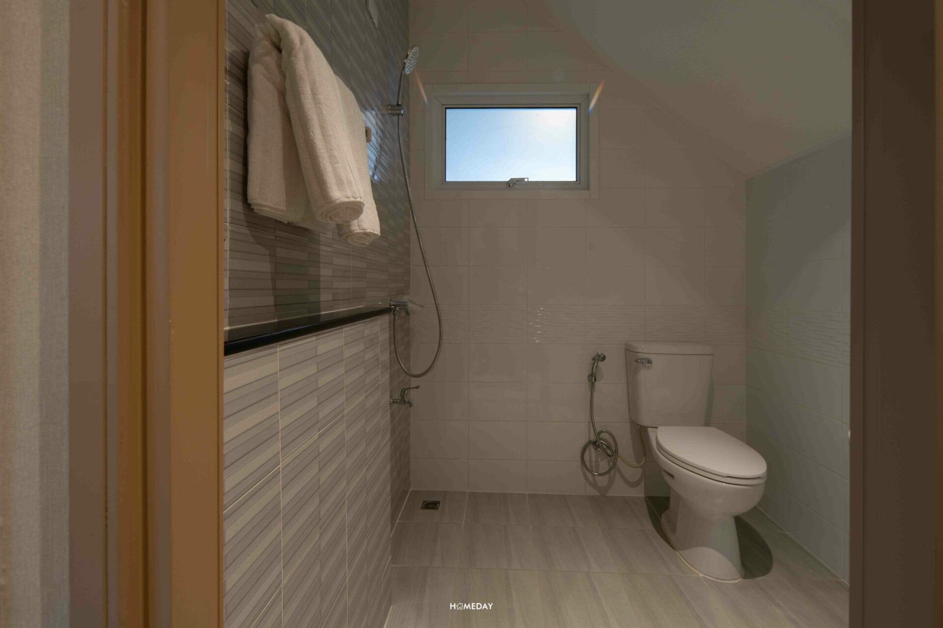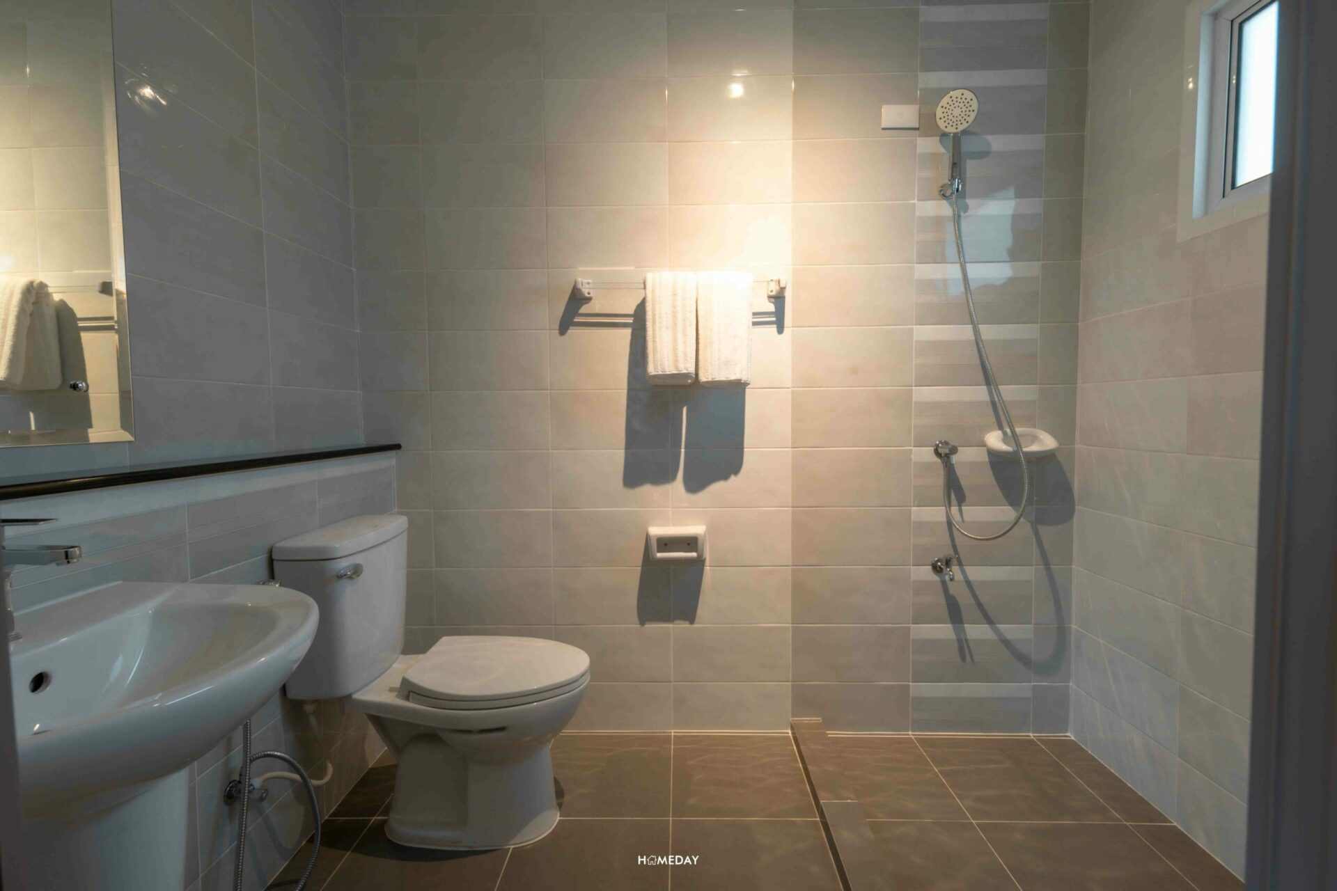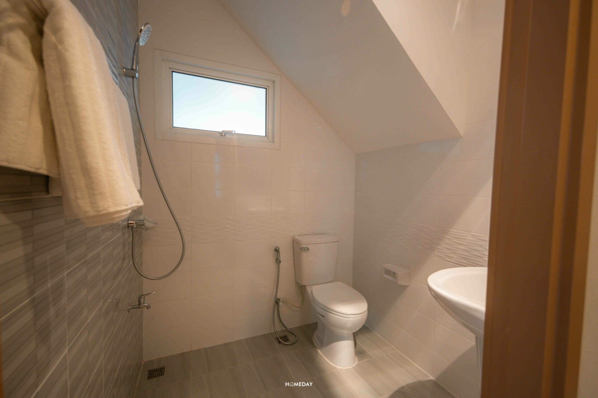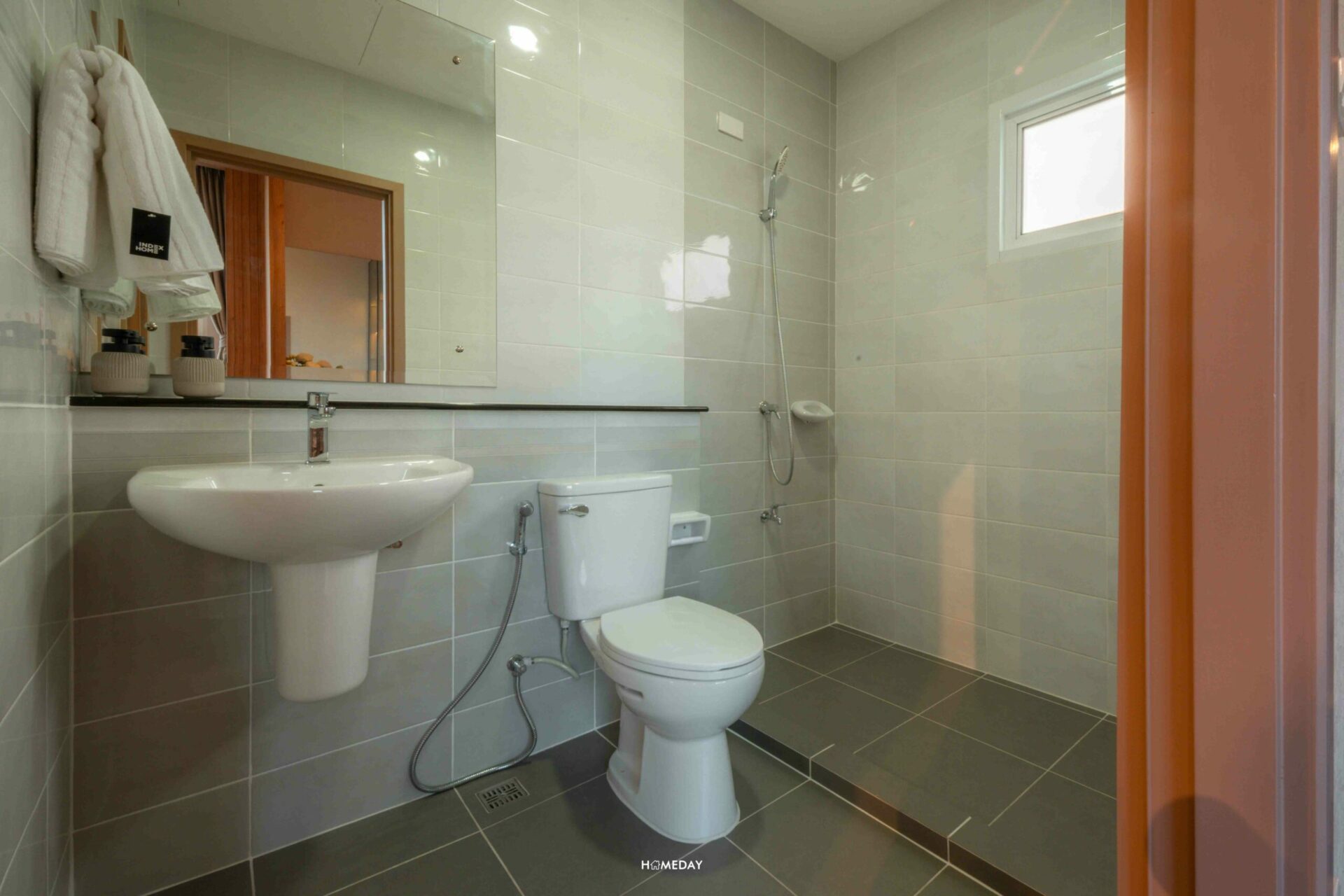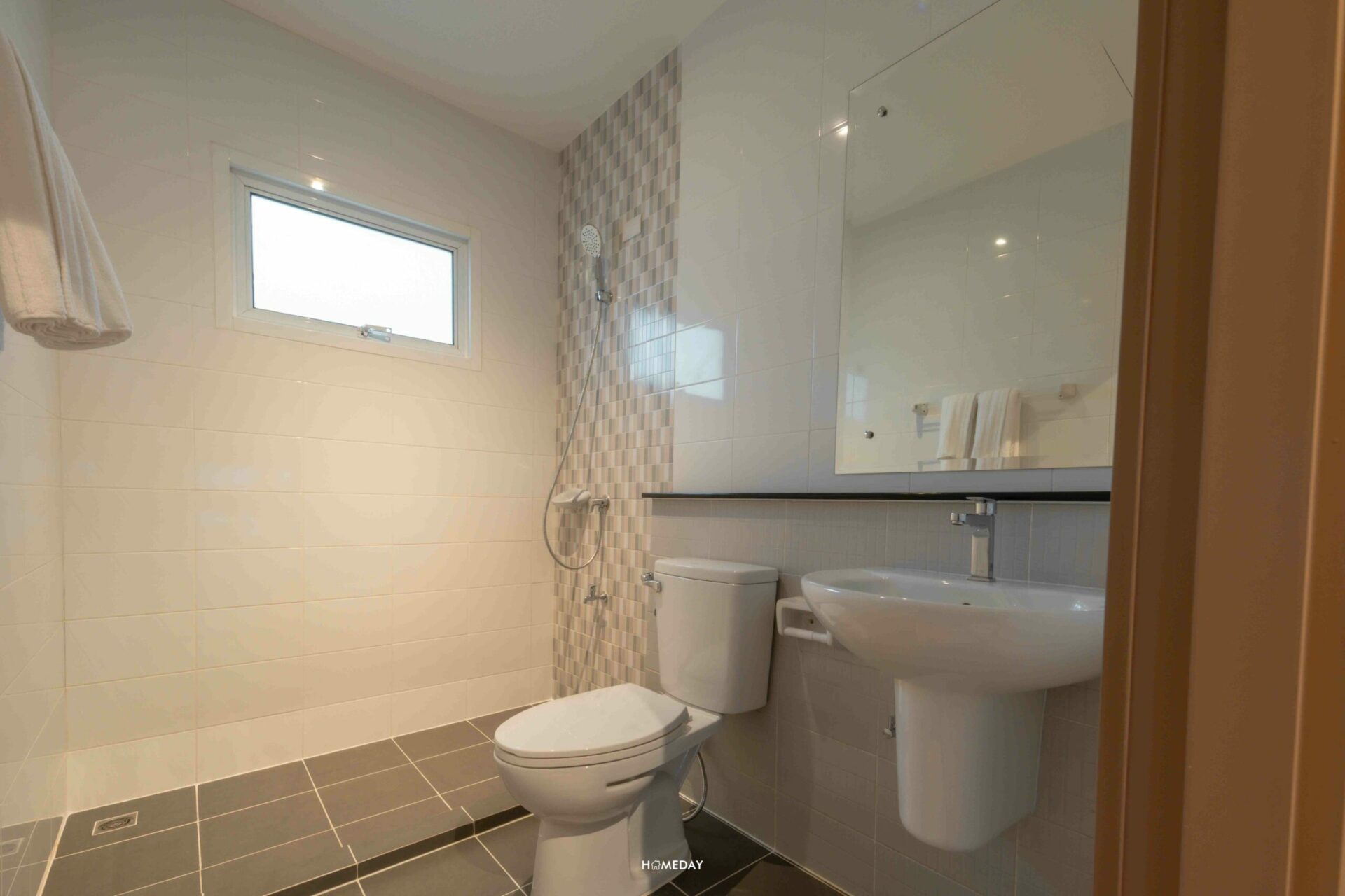 ห้องน้ำชั้น 1 จะอยู่ตรงข้ามกับครัวค่ะ พื้นที่ด้านในขนาดกำลังพอดี ใส่ชุดสุขภัณฑ์พื้นฐานมาให้เราครบเลย จากทางเข้า ซ้ายมือจะเป็น Low Wall สำหรับวางของเล็ก ๆ น้อย ๆ มีราวแขวนผ้าขนหนูอยู่ที่ด้านบน ถัดเข้าไปด้านในก็จะเป็น Hand Shower พร้อมก๊อกน้ำที่ด้านล่าง ขวามือเป็นโถสุขภัณฑ์พร้อมสายชำระ และตรงข้ามกัน ขวามือติดกับประตูทางเข้า จะเป็นอ่างล้างหน้าพร้อมบานกระจกนั่นเองค่ะ