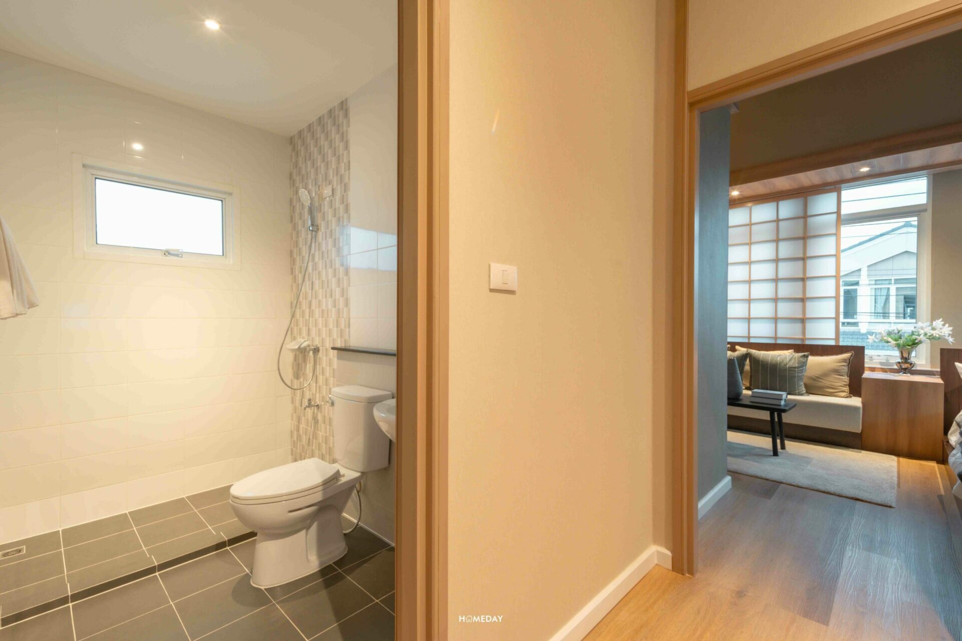 Master Bathroom ภายในแบ่งโซนการใช้งานเปียกแห้งเอาไว้ให้อย่างเป็นสัดส่วน ซ้ายมือจากทางเข้าจะเป็นพื้นที่ส่วนแห้ง ประกอบไปด้วยอ่างล้างหน้า, บานกระจกเงา, โถสุขภัณฑ์, สายชำระ, ที่ใส่ทิชชู่ม้วน, ราวแขวนผ้าขนหนู พร้อม Low Wall สำหรับวางของค่ะ ส่วนขวามือพื้นที่ส่วนเปียก ได้ Hand Shower, ก๊อกน้ำ และที่วางสบู่มาให้ค่ะ บ้านจริงเราสามารถบิลต์อิน Partition เพิ่มเติมเองได้เลยค่ะ