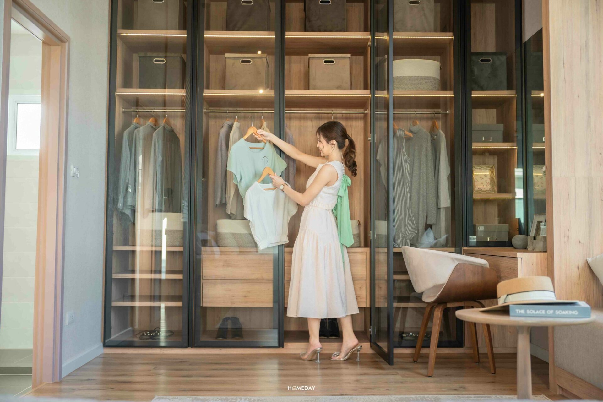 เนื่องจากอยู่ด้านหน้าห้องน้ำ จะช่วยให้เราสามารถหยิบเสื้อผ้า ใช้งานได้สะดวก รวมไปถึงสามารถวางโต๊ะเครื่องแป้งที่บริเวณนี้ได้อีกด้วย บอกเลยว่าถ้าบิลต์อินตู้เสื้อผ้าเต็มความสูงของเพดาน จะมีพื้นที่จัดเก็บค่อนข้างเยอะเลยล่ะค่ะ เพราะห้อง Master Bedroom นั้น ได้เพดานที่สูงเป็นพิเศษ