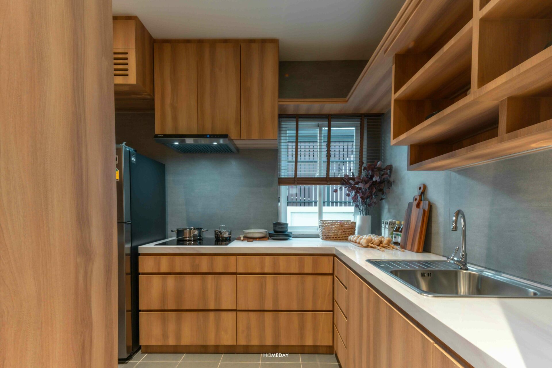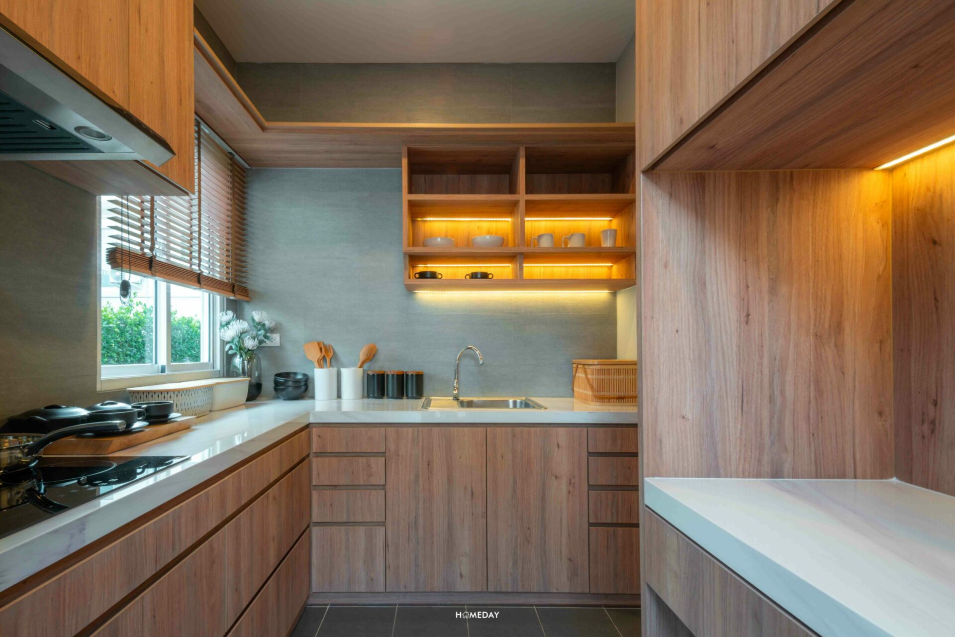 ครัวของทางโครงการทุกแบบบ้าน จะออกแบบครัวให้เป็นครัวปิดทั้งหมดค่ะ ดังนั้นจึงไม่ต้องกังวลว่ากลิ่นจะไปรบกวนพื้นที่พักผ่อนด้านนอกเลยค่ะ ห้องครัวบ้านจริงจะได้เป็นห้องเปล่าที่เดินระบบมาให้ครบแล้ว ซึ่งเราสามารถนำไอเดียการออกแบบบิลต์อินของทางบ้านตัวอย่างไปปรับใช้ได้เลยนะคะ จะเห็นได้เลยว่าเรามีพื้นที่เพียงพอสำหรับเคาน์เตอร์ครัว L-Shape และสามารถแขวนบานตู้เก็บของและชั้นวางของได้ค่อนข้างเยอะเลย