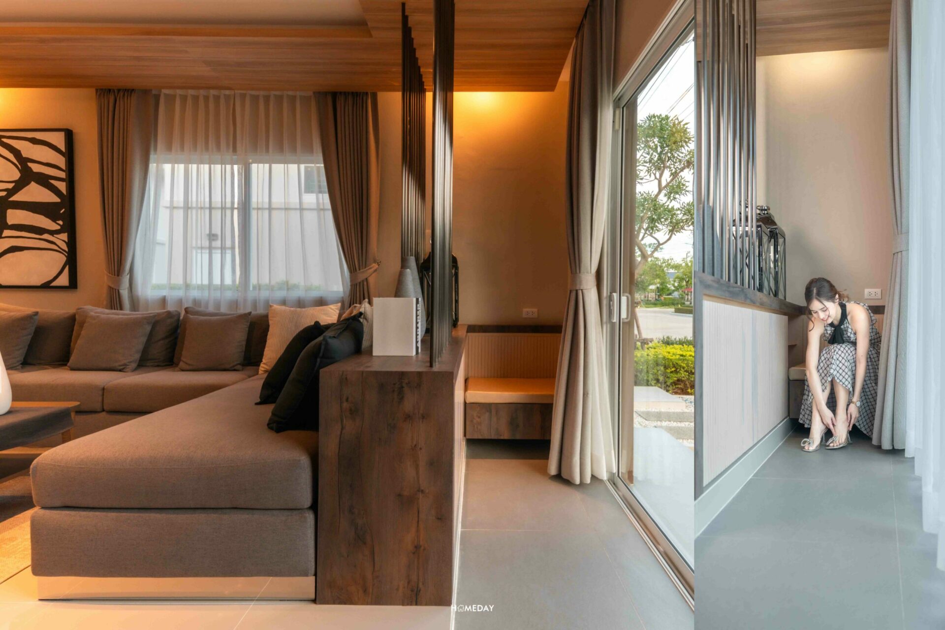 พาเปิดบ้านสวย Lucerne ให้ได้ชมกันค่ะ ตัวบ้านดีไซน์ในสไตล์ Modern ผสมผสานระหว่างความเป็นตะวันออก ไทย และญี่ปุ่น เข้าด้วยกัน ทางเข้าบ้านเป็นประตูกระจกใสบานเลื่อน รับแสงส่องเข้ามาภายในได้เป็นอย่างดี บริเวณพื้นที่ด้านหน้าติดทางเข้า ทางโครงการ Drop พื้นไล่ระดับเอาไว้ ซึ่งเราใส่ฟังก์ชันชั้นวางรองเท้าและวางม้านั่งสำหรับใส่รองเท้าได้เลยค่ะ