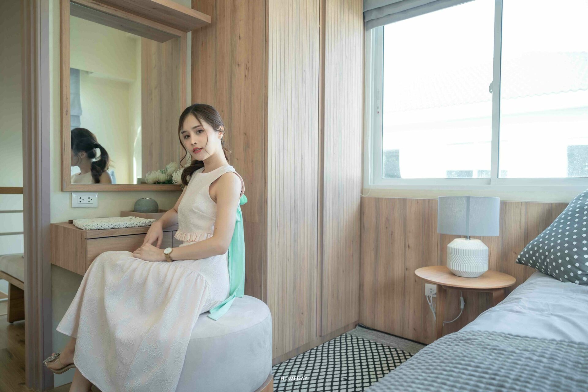 ด้านข้างเตียง สามารถวางได้ทั้งโต๊ะหัวเตียง, ตู้เสื้อผ้า และโต๊ะเครื่องแป้งเลยนะคะ ทางโครงการตกแต่งเอาไว้ให้ดูเป็นตัวอย่างสวยงามมาก ๆ บ้านจริงเราก็สามารถนำไอเดียนี้ไปปรับใช้ได้เลย