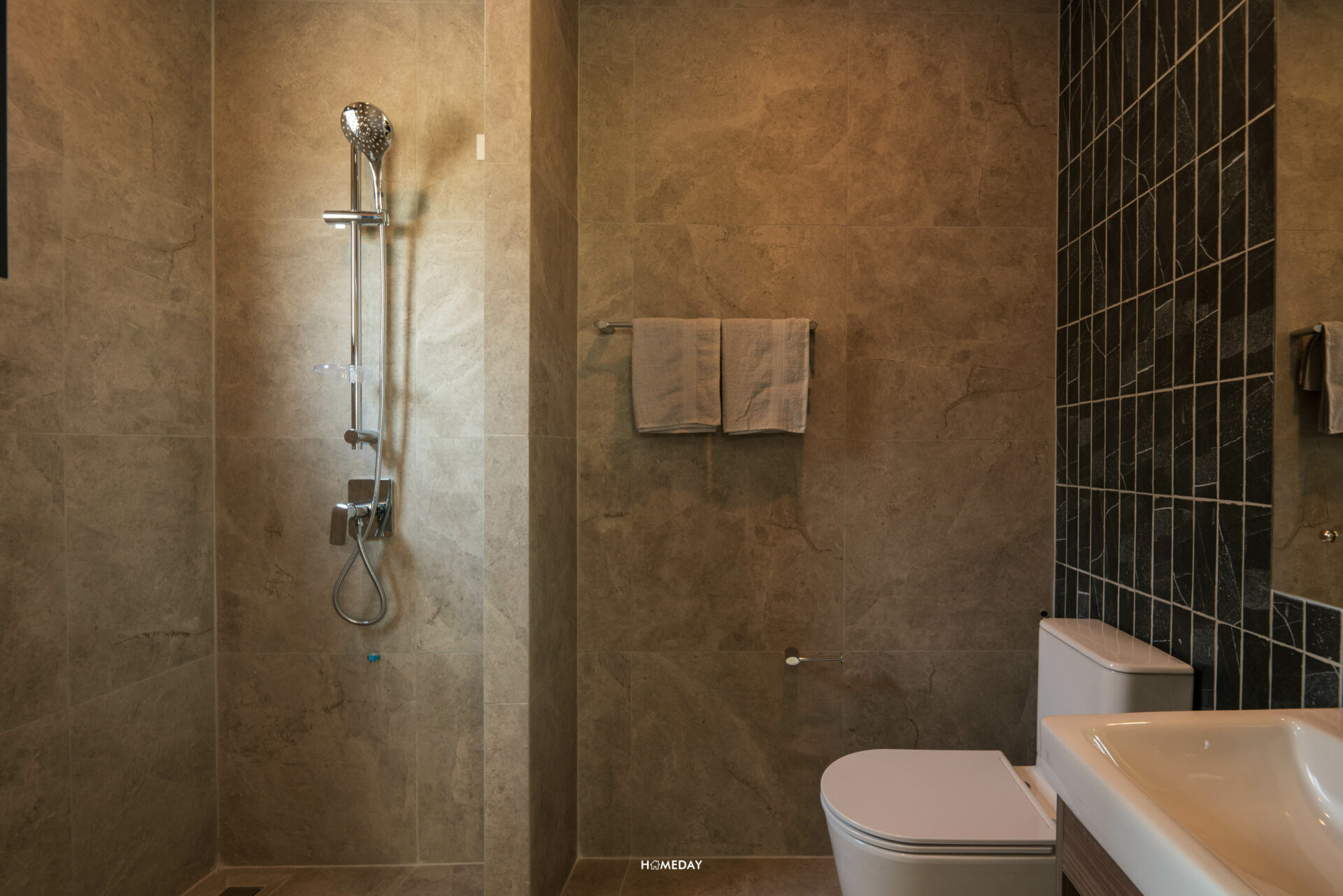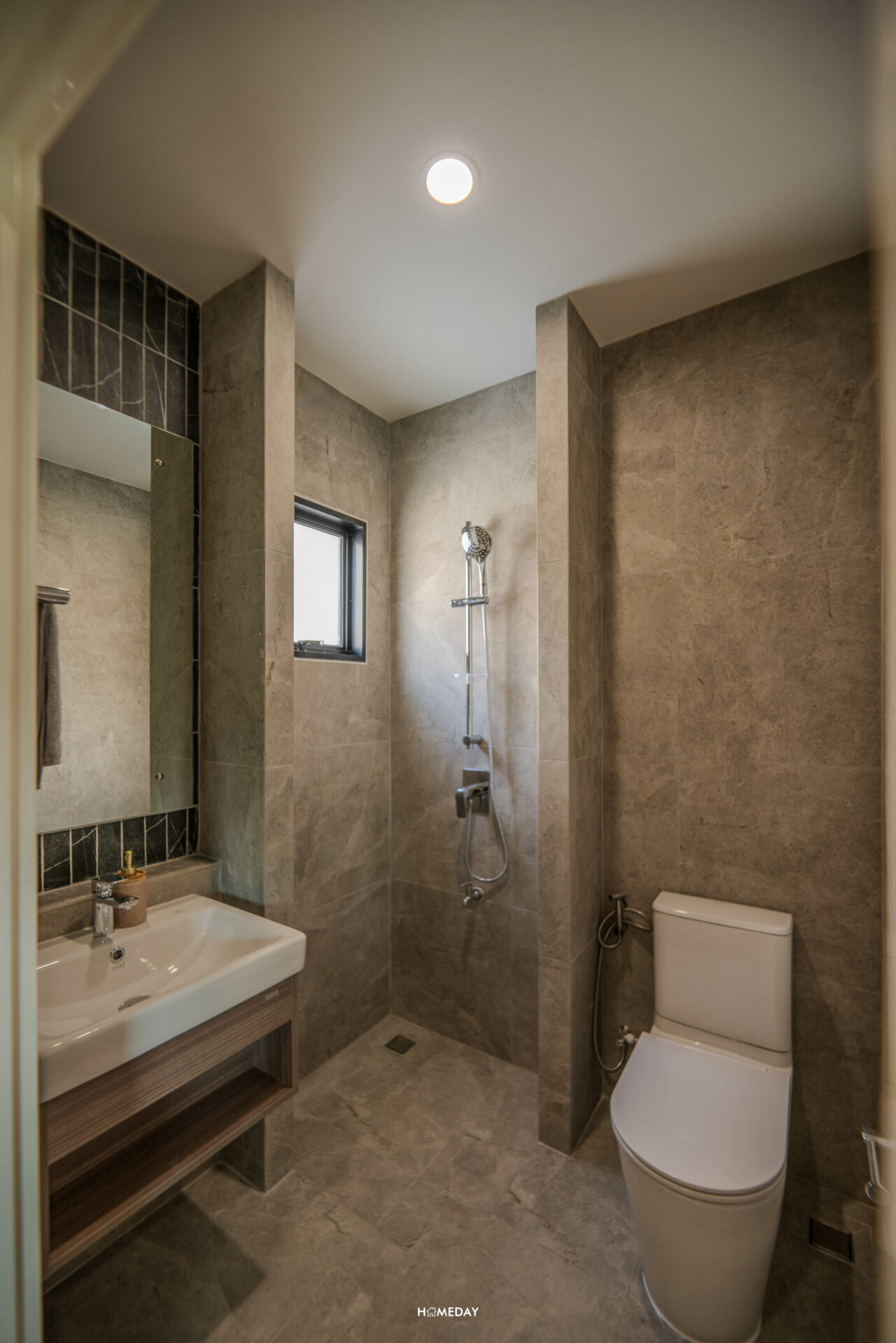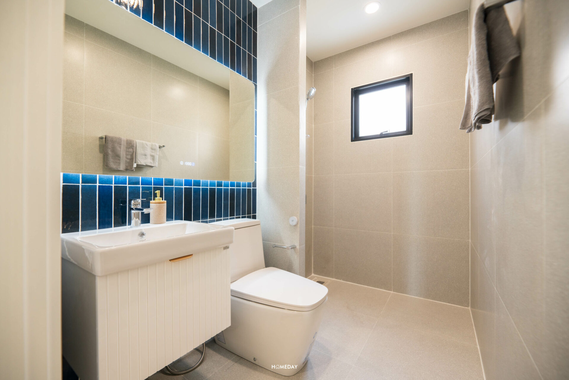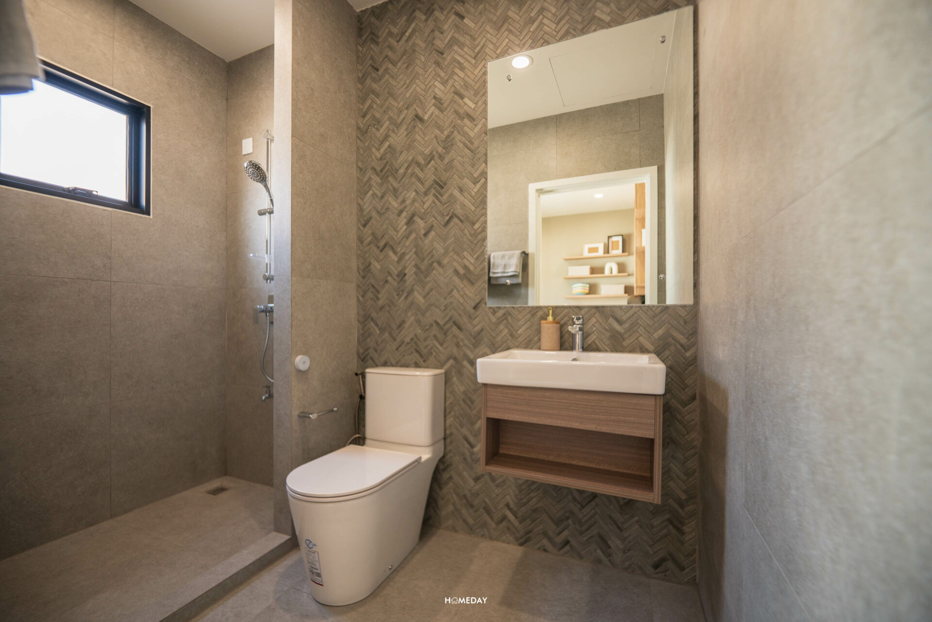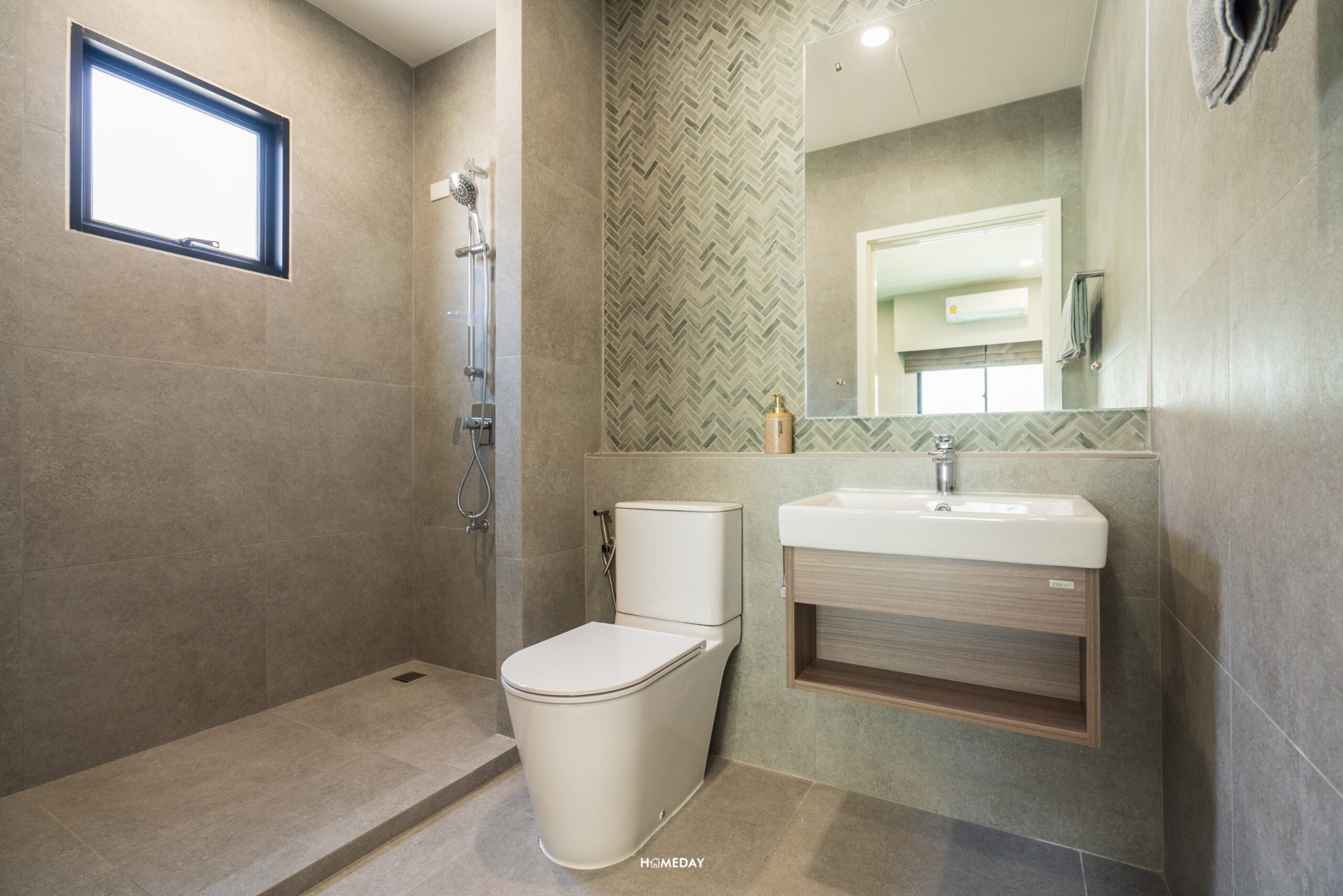 ห้องน้ำของ Bedroom 3 ภายในก็โอ่โถงไม่แพ้ขนาดห้องครับ ขวามือจากทางเข้าจะเป็นอ่างล้างหน้าพร้อมด้วยชั้นวางของด้านใต้ ติดกันเป็นโถสุขภัณฑ์ Touchless เหมือนเช่นเคย ผนังฝั่งนี้ได้ Low Wall ขนาดใหญ่ ใช้วางของเพิ่มเติมได้เลยครับ ฝั่งตรงข้ามเป็นมุม Shower ให้ Hand Shower มาพร้อมกับบ้านหน้าต่างระบายอากาศ หากอย่างใช้งานเป็นสัดส่วนก็สามารถบิลต์อิน Partition เพิ่มเติมได้ครับ