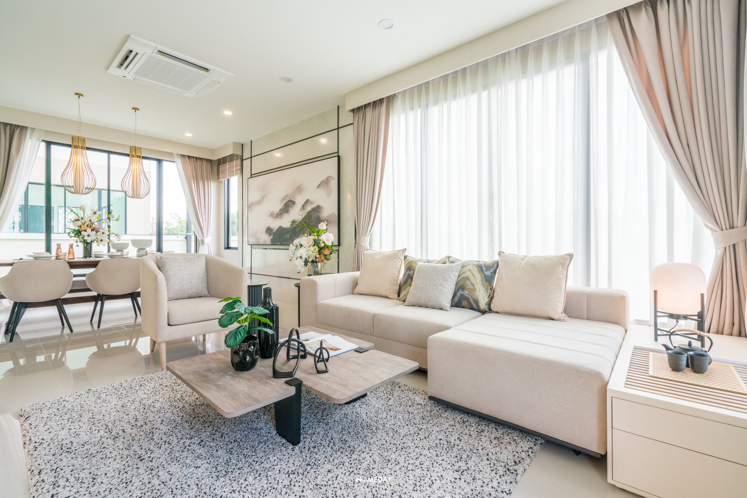 จากพื้นที่นั่งเล่น Living ด้านในสุดจะเป็นมุม Dining หน้ากว้างขนาดใหญ่ เชื่อมต่อกันแบบ Open Sapce ออกแบบดีไซน์ฟังก์ชันการใช้งานได้ตามชอบเลยครับ