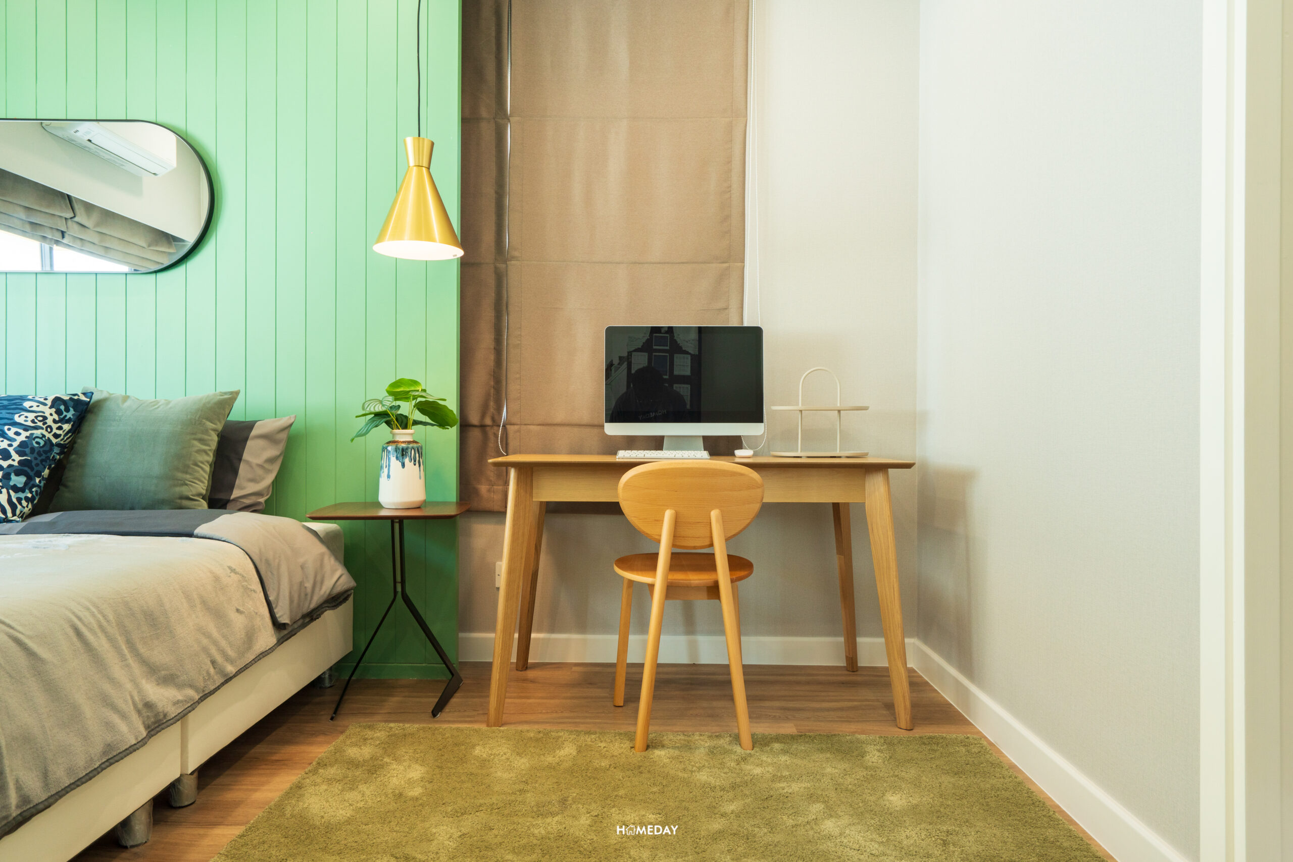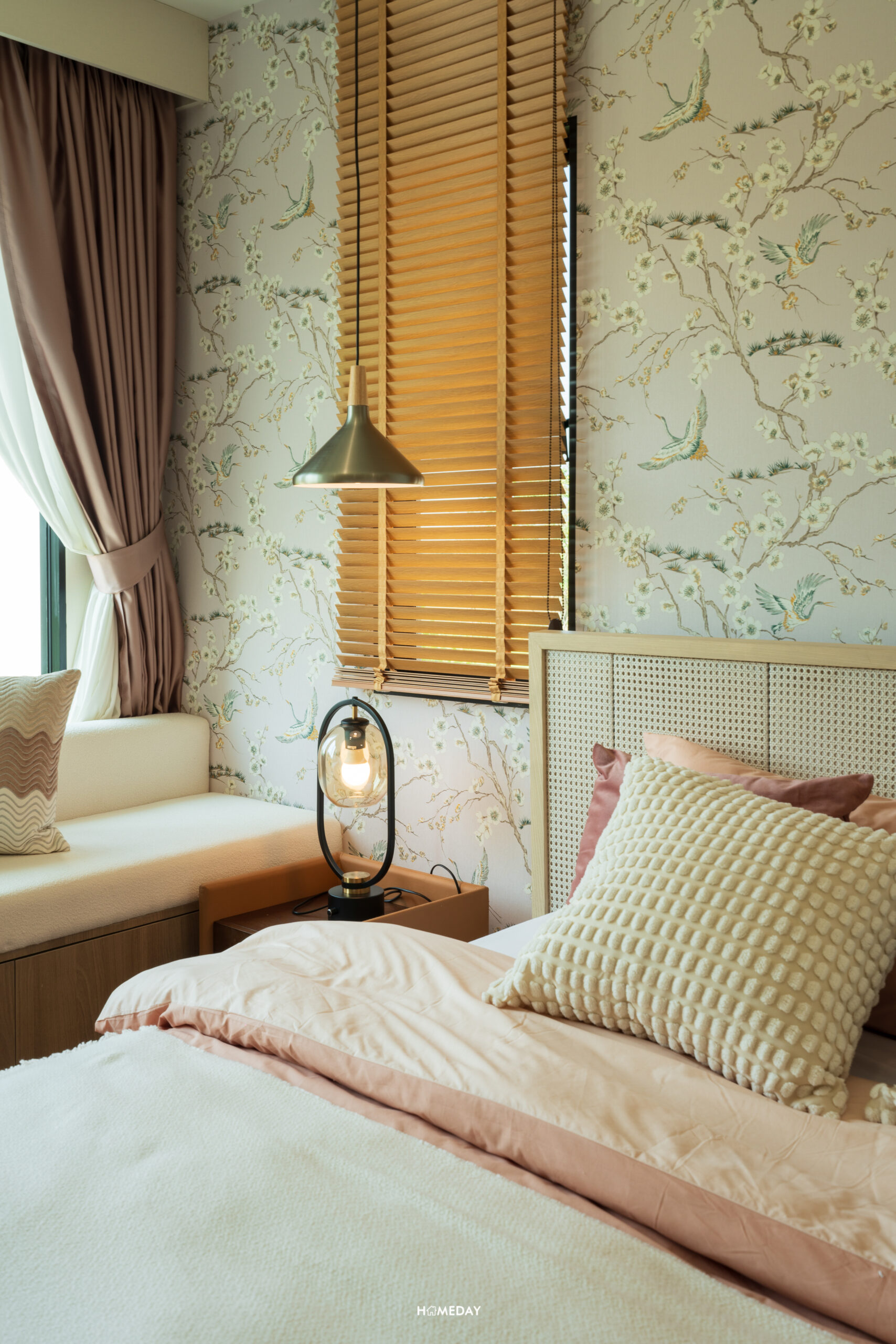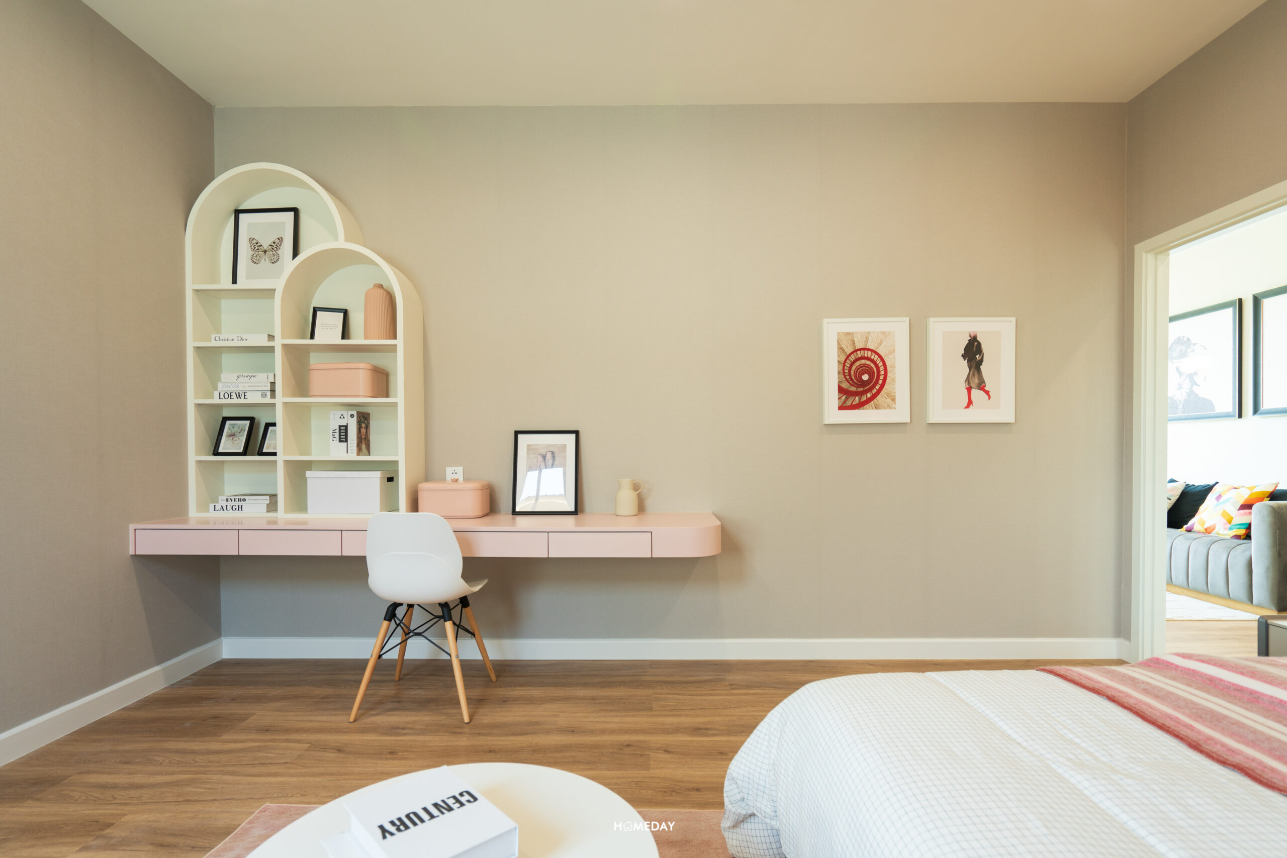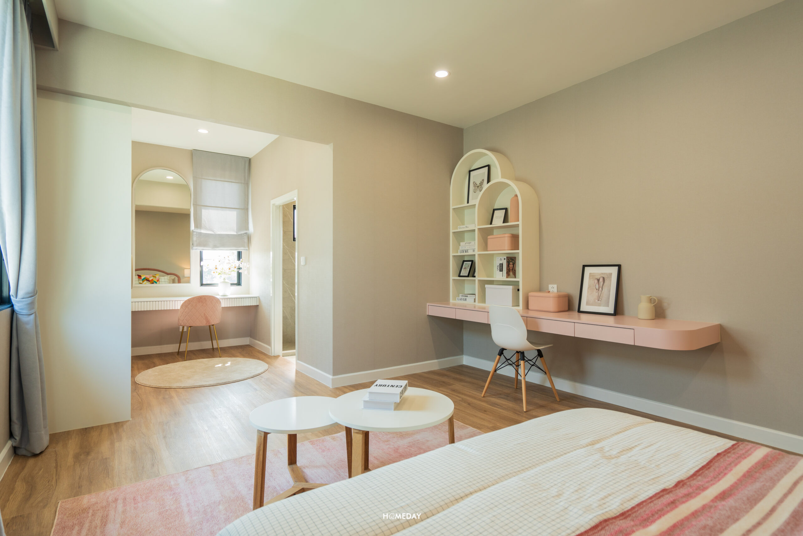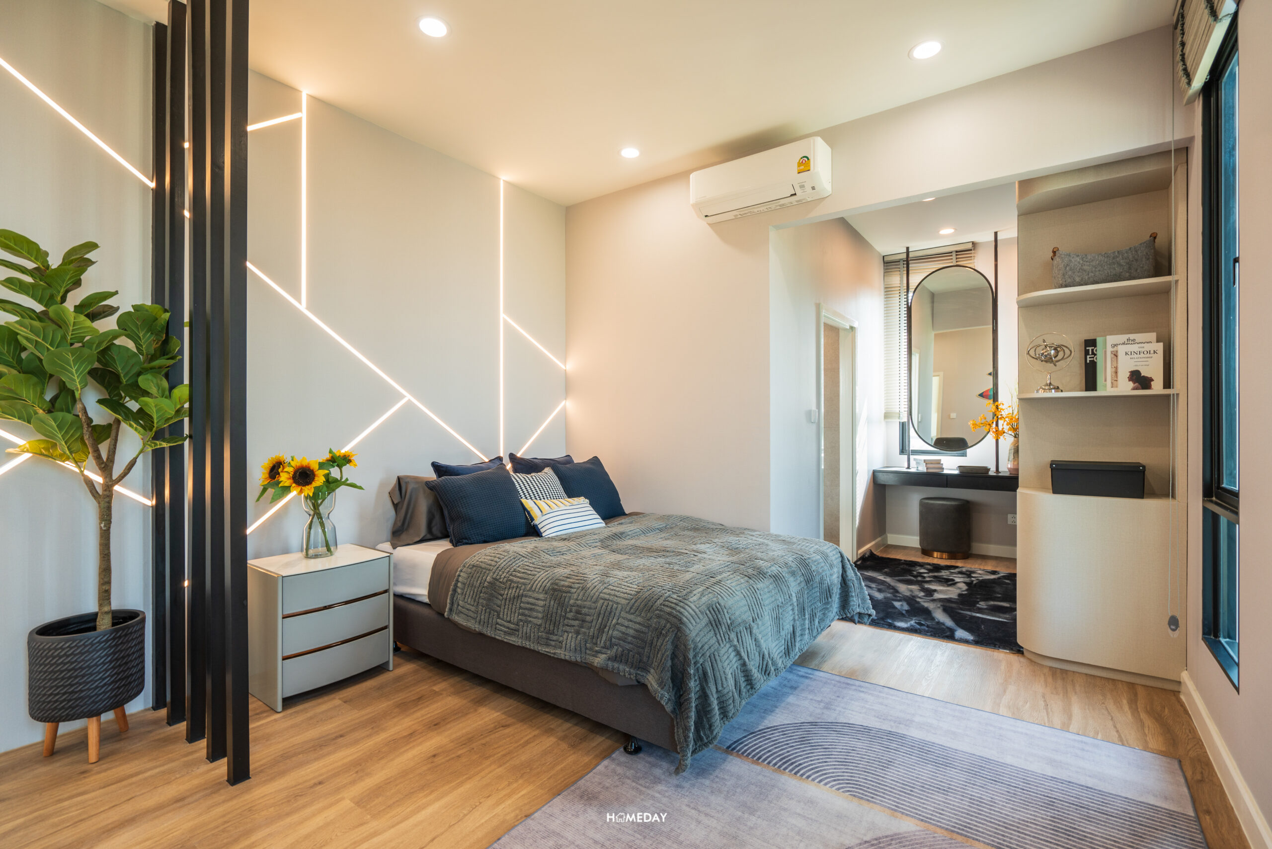 พื้นที่รอบเตียง สามารถใส่ฟังก์ชันครบ โต๊ะหัวเตียงขนาดใหญ่ วางได้ทั้ง 2 ฝั่ง ปลายเตียงก็สามารถบิลต์อินเป็นชั้นวางของหรือโต๊ะอเนกประสงค์ตัวยาวสำหรับวางทีวีและนั่งทำงานในตัวได้ แม้จะใส่ฟังก์ชันทั้งหมดนี้เข้าไปแล้ว ก็ยังเหลือพื้นที่อีกค่อนข้างมาก นอกจากจะคล่องตัวแล้ว ยังทำให้ห้องดูโปร่งโล่งมากยิ่งขึ้นอีกด้วย