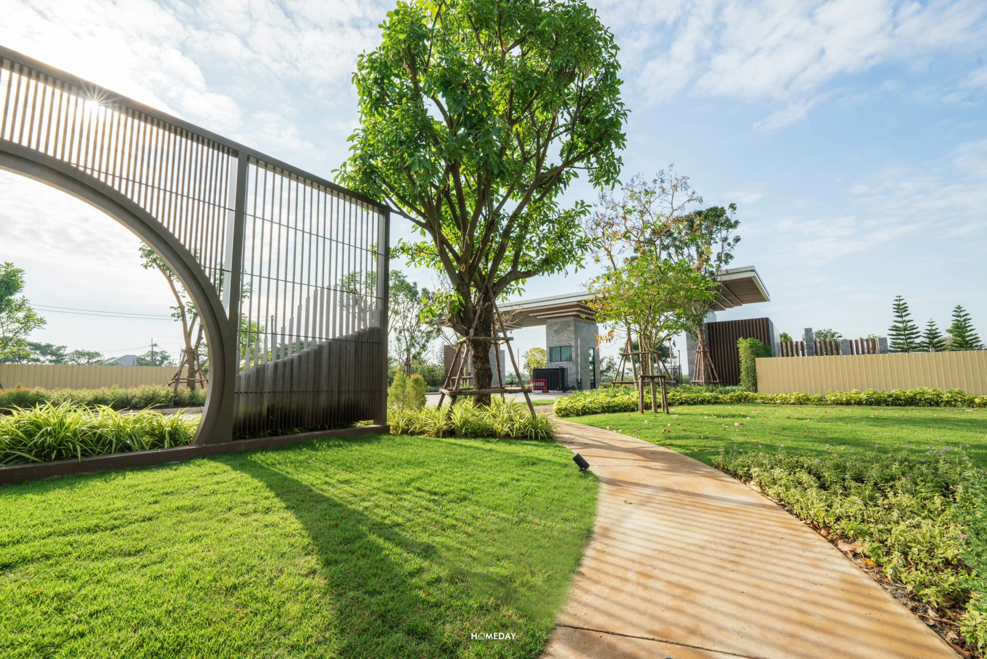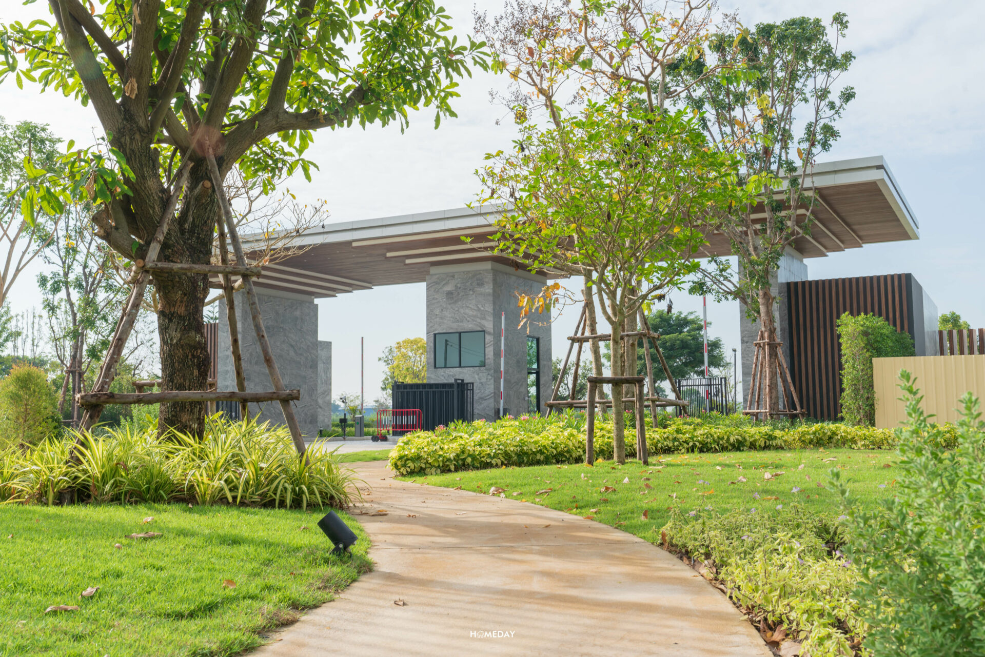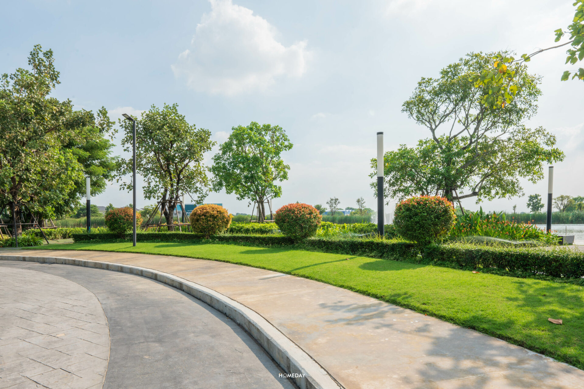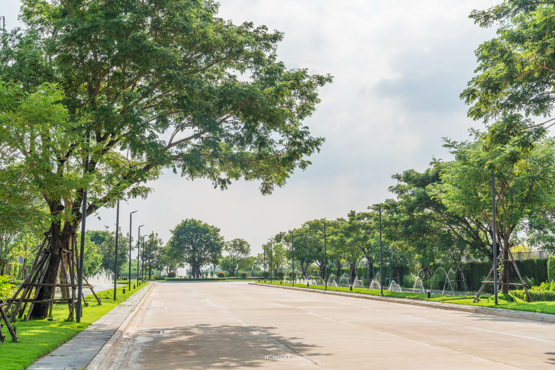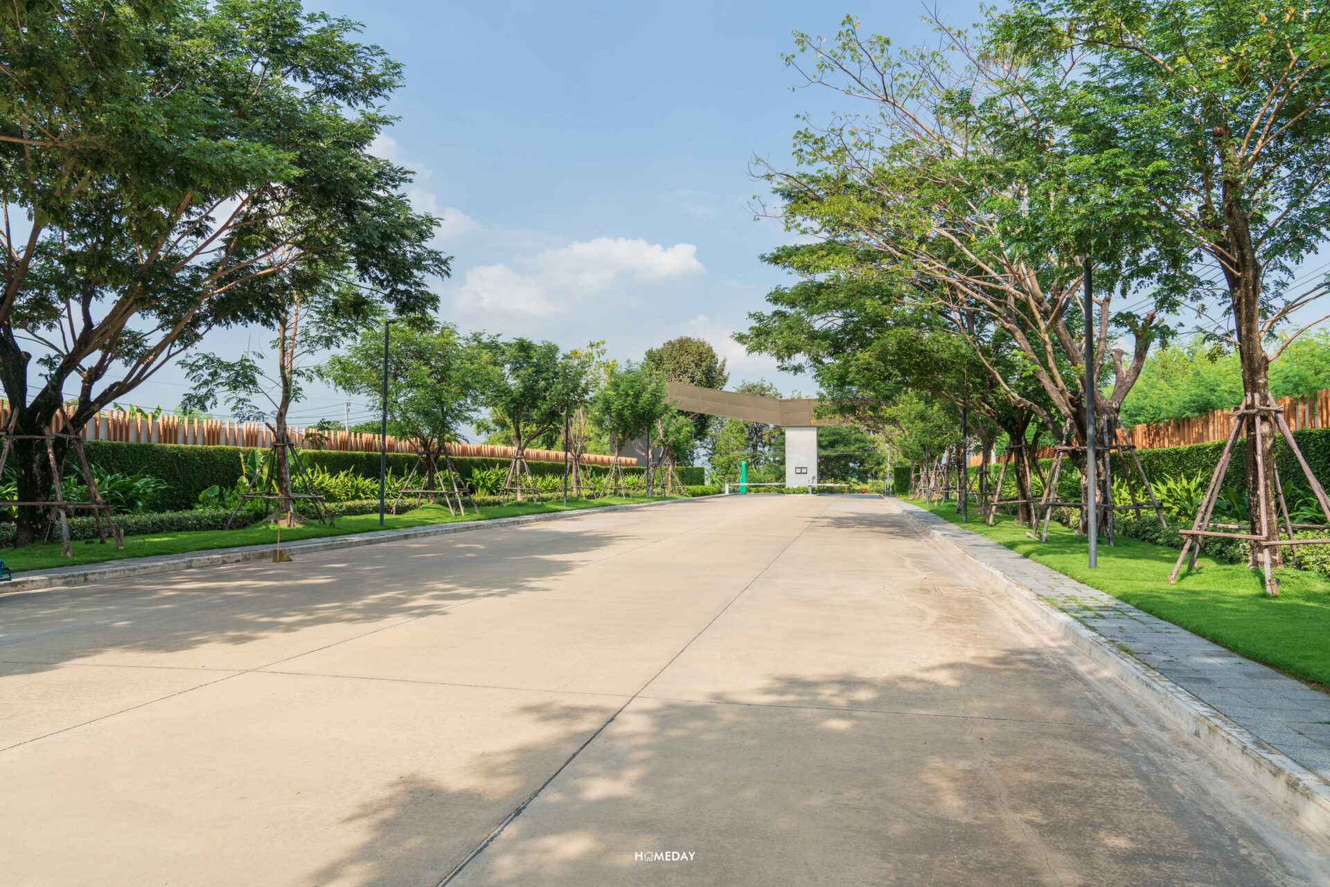 จาก Main Gate เข้ามาด้านในก็จะเจอกับถนนเมนขนาดใหญ่ผ่านซุ้มต้นไม้ร่มรื่นสองข้างทางที่ตรงยาวเข้าไป สุดทางจะเจอกับวงเวียนต้นไม้และทะเลสาบ ซึ่งเป็นส่วนกลางที่ทั้ง 2 โครงการจะได้ใช้ร่วมกันครับ ภายในโครงการจะเห็นได้เลยว่ามีการปลูกต้นไม้เขียวขจีนานาพรรณ ไว้อย่าง ร่มรื่น บรรยากาศดี ตั้งแต่เลี้ยวรถเข้ามาเลยล่ะครับ