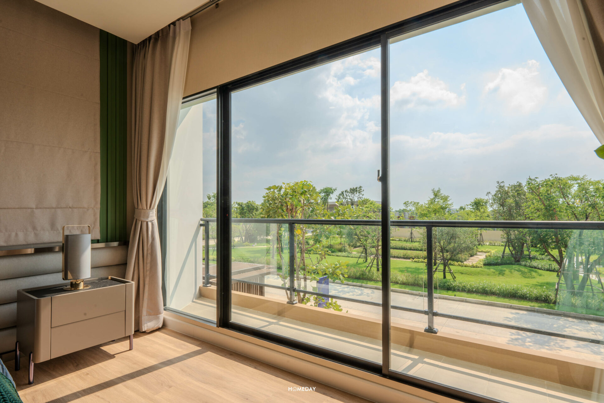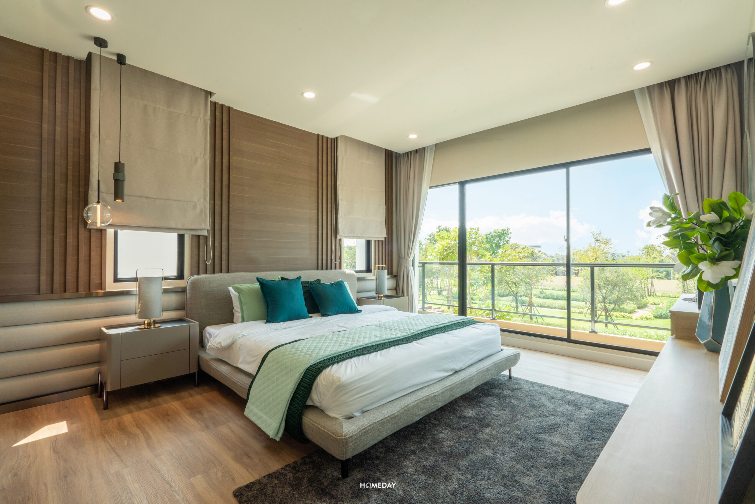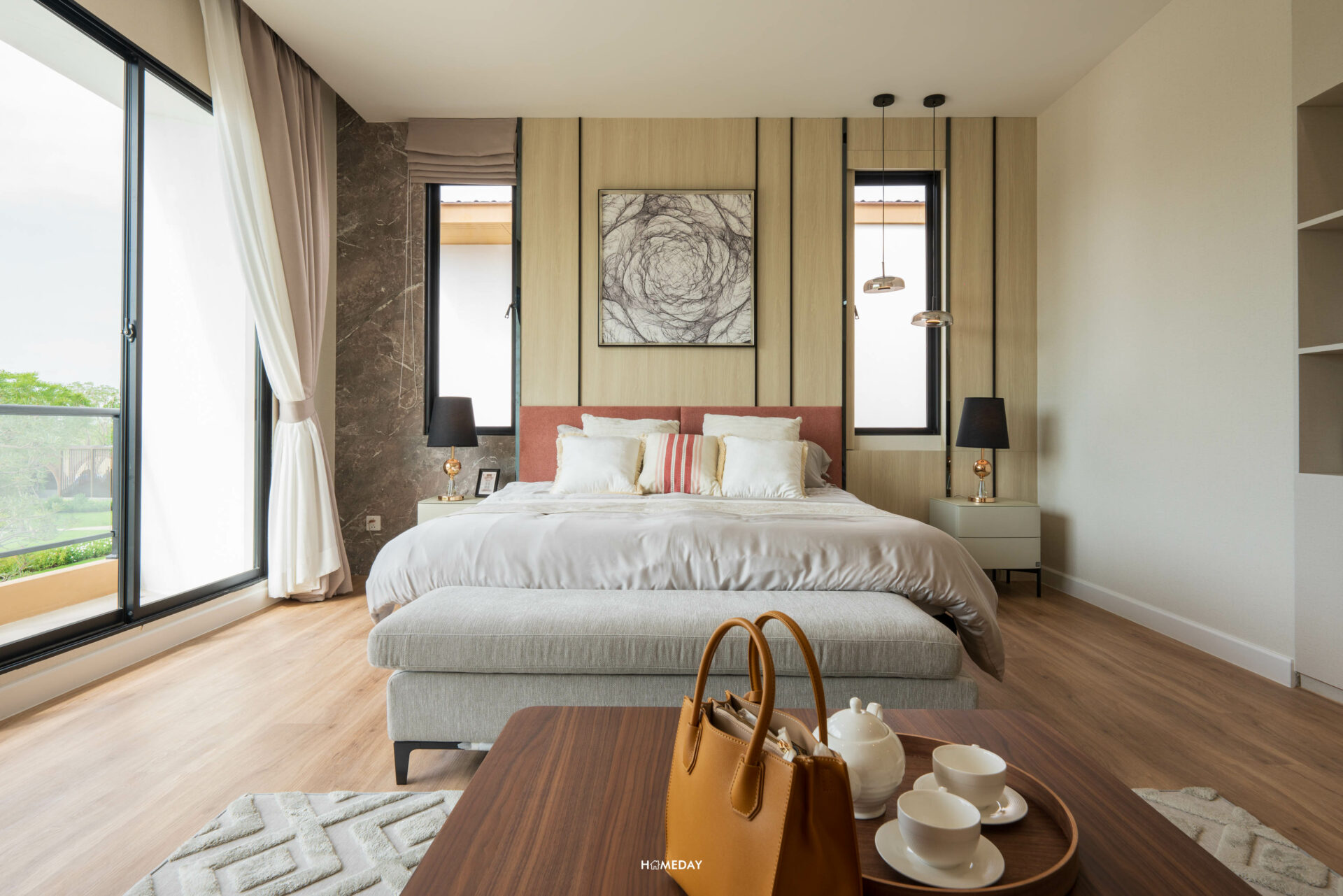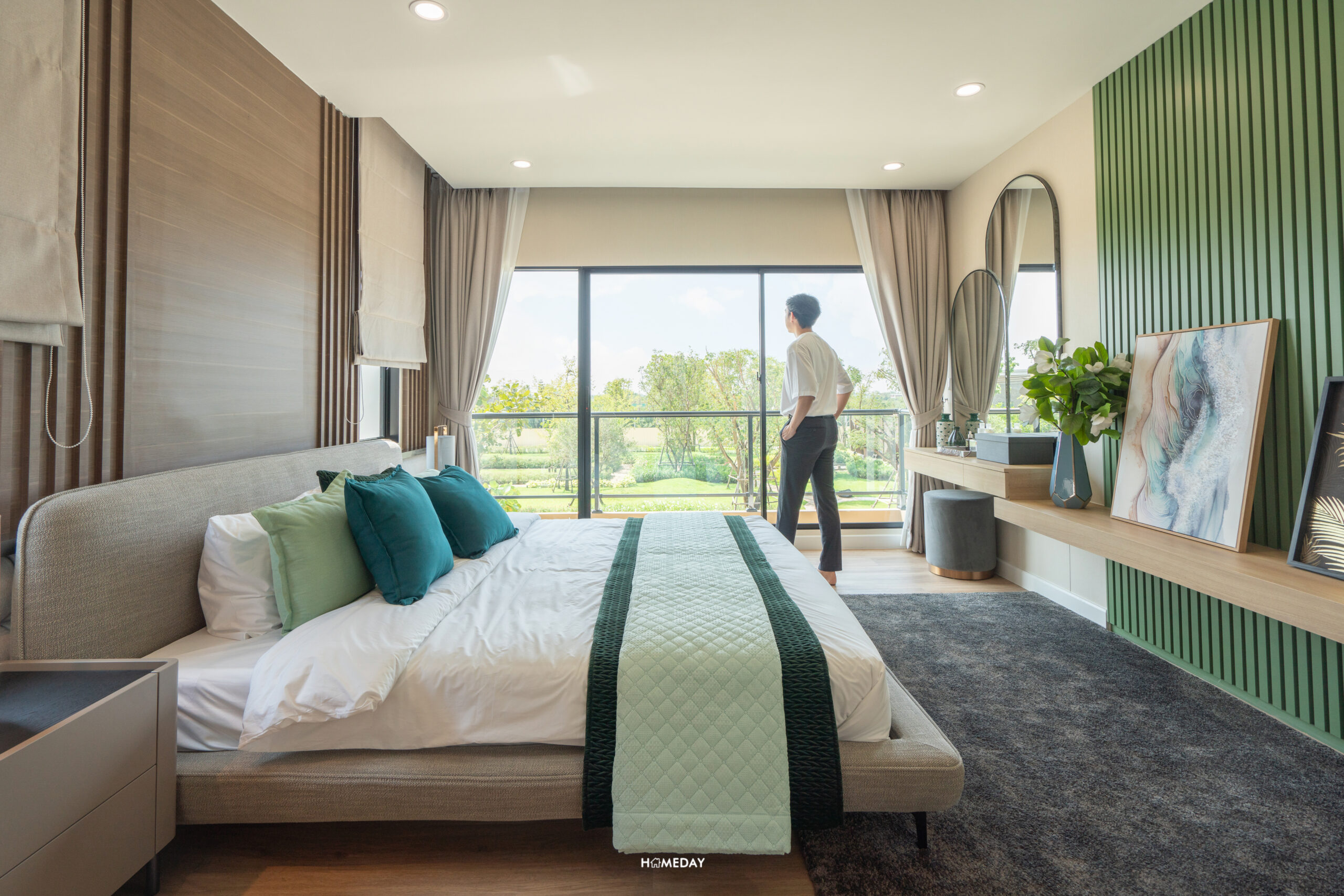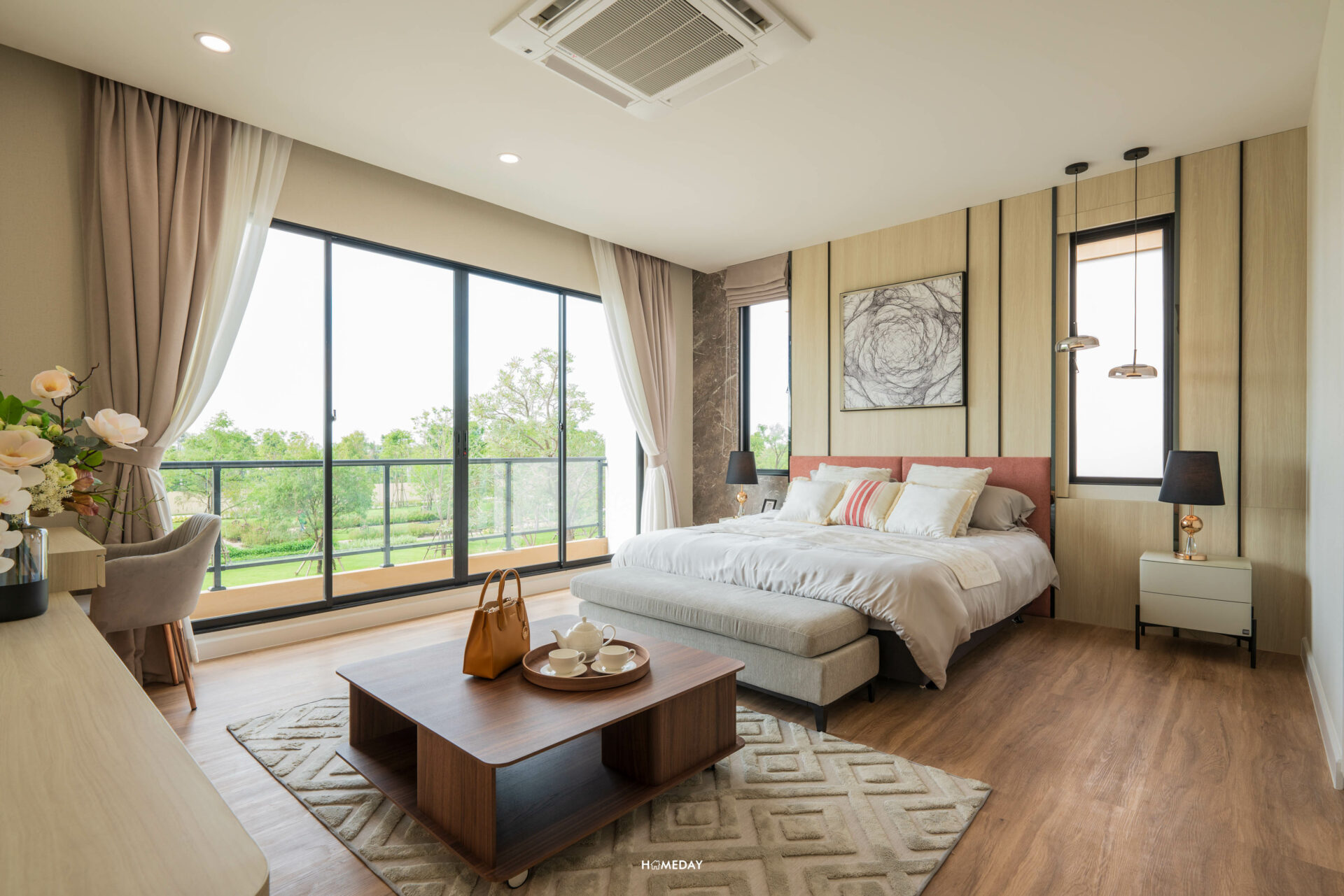 ห้องที่อยู่ตรงข้ามกันคือ Master Bedroom ครับ ขนาดห้องโอ่โถง กว้างขวางมาก ๆ มาพร้อมกับระเบียงส่วนตัวที่สามารถออกไปใช้งานได้จริง แถมยังได้บานกระจกขนาดใหญ่ รับวิวได้แบบเต็มตา