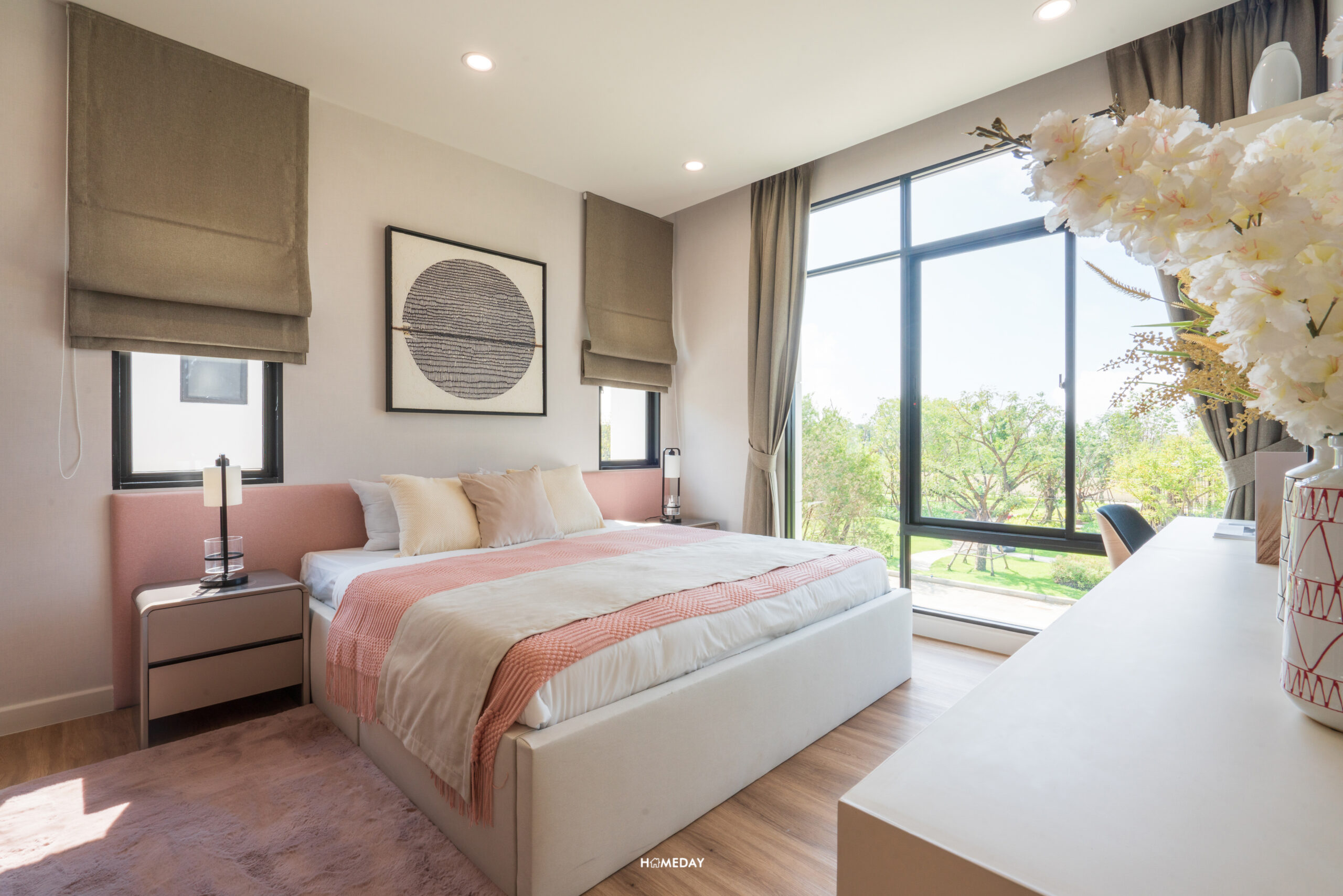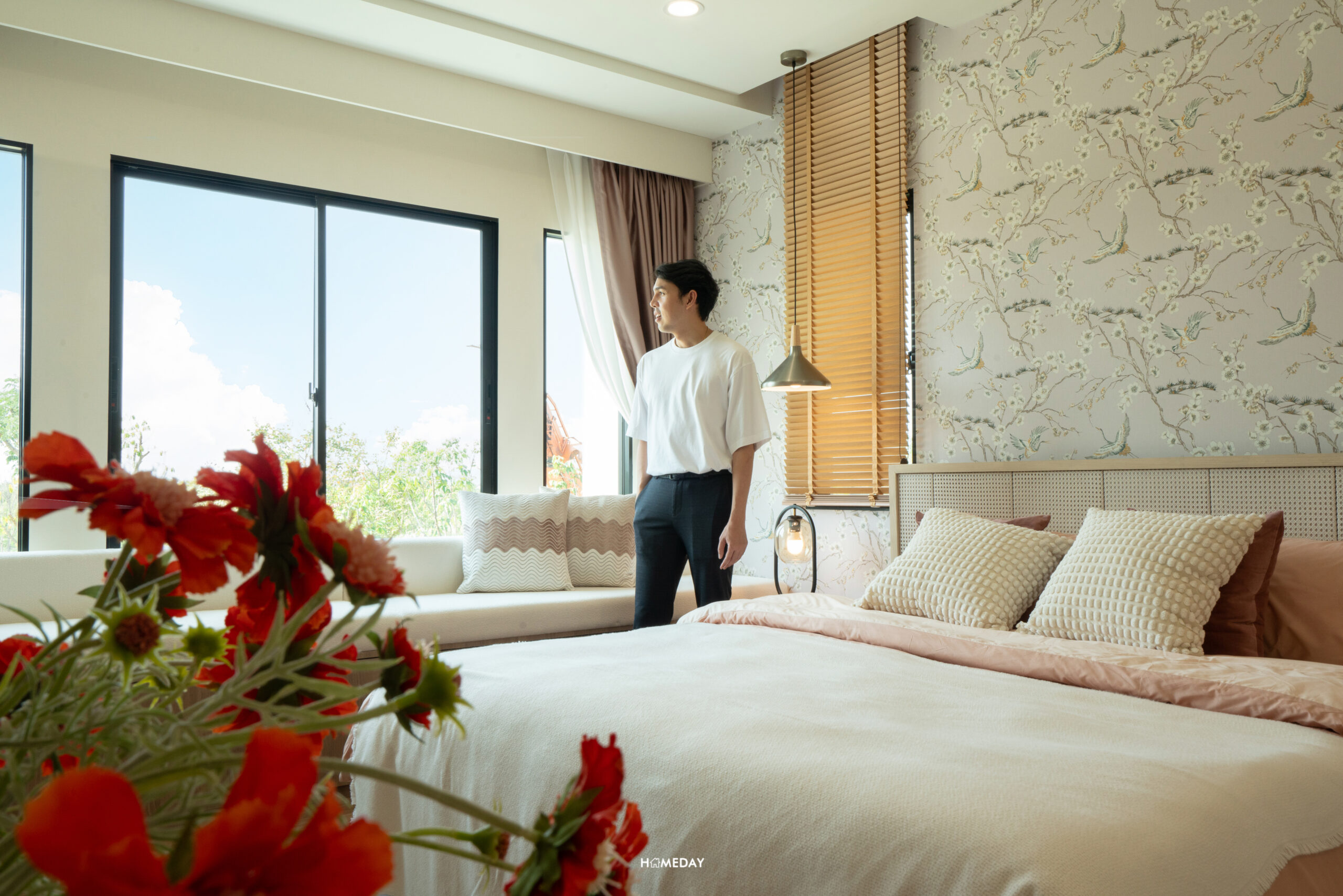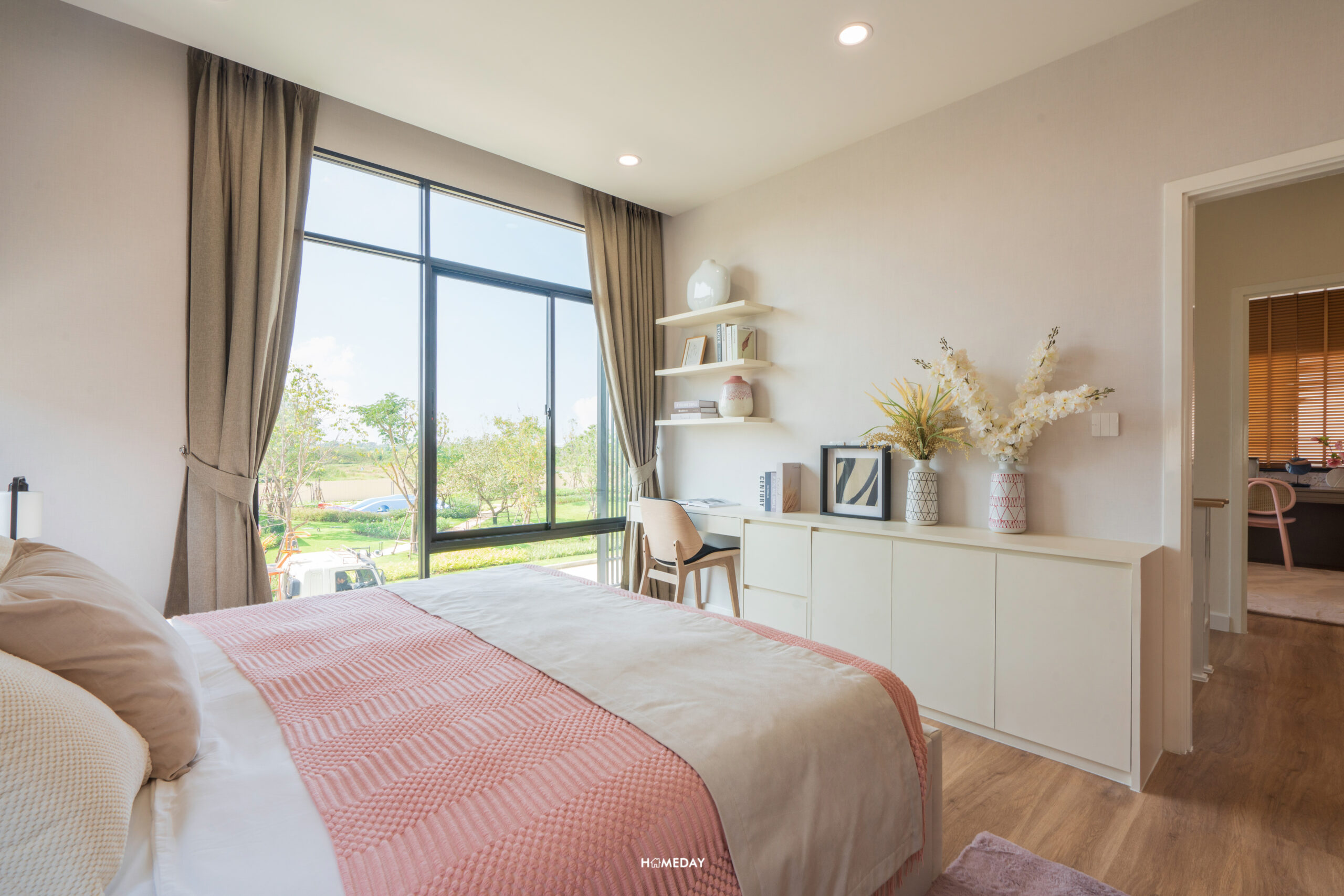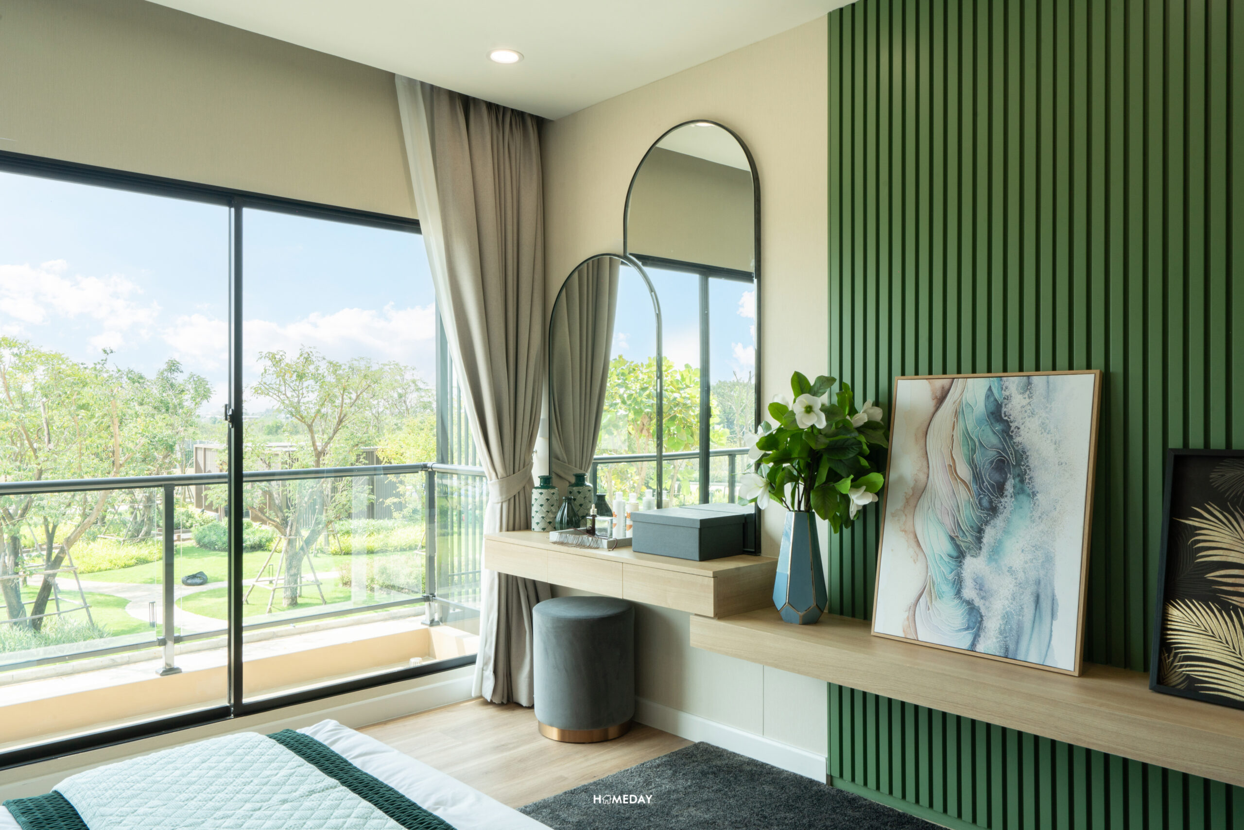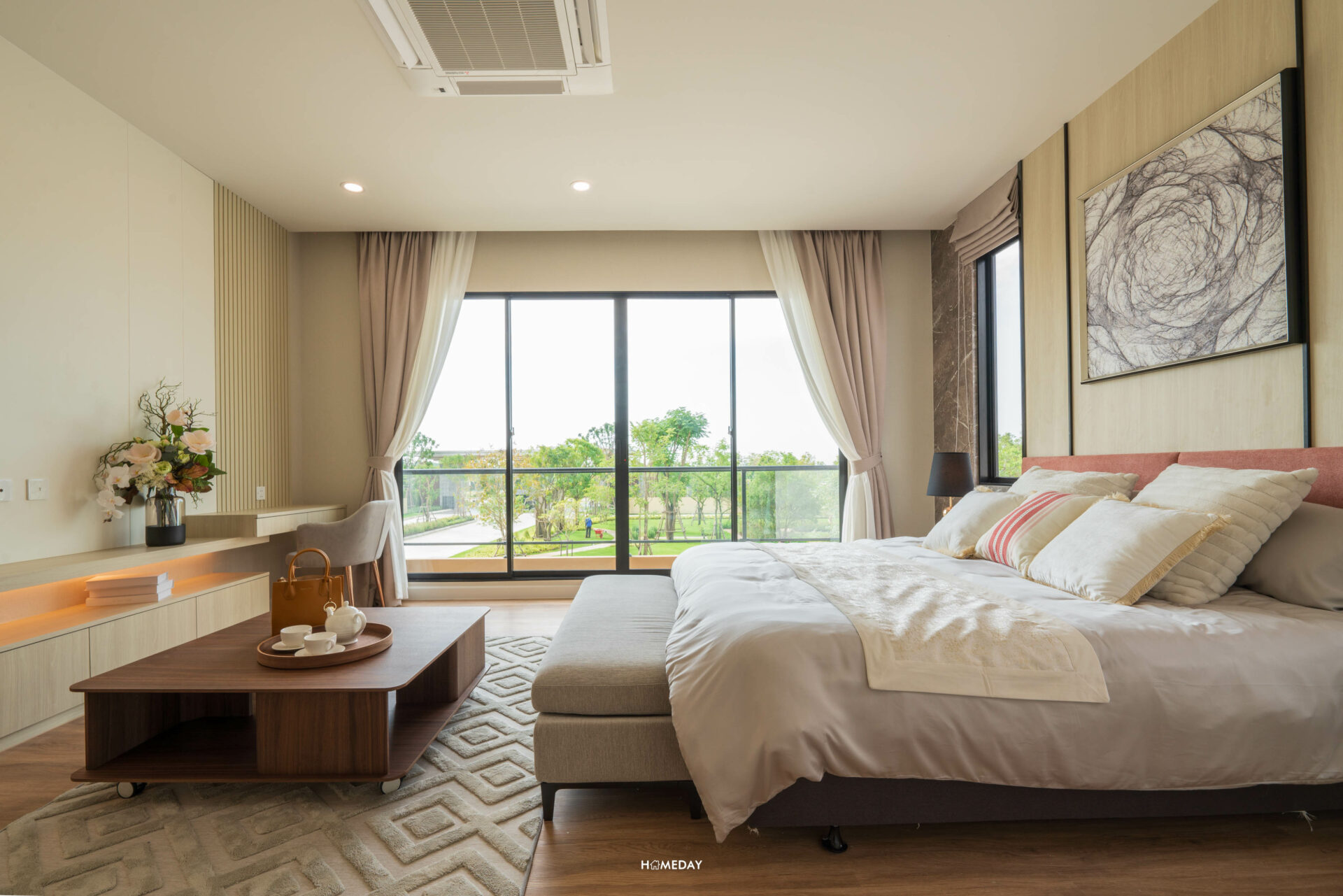 ห้องที่อยู่ตรงข้ามกันคือ Master Bedroom ครับ ขนาดห้องโอ่โถง กว้างขวางมาก ๆ มาพร้อมกับระเบียงส่วนตัวที่สามารถออกไปใช้งานได้จริง แถมยังได้บานกระจกขนาดใหญ่ รับวิวได้แบบเต็มตา