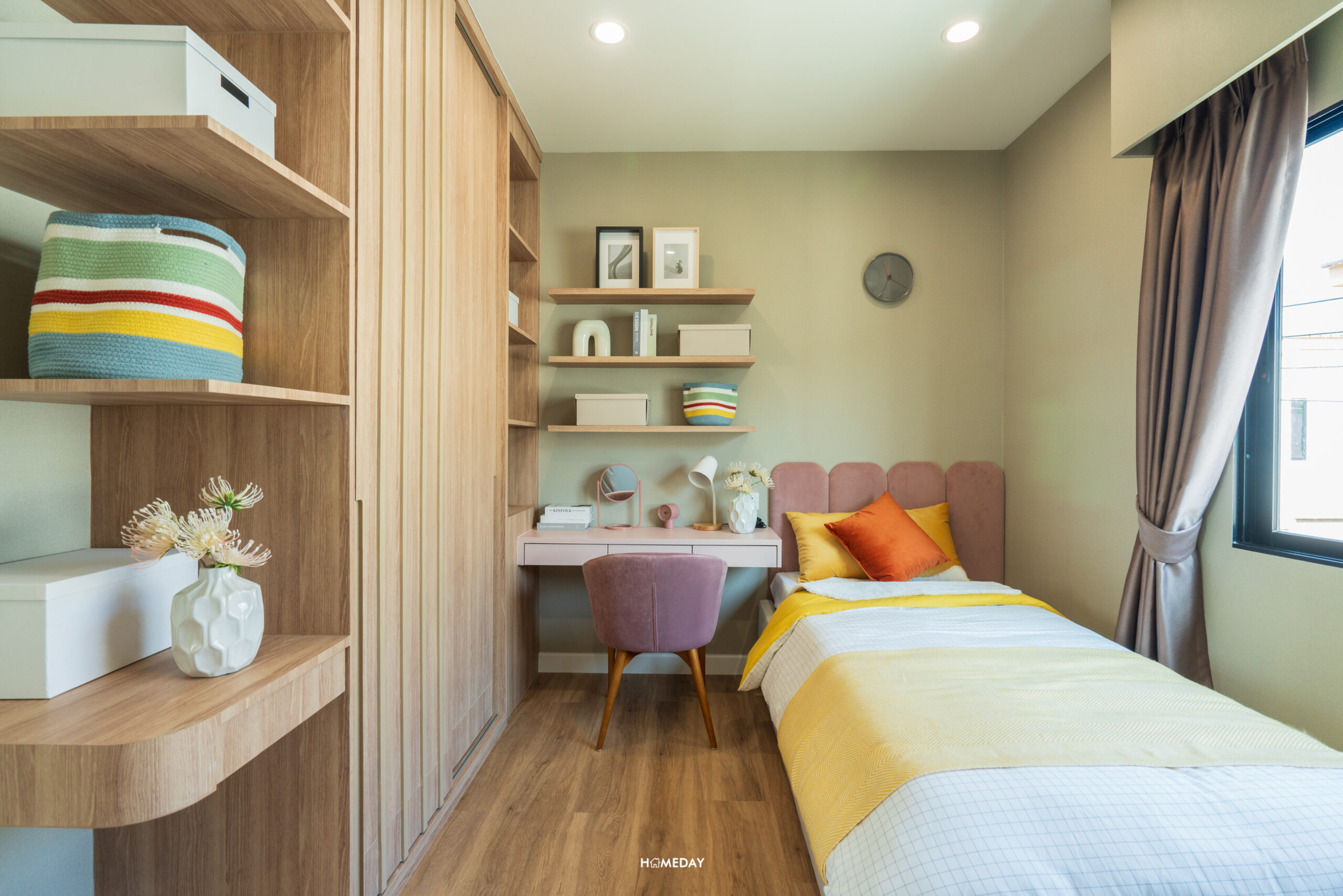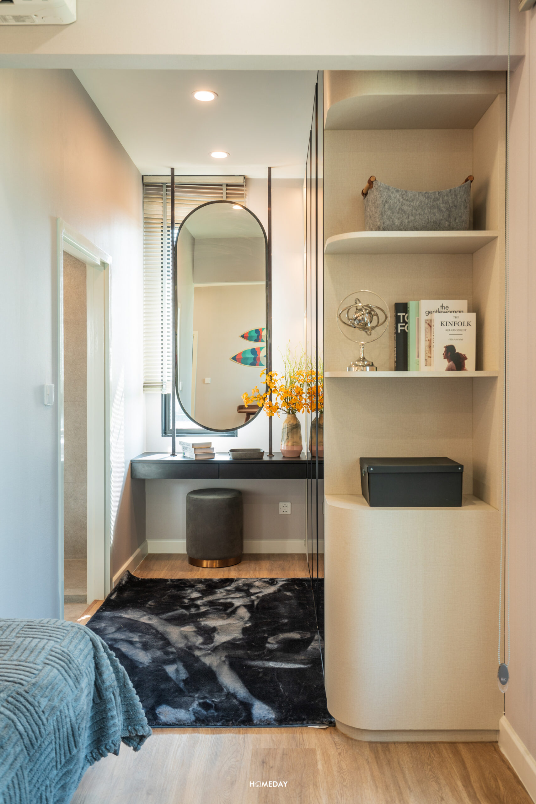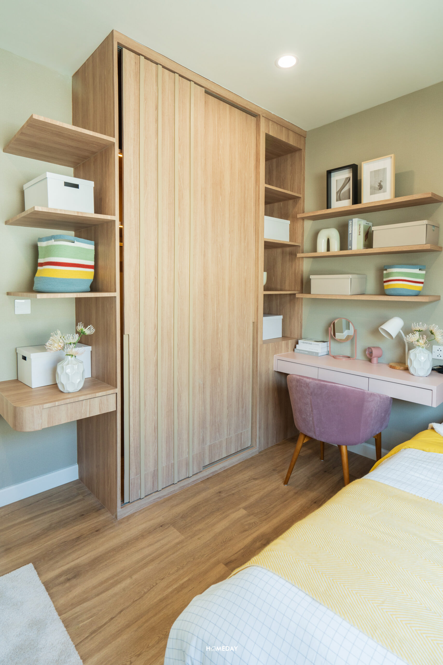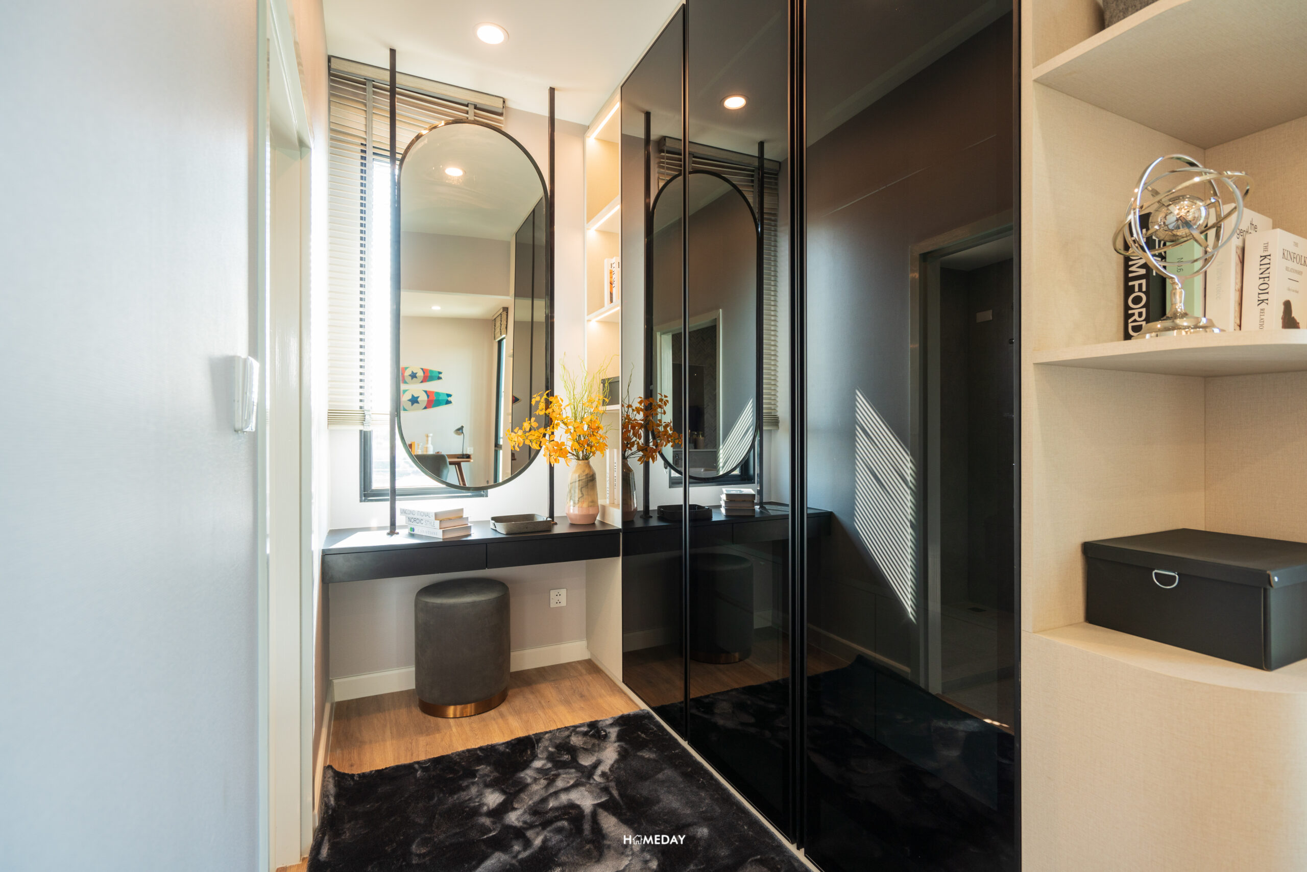 หันมาที่อีกฝั่ง ทางด้านซ้ายมือติดกับประตูทางเข้า มุมนี้เป็นพื้นที่ผนังด้านหน้าห้องน้ำ ที่เราสามารถใส่ตู้เสื้อผ้าบิลต์อินและโต๊ะเครื่องแป้งได้อย่างลงตัวครับ