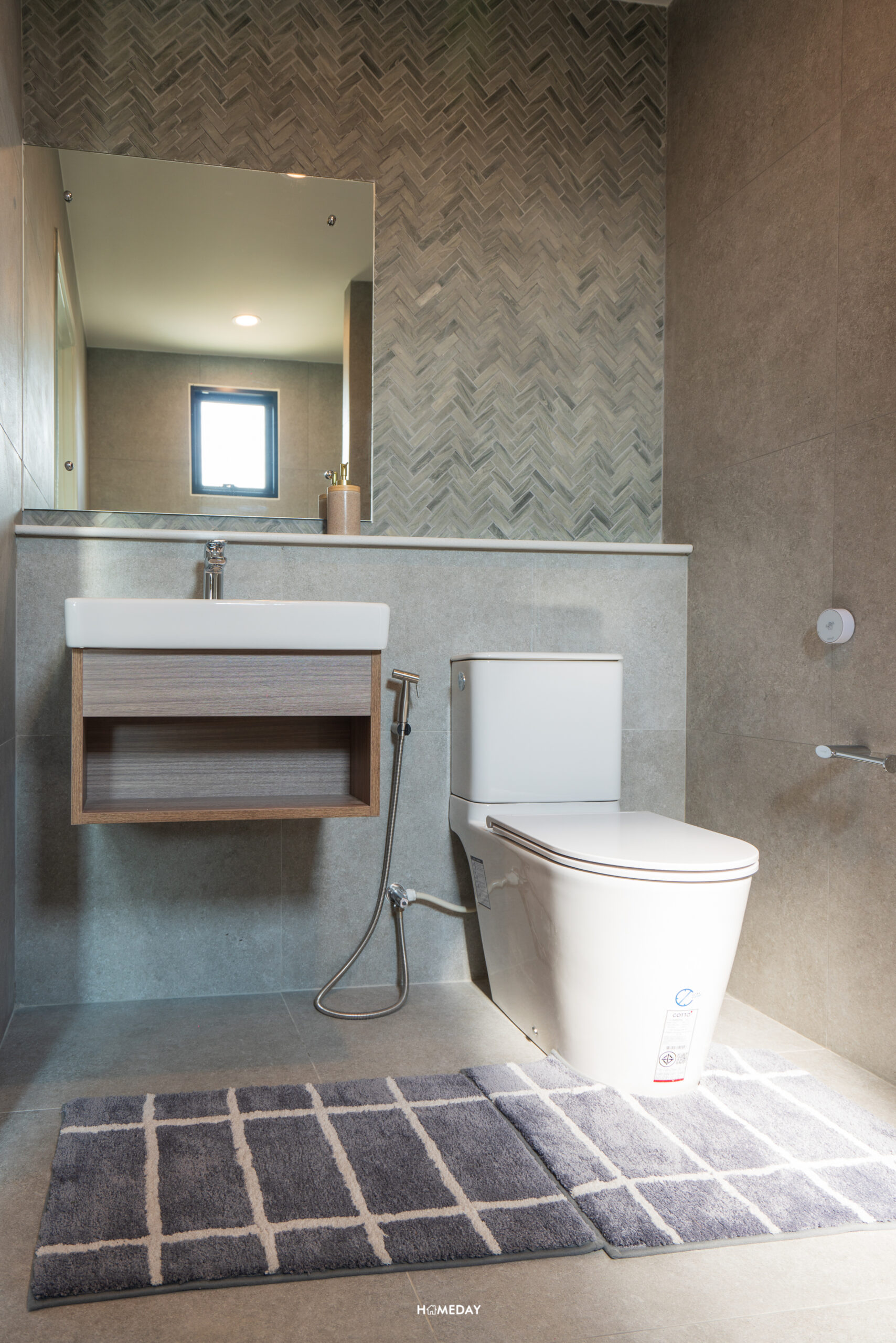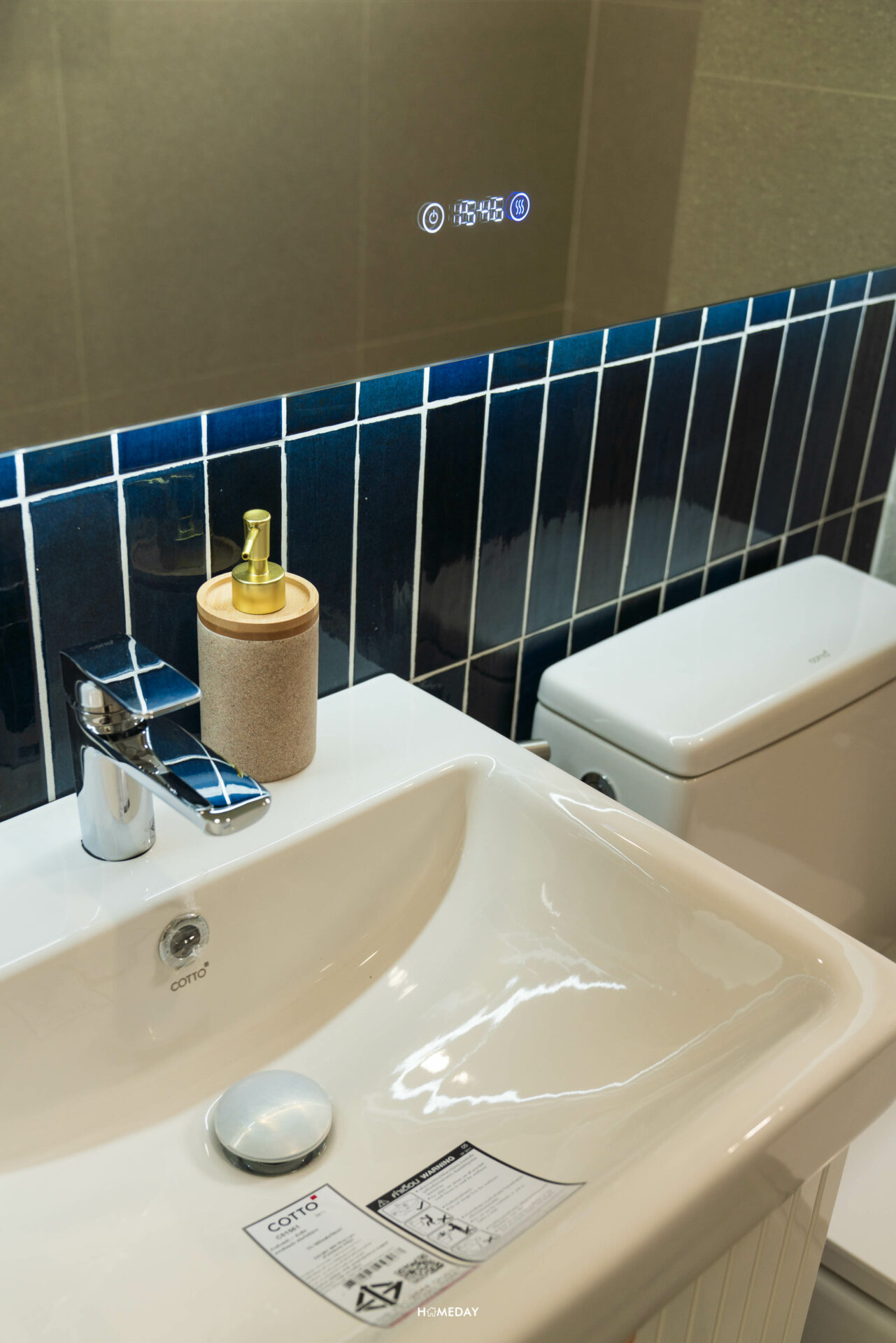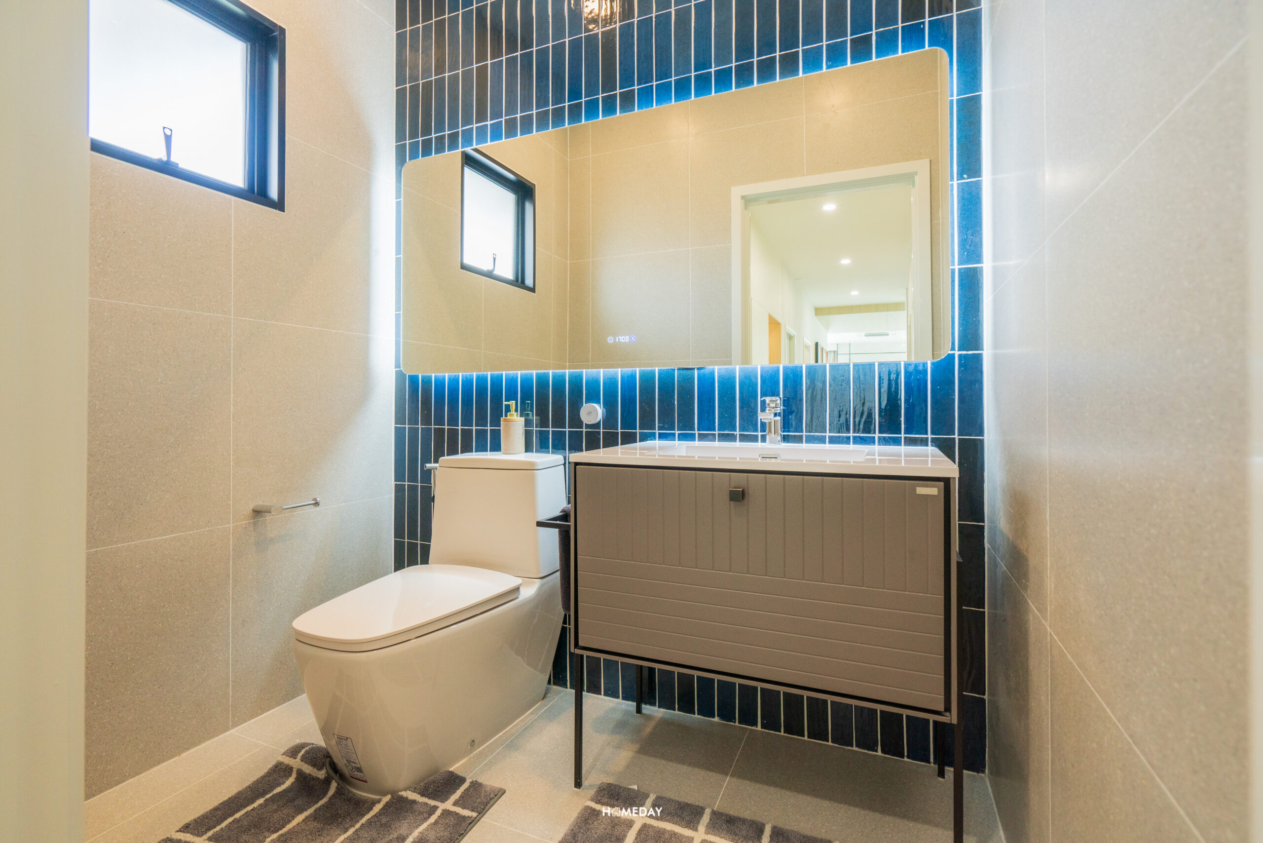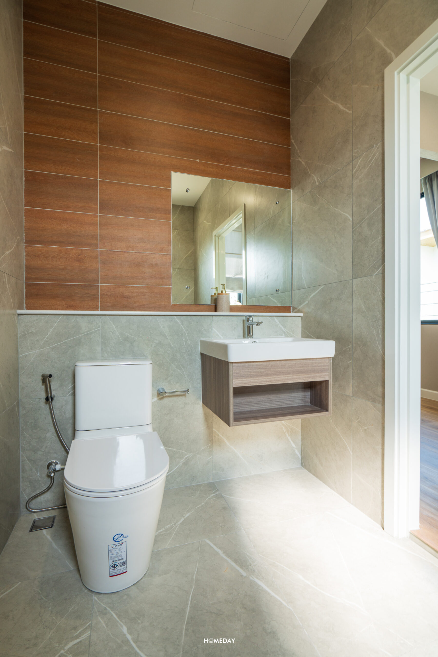 ห้องน้ำสำหรับแขกจะอยู่ด้านในสุด ติดกับห้องครัว สุขภัณฑ์ทั้งหมดจาก COTTO ภายในได้กระจก LED, อ่างล้างหน้าพร้อมด้วยบานตู้เก็บของด้านใต้ และโถสุขภัณฑ์ระบบ Touchless