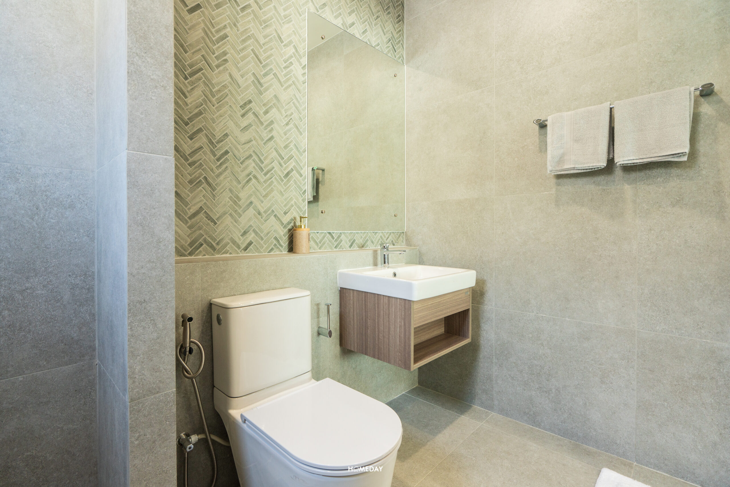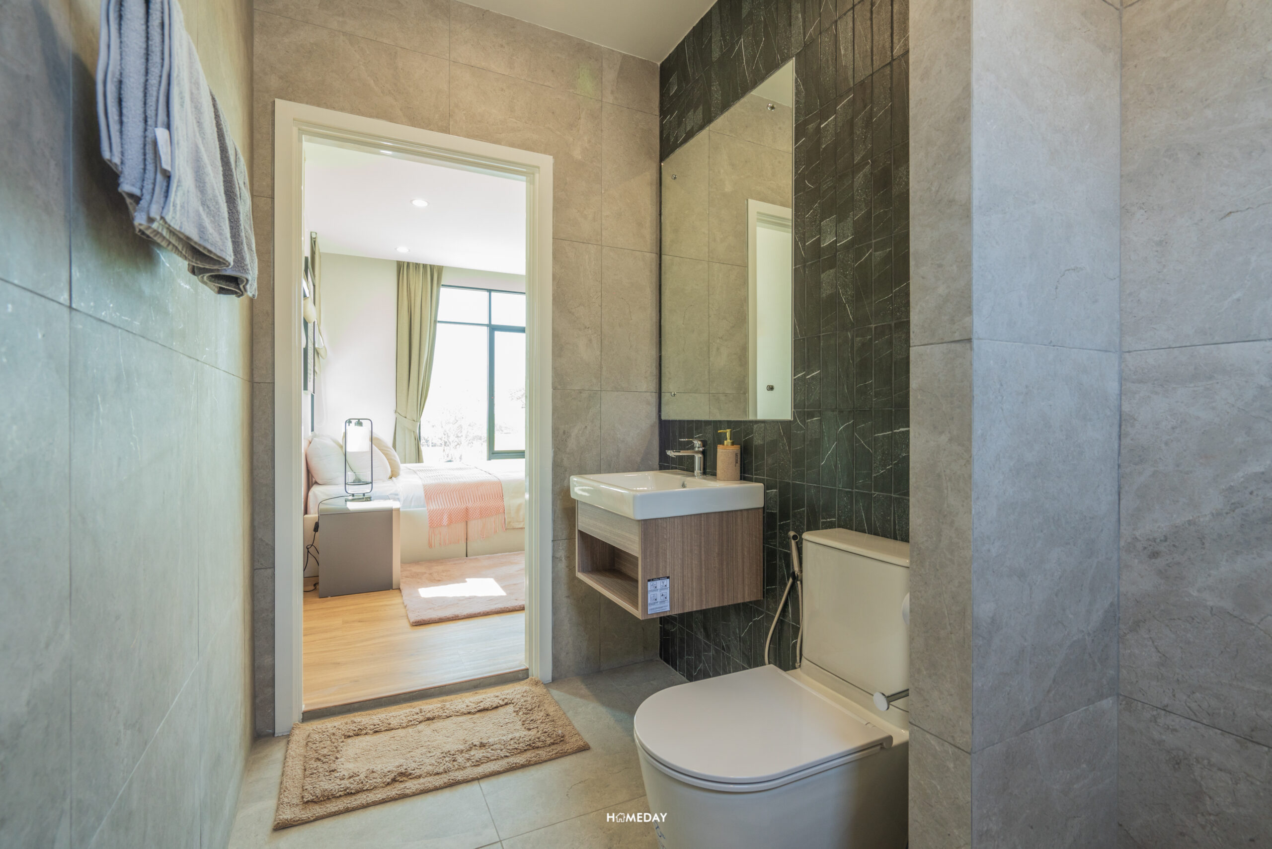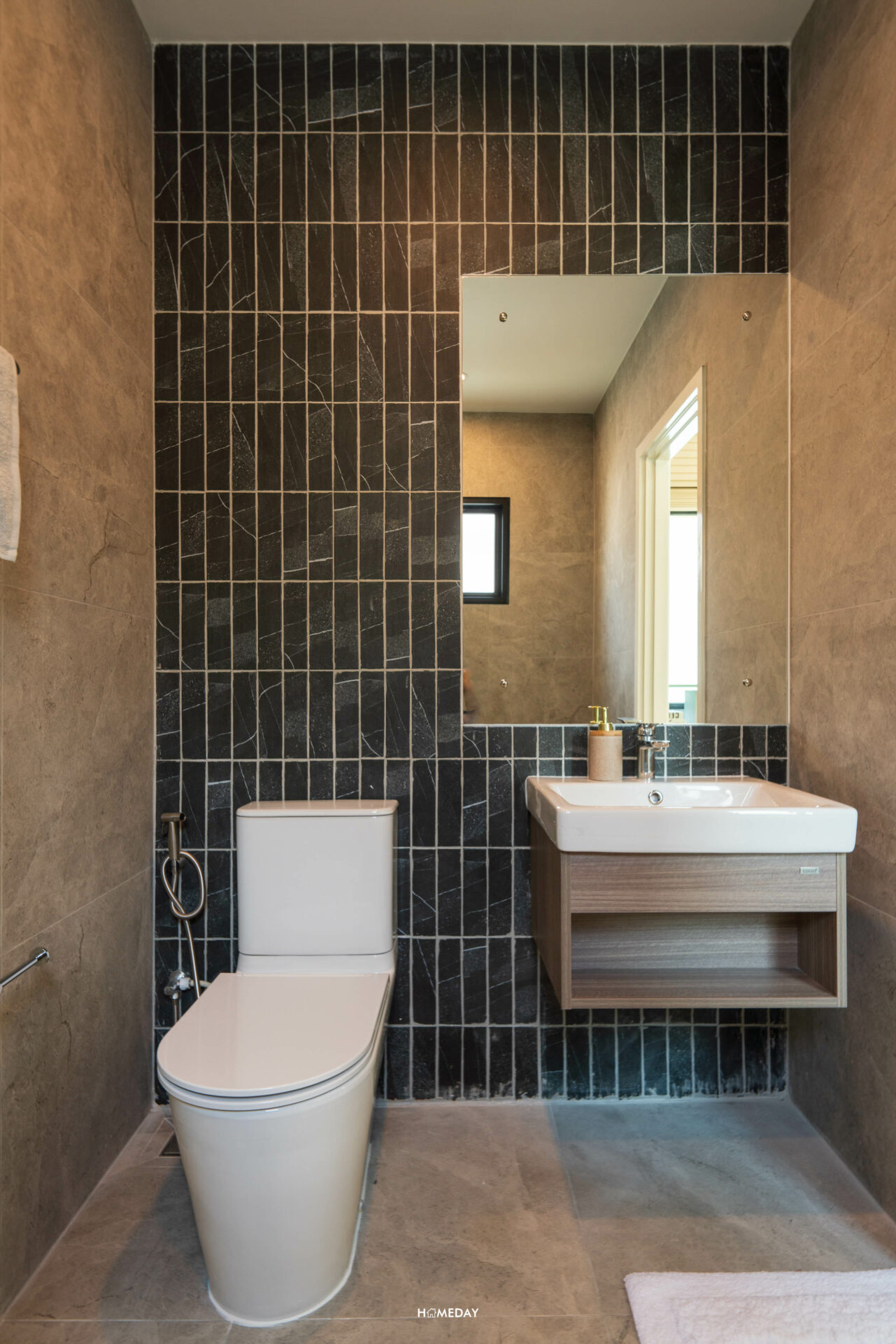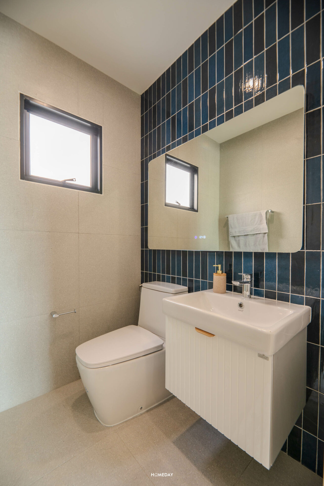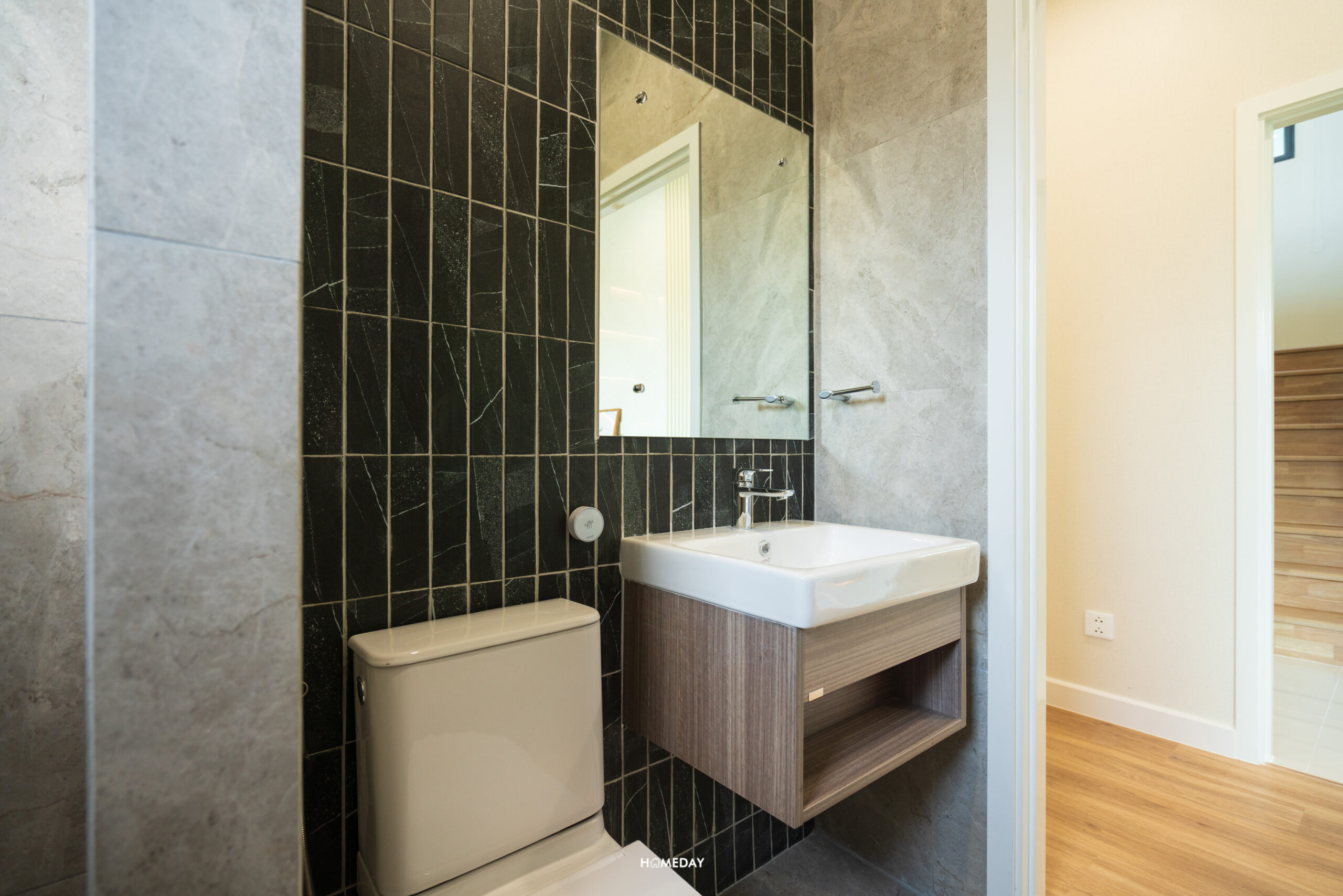 ห้องน้ำสำหรับแขกจะอยู่ด้านในสุด ติดกับห้องครัว สุขภัณฑ์ทั้งหมดจาก COTTO ภายในได้กระจก LED, อ่างล้างหน้าพร้อมด้วยบานตู้เก็บของด้านใต้ และโถสุขภัณฑ์ระบบ Touchless