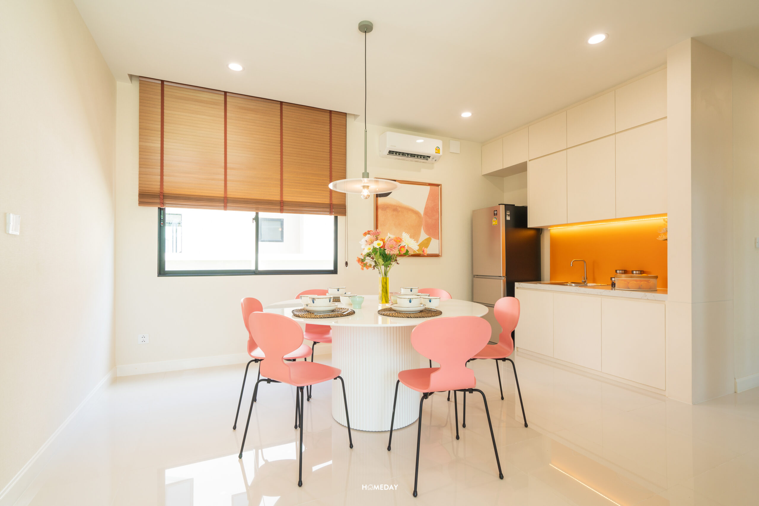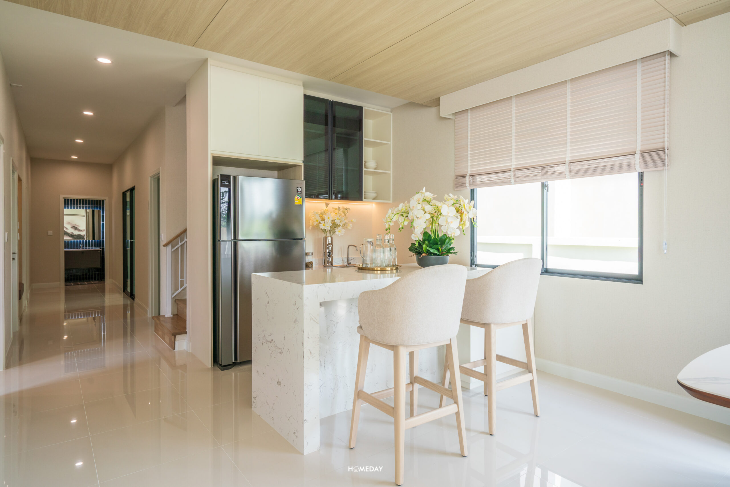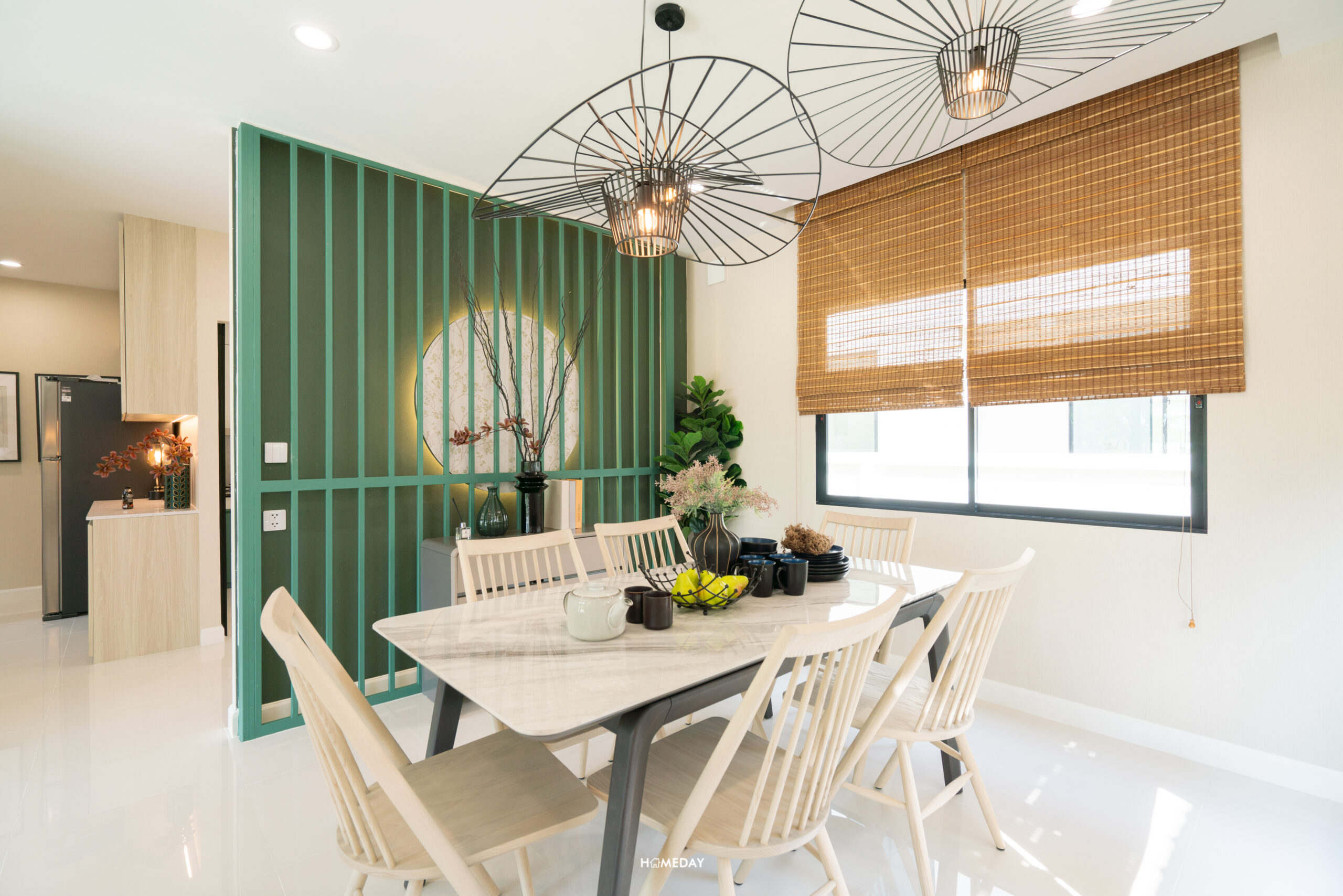 จาก Living ถัดเข้าไปด้านใน จะเป็นพื้นที่ Open Space ที่อยู่เชื่อมกับ Dining ครับ พื้นชั้น 1 ของทุกแบบบ้าน จะปูกระเบื้องแกรนิตโต้ ขนาด 60*60 เซนติเมตร มาให้ครับ สีขาวสะอาด เรียบง่าย มินิมอลตามแบบฉบับญี่ปุ่น บ้านตัวอย่างออกแบบให้ Dining ของแบบบ้านนี้ มีความโล่ง โปร่ง วางเป็นโต๊ะกลมและเก้าอี้สำหรับ 4 ที่นั่ง ทำให้รอบ ๆ เหลือพื้นที่ค่อนข้างมาก สามารถวางต้นไม้ประดับตกแต่ง หรือบิลต์อินเฟอร์นิเจอร์เพิ่มพื้นที่จัดเก็บก็ได้ครับ