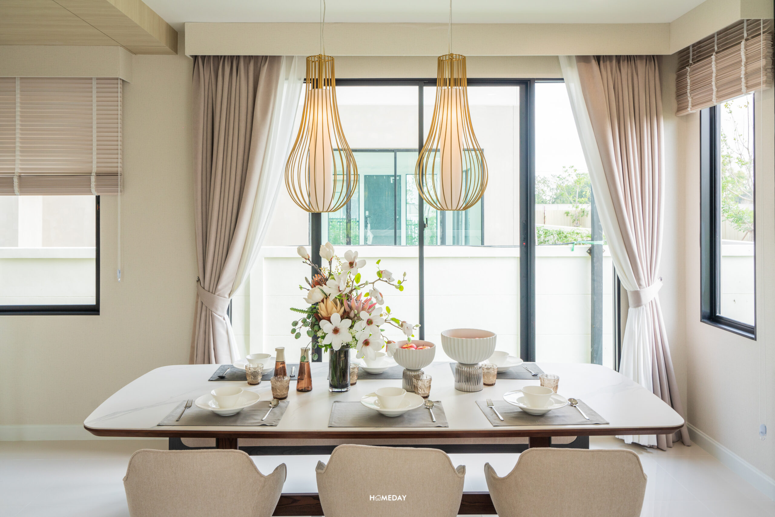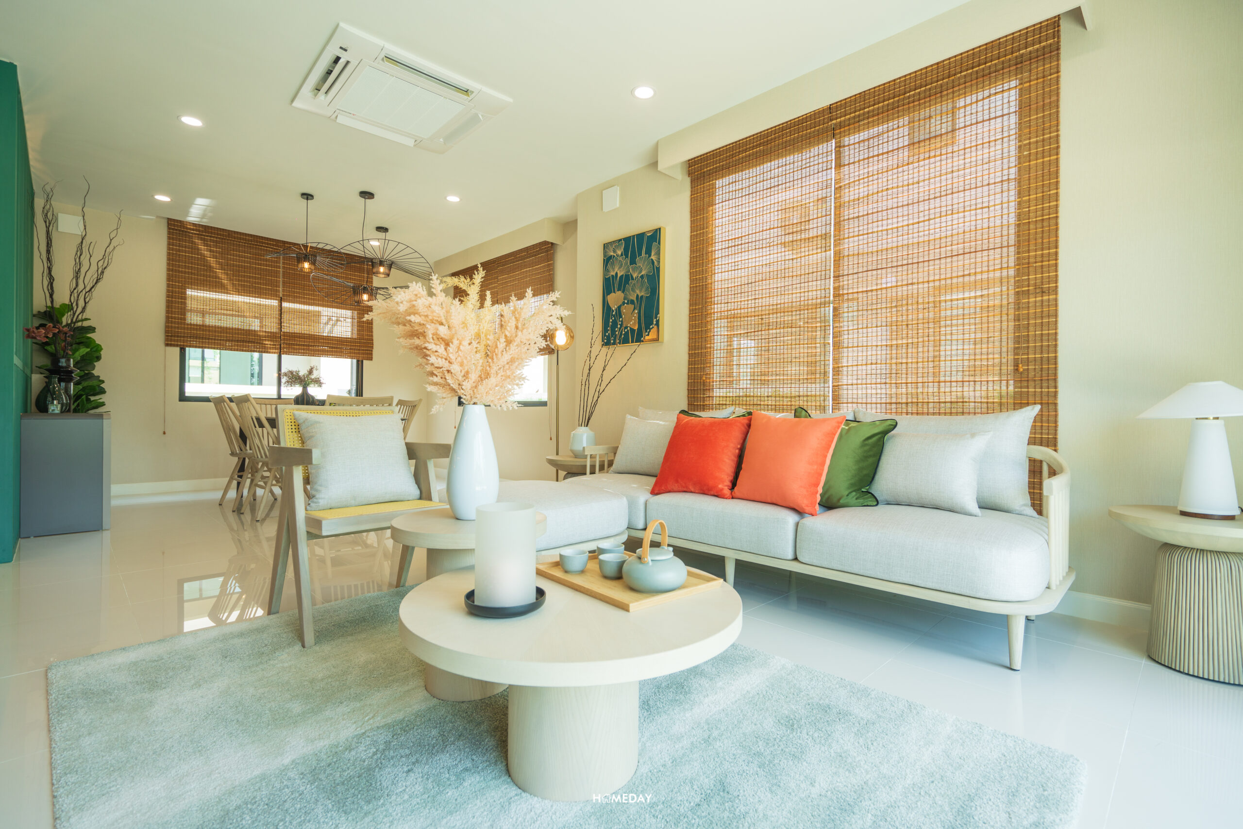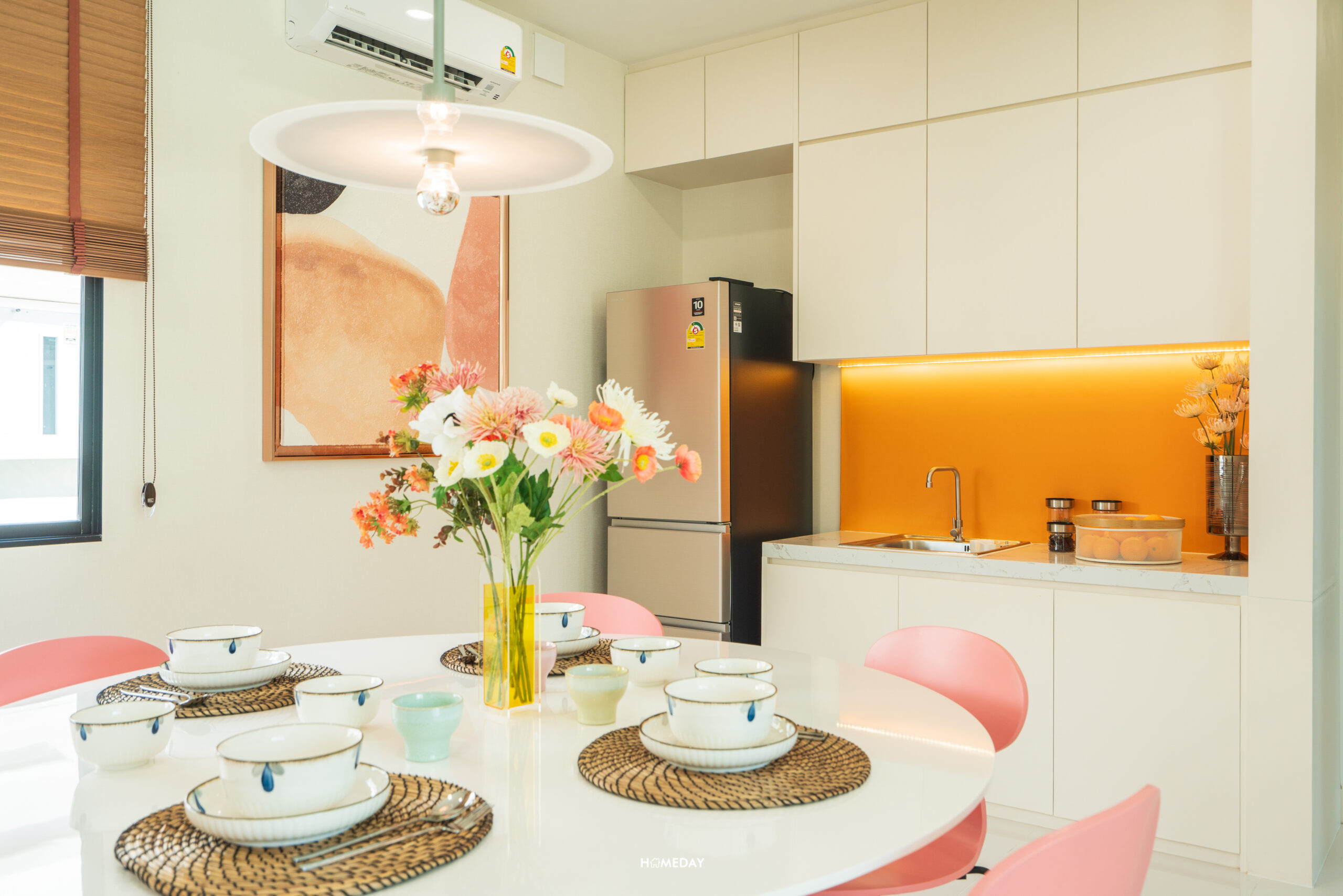 จาก Living ถัดเข้าไปด้านใน จะเป็นพื้นที่ Open Space ที่อยู่เชื่อมกับ Dining ครับ พื้นชั้น 1 ของทุกแบบบ้าน จะปูกระเบื้องแกรนิตโต้ ขนาด 60*60 เซนติเมตร มาให้ครับ สีขาวสะอาด เรียบง่าย มินิมอลตามแบบฉบับญี่ปุ่น บ้านตัวอย่างออกแบบให้ Dining ของแบบบ้านนี้ มีความโล่ง โปร่ง วางเป็นโต๊ะกลมและเก้าอี้สำหรับ 4 ที่นั่ง ทำให้รอบ ๆ เหลือพื้นที่ค่อนข้างมาก สามารถวางต้นไม้ประดับตกแต่ง หรือบิลต์อินเฟอร์นิเจอร์เพิ่มพื้นที่จัดเก็บก็ได้ครับ