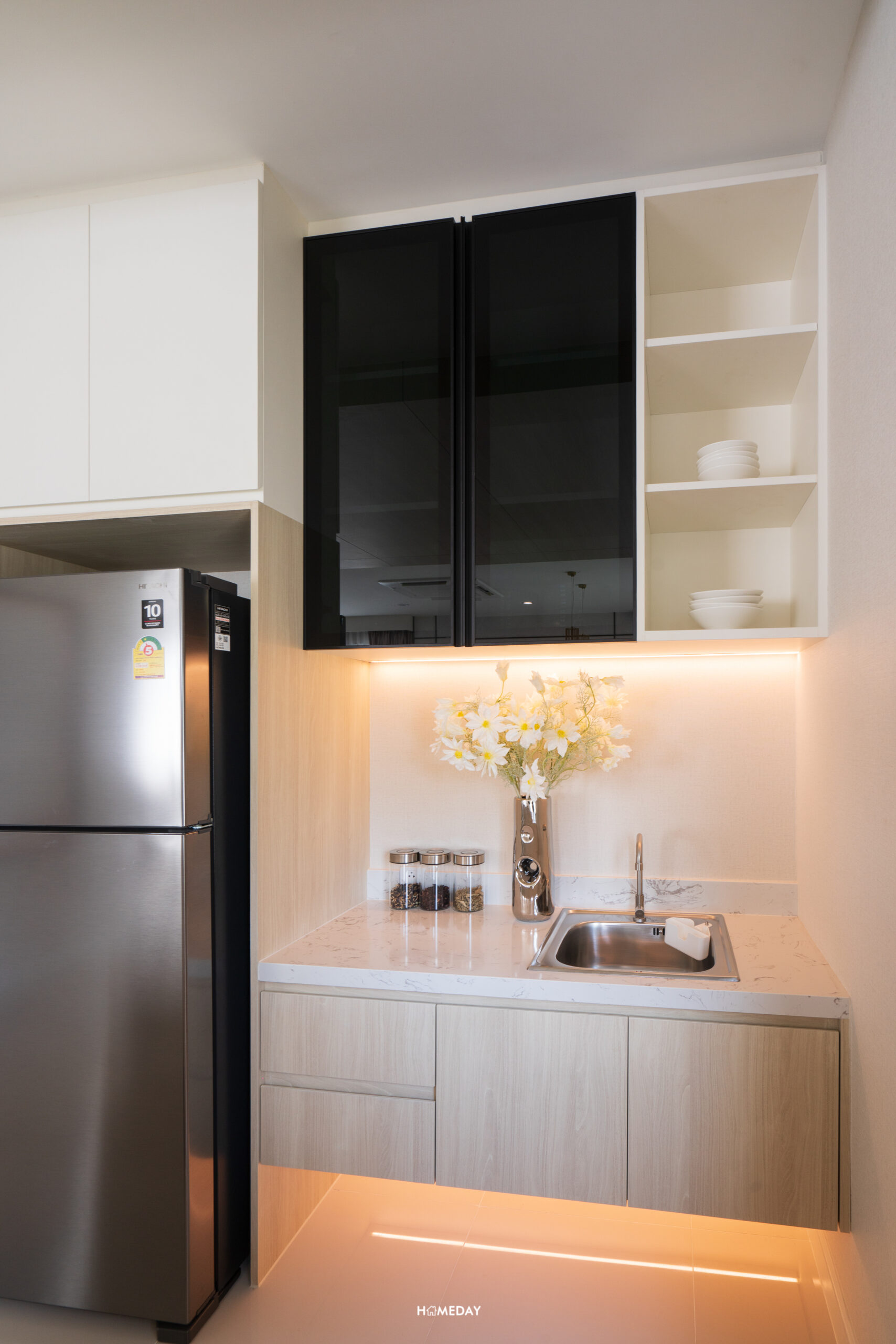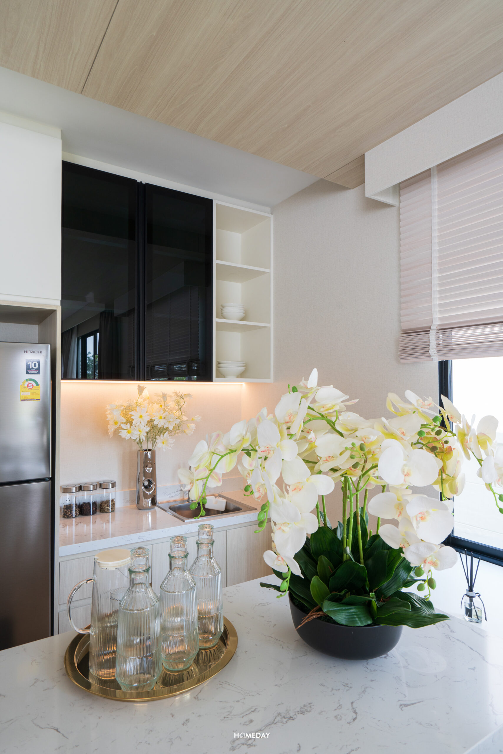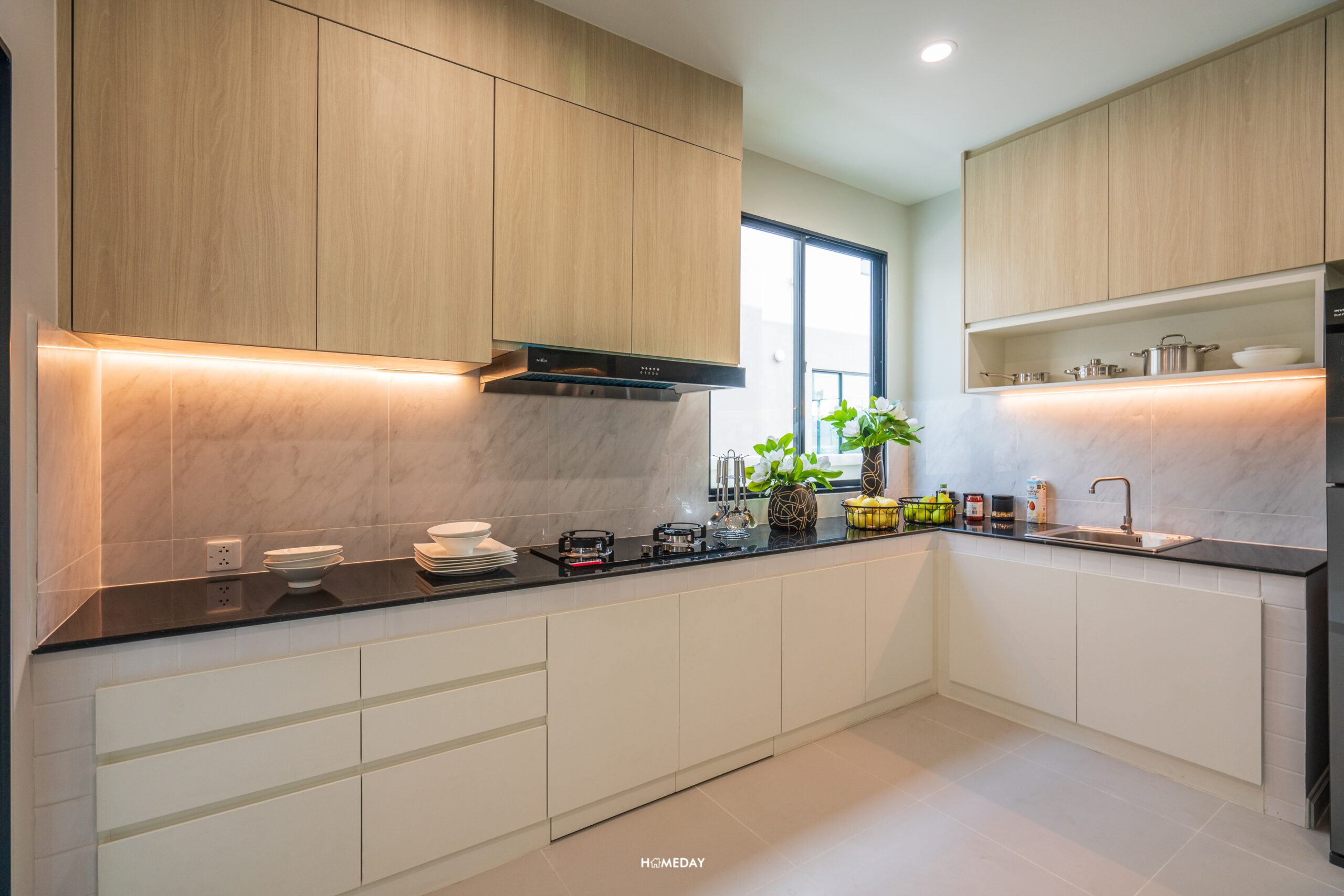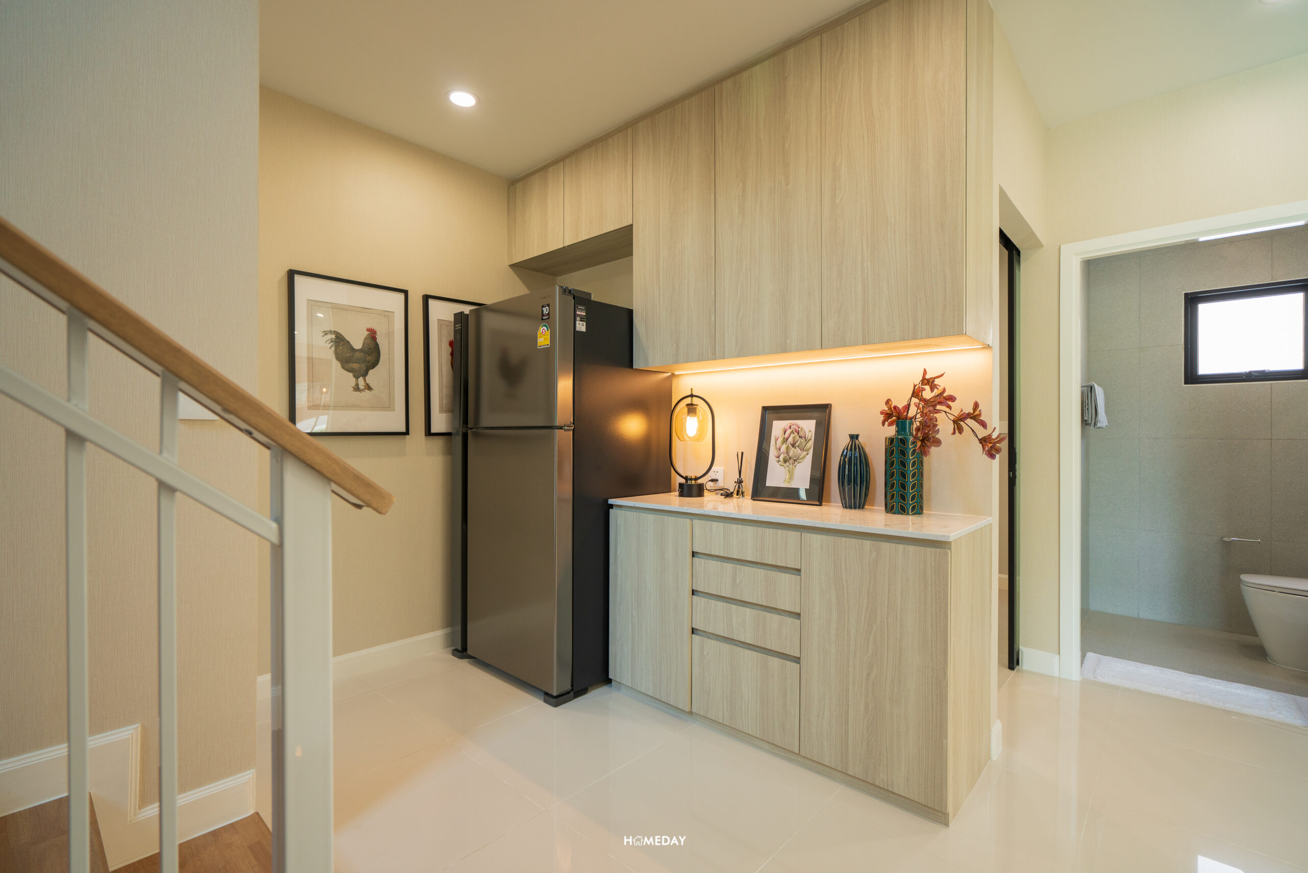 สำหรับบ้านตัวอย่าง เลือกบิลต์อิน Pantry เพิ่มเติมให้ดูเป็นไอเดีย สามารถใส่ตู้เย็น, ซิงก์ล้างจาน, เครื่องปิ้งขนมปัง, เครื่องชงกาแฟ, เตาไฟฟ้า ฯลฯ สำหรับทำอาหารเช้าง่าย ๆ ได้เลย หรือจะใช้เก็บขนมและเครื่องดื่มก็หยิบทานได้สะดวกดีครับ