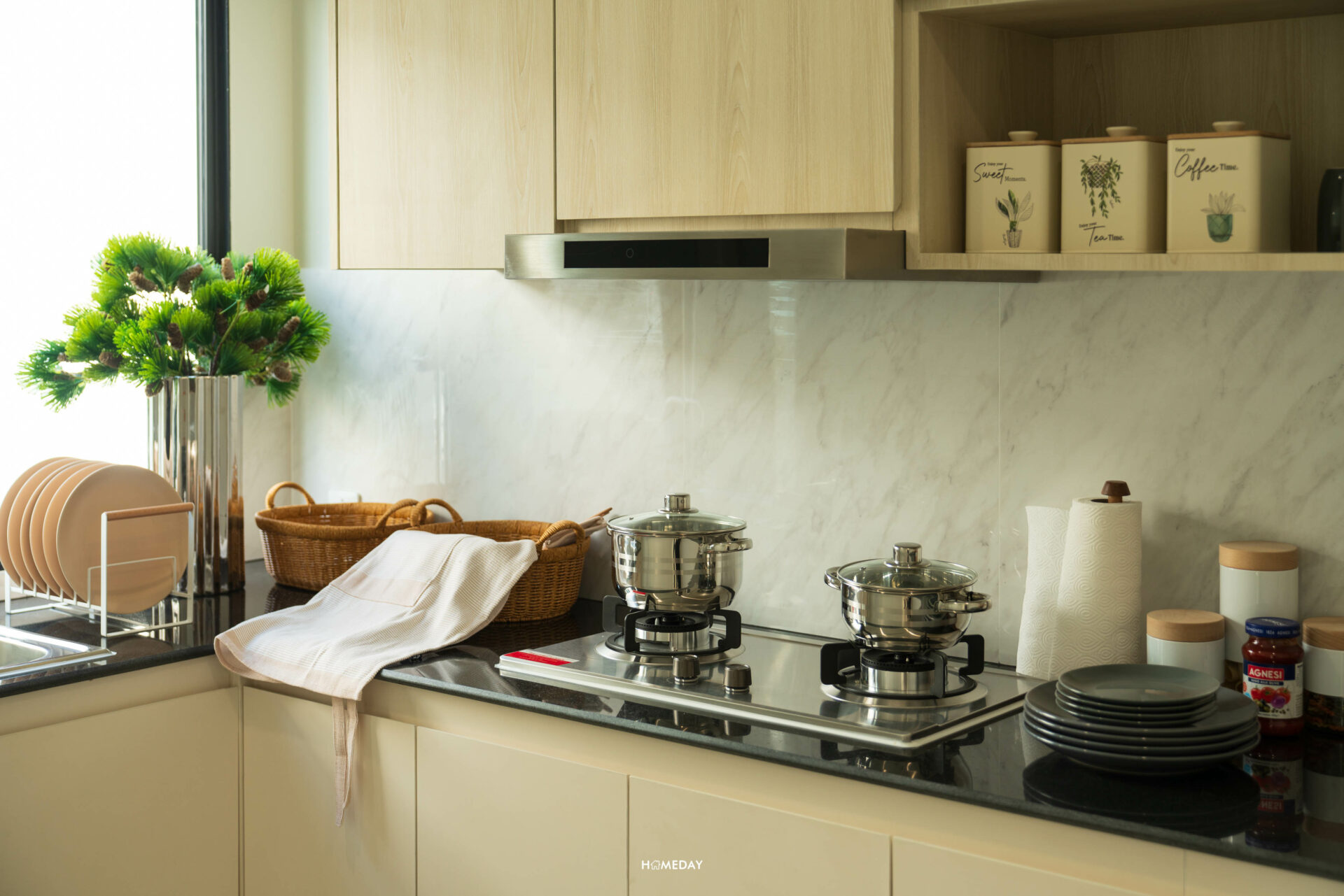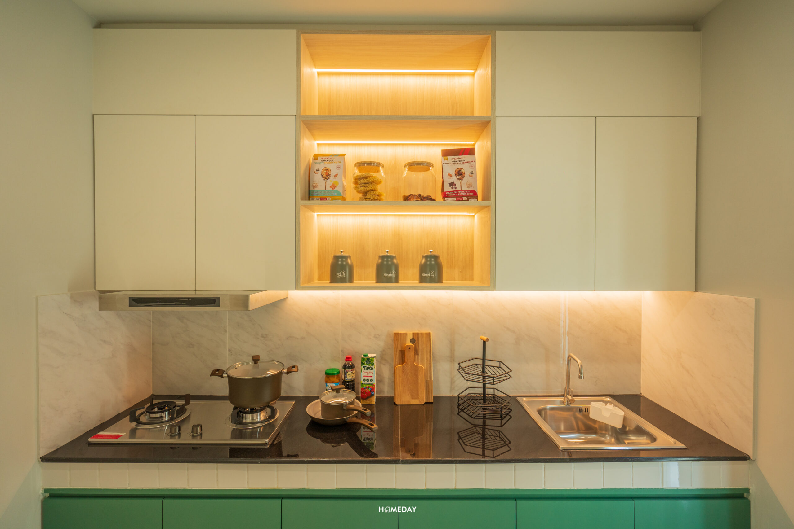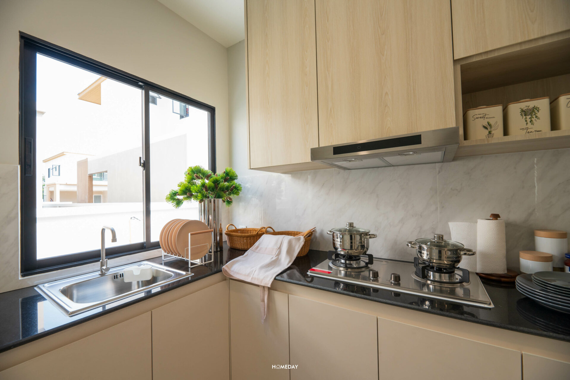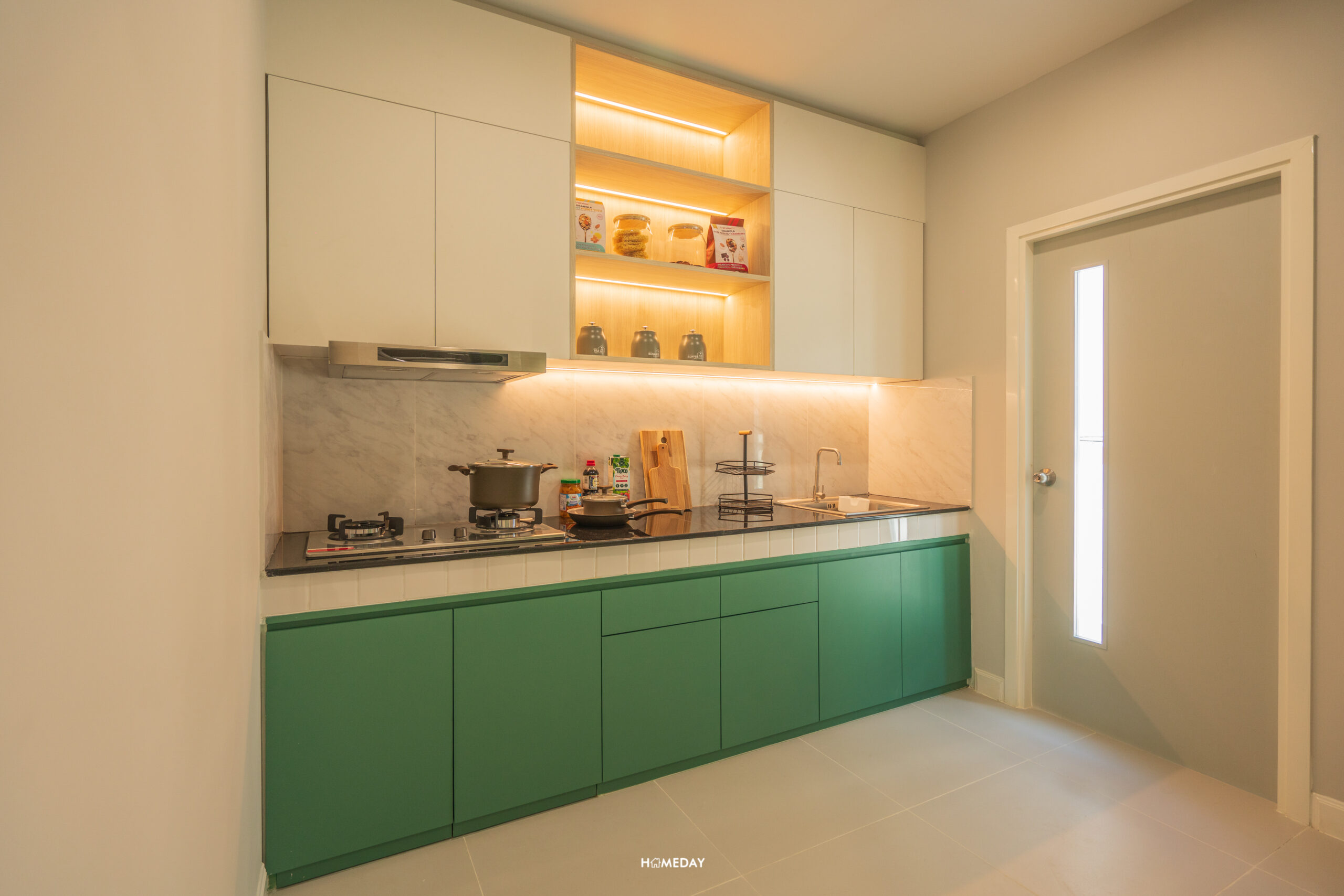 สำหรับบ้านตัวอย่าง เลือกบิลต์อิน Pantry เพิ่มเติมให้ดูเป็นไอเดีย สามารถใส่ตู้เย็น, ซิงก์ล้างจาน, เครื่องปิ้งขนมปัง, เครื่องชงกาแฟ, เตาไฟฟ้า ฯลฯ สำหรับทำอาหารเช้าง่าย ๆ ได้เลย หรือจะใช้เก็บขนมและเครื่องดื่มก็หยิบทานได้สะดวกดีครับ