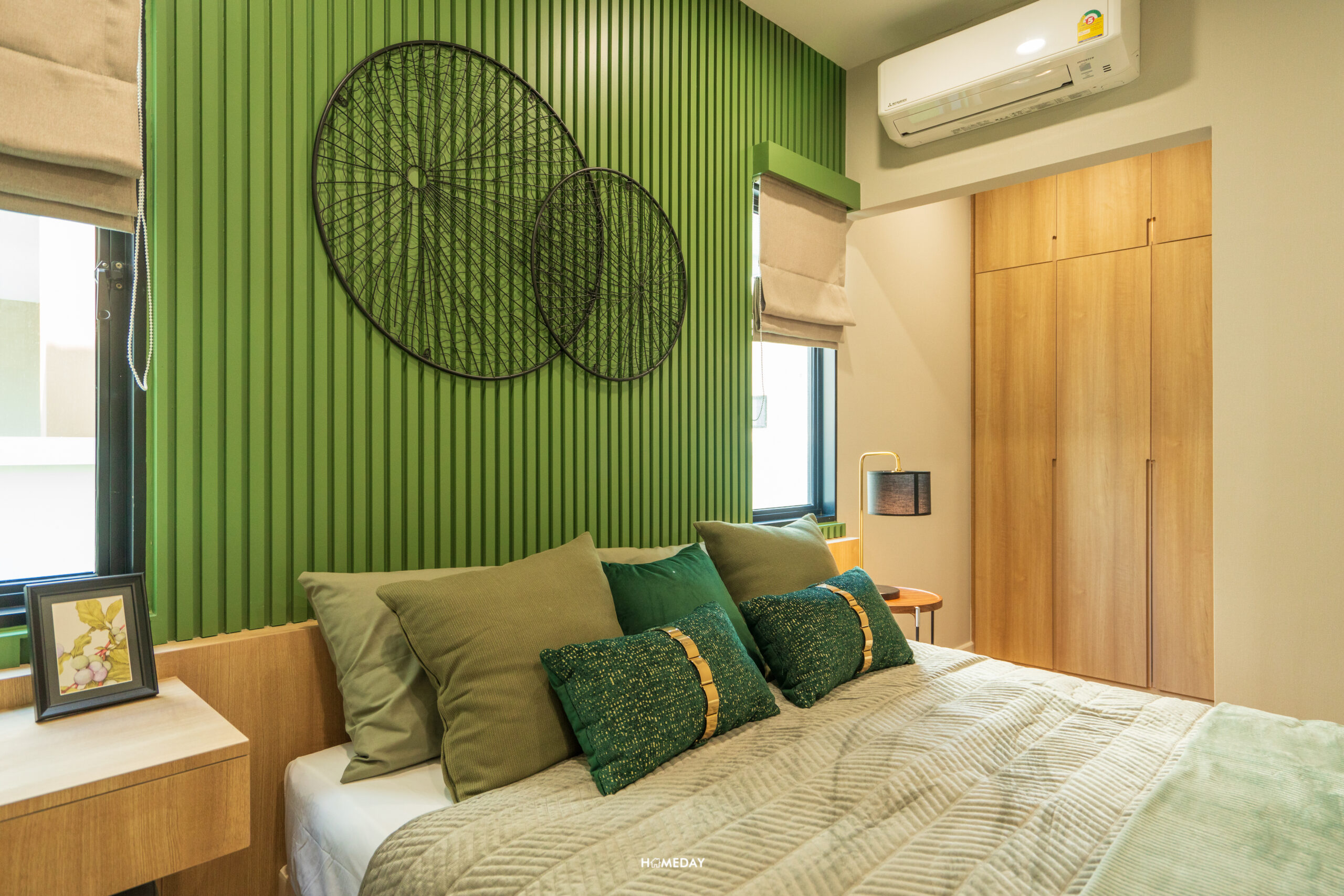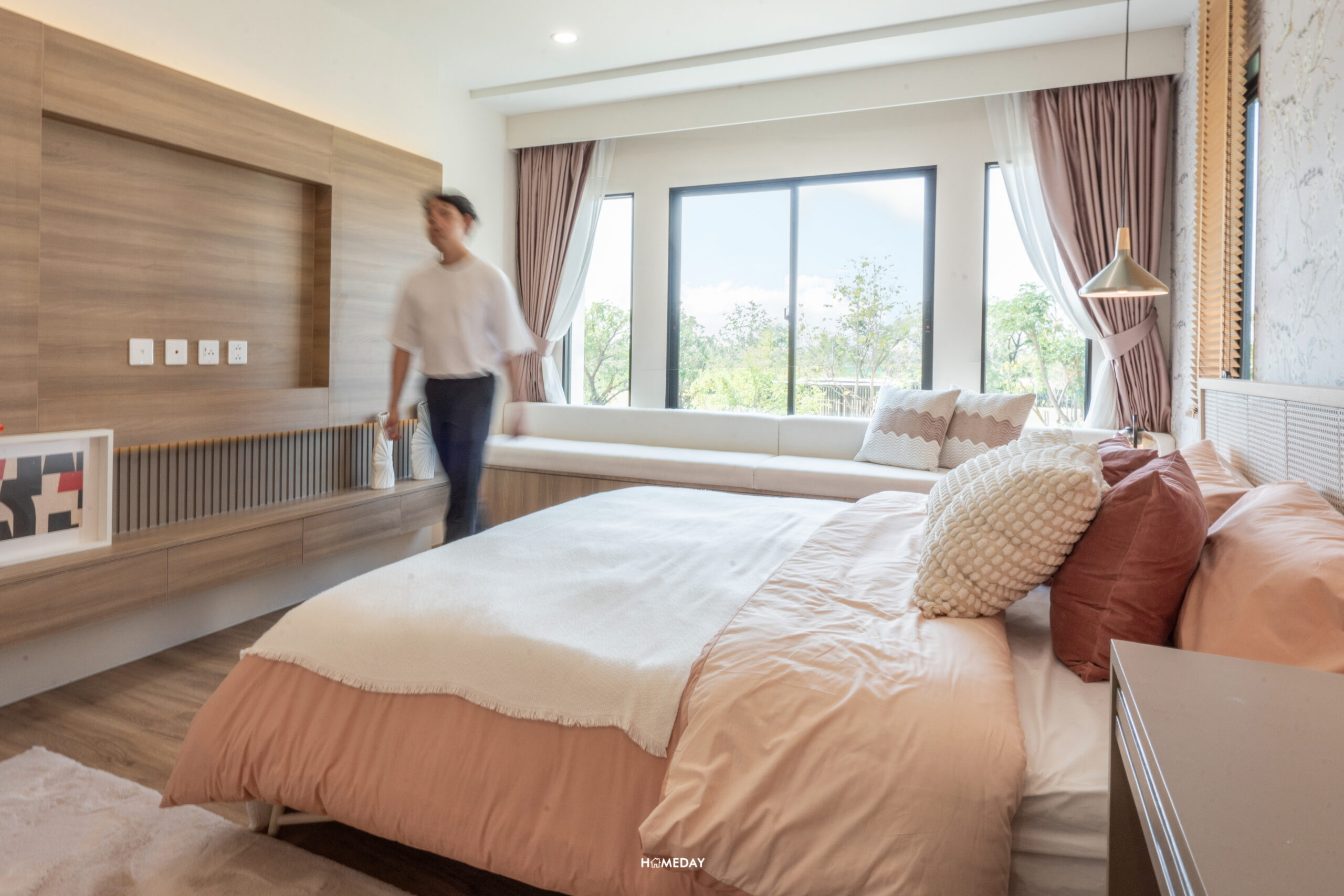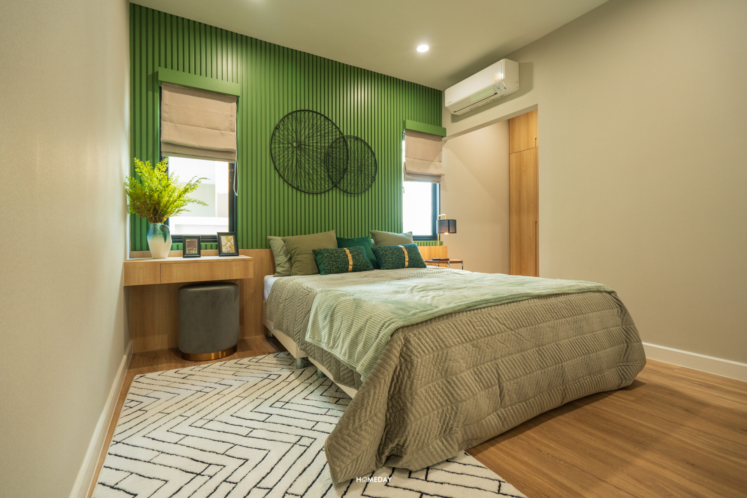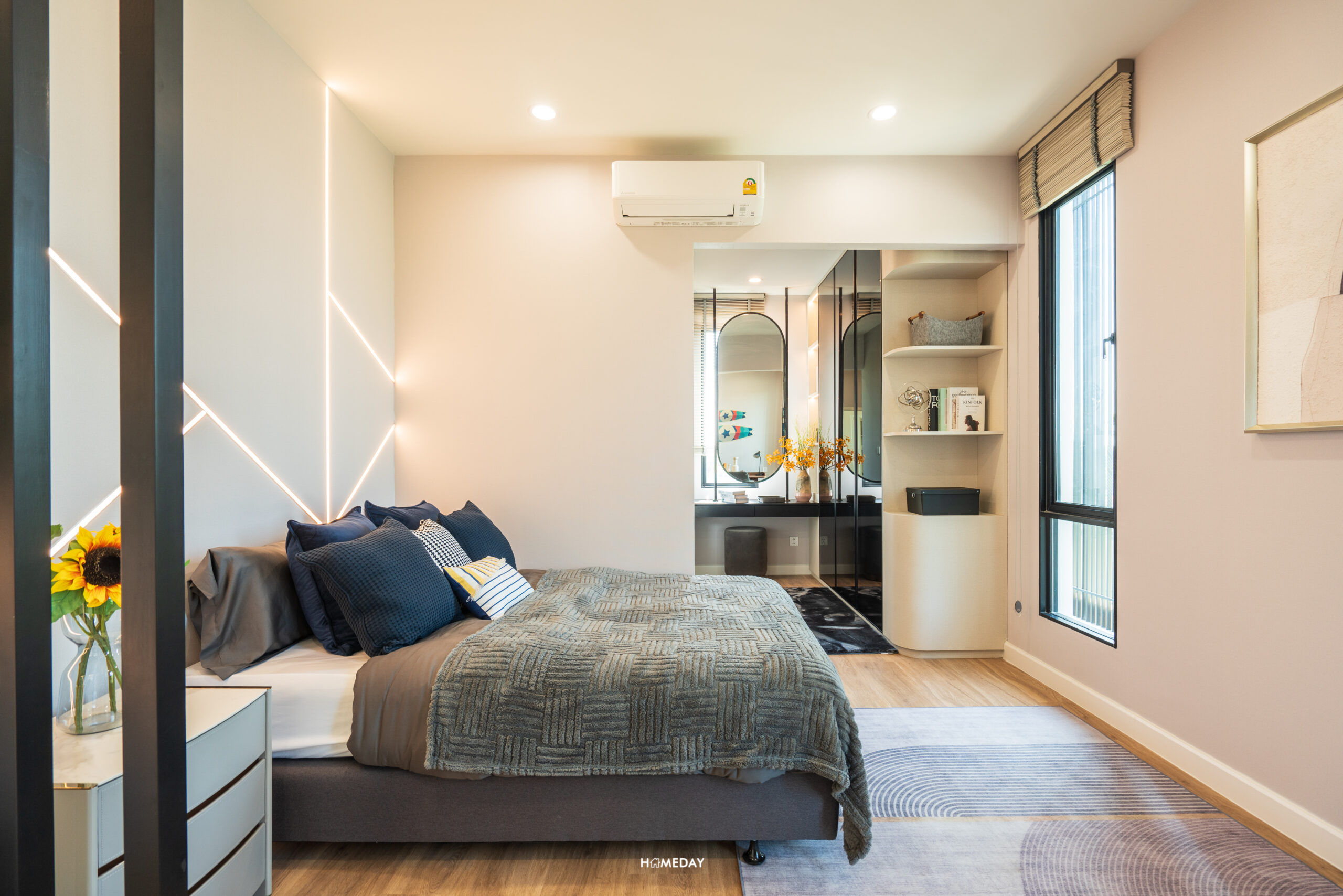พื้นที่วางเตียงรองรับขนาด 6 ฟุตได้สบาย ๆ เหลือพื้นที่รอบเตียงให้ใช้งานได้อีกหลากหลายฟังก์ชัน โดยบ้านตัวอย่างตกแต่งไว้ให้ดูเป็นโต๊ะหัวเตียงสองฝั่ง ปลายเตียงบิลต์อินเป็นโต๊ะยาวที่ออกแบบให้ใช้งานได้แบบอเนกประสงค์ สามารถใช้จัดเก็บของ, แขวนทีวี และใช้เป็นโต๊ะทำงานได้ในตัว โดยยังเหลือพื้นที่รอบ ๆ เตียงให้สามารถเดินผ่านได้สะดวก