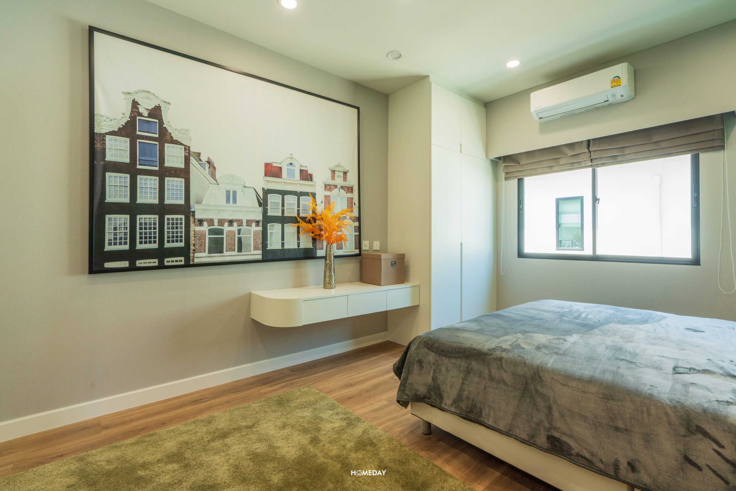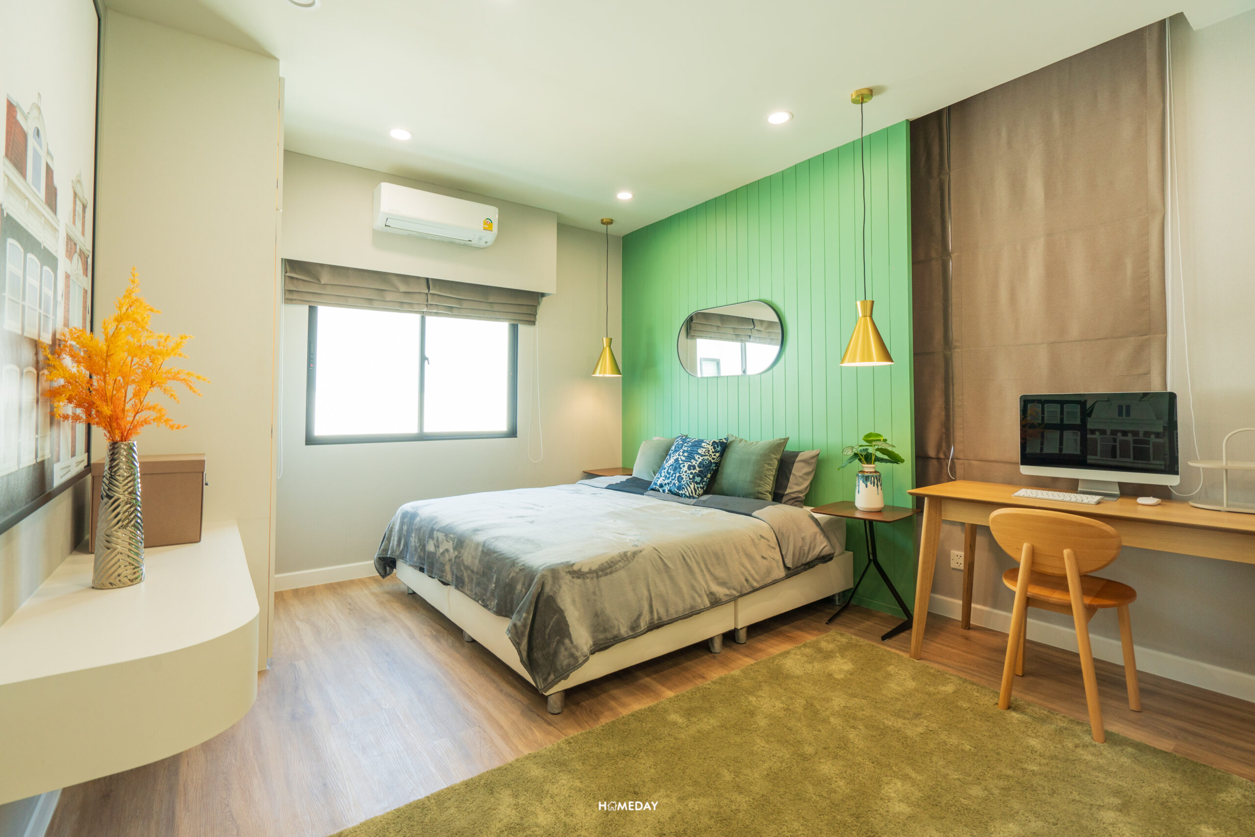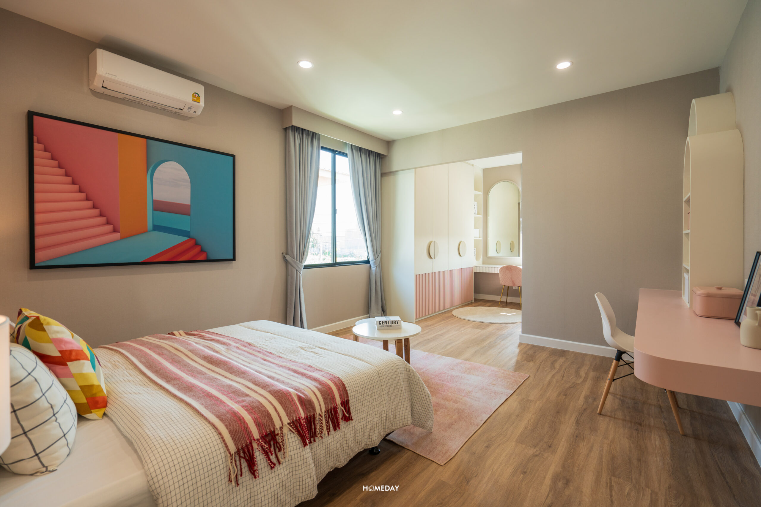 พื้นที่วางเตียงรองรับขนาด 6 ฟุตได้สบาย ๆ เหลือพื้นที่รอบเตียงให้ใช้งานได้อีกหลากหลายฟังก์ชัน โดยบ้านตัวอย่างตกแต่งไว้ให้ดูเป็นโต๊ะหัวเตียงสองฝั่ง ปลายเตียงบิลต์อินเป็นโต๊ะยาวที่ออกแบบให้ใช้งานได้แบบอเนกประสงค์ สามารถใช้จัดเก็บของ, แขวนทีวี และใช้เป็นโต๊ะทำงานได้ในตัว โดยยังเหลือพื้นที่รอบ ๆ เตียงให้สามารถเดินผ่านได้สะดวก