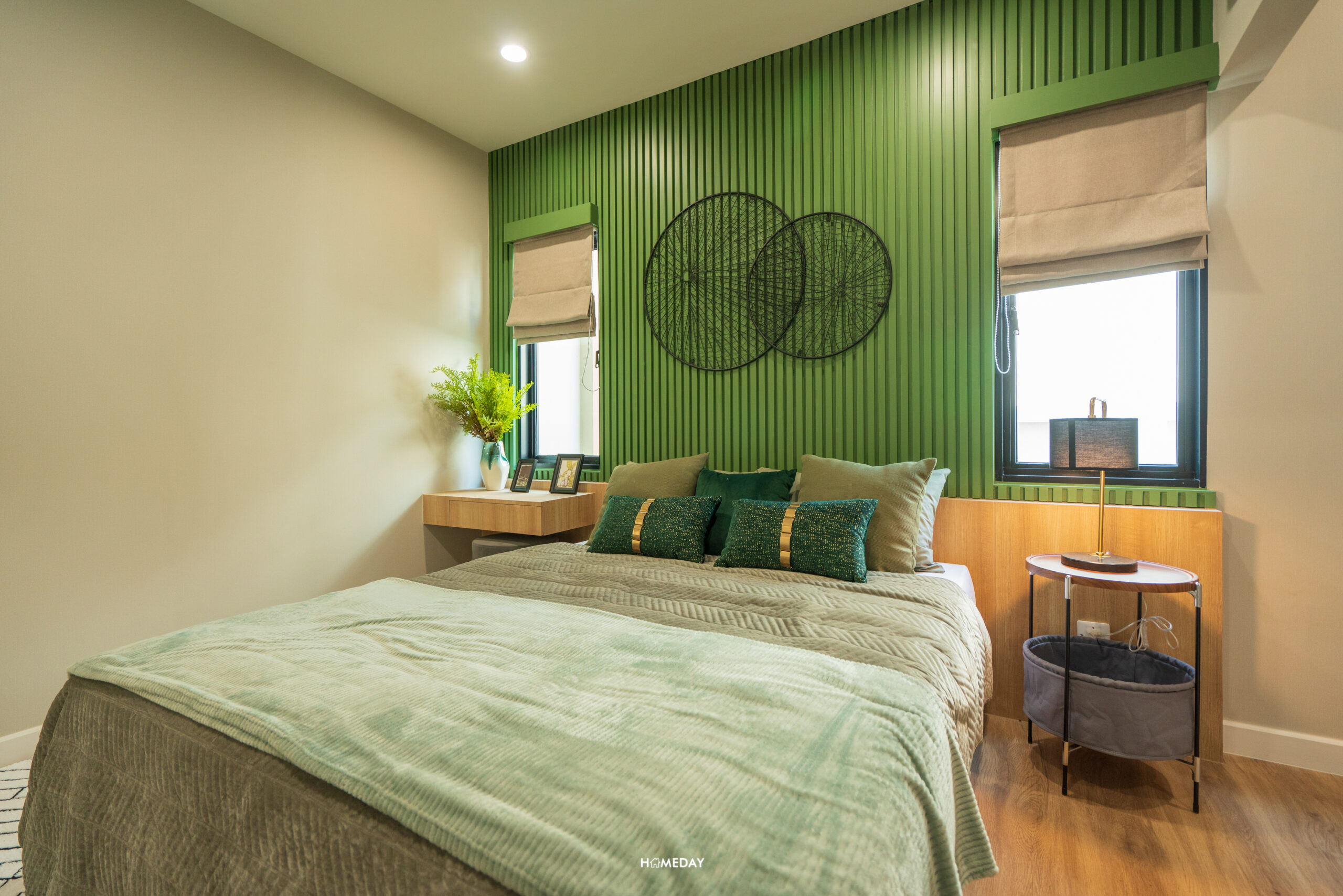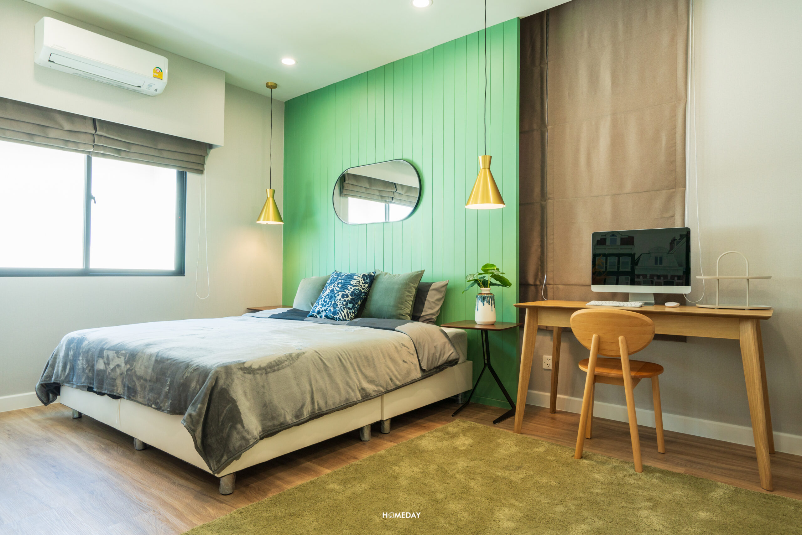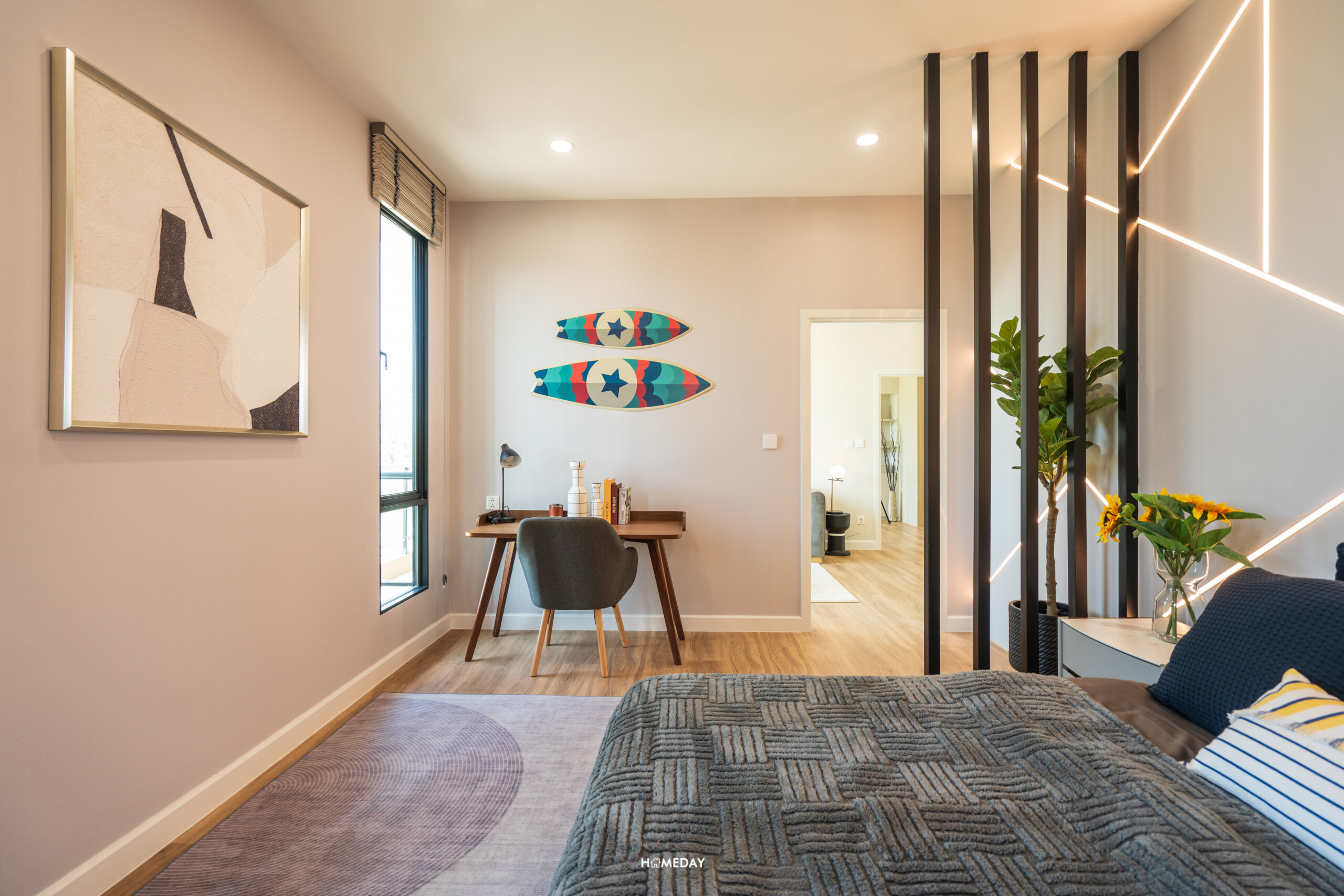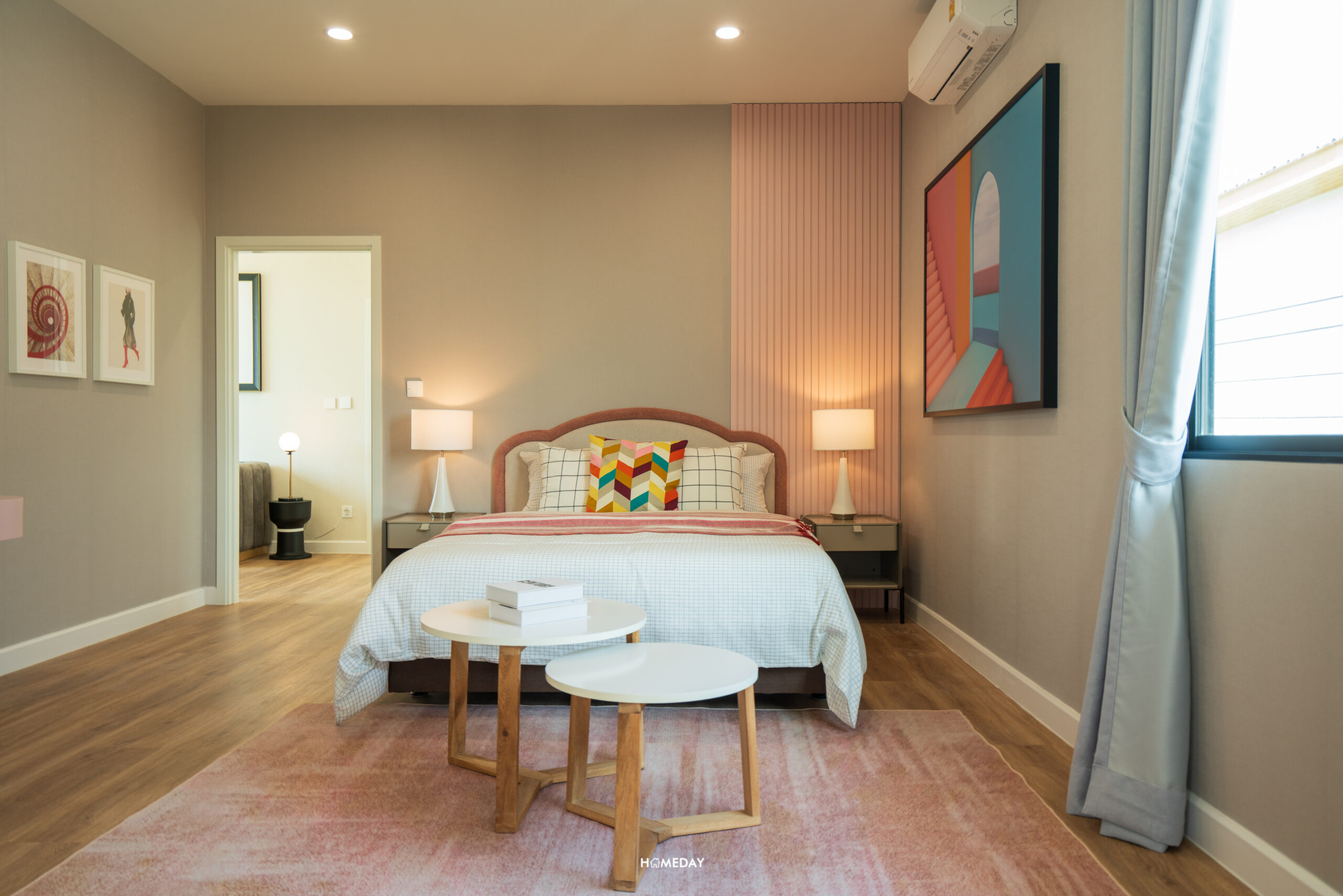 พื้นที่วางเตียงรองรับขนาด 6 ฟุตได้สบาย ๆ เหลือพื้นที่รอบเตียงให้ใช้งานได้อีกหลากหลายฟังก์ชัน โดยบ้านตัวอย่างตกแต่งไว้ให้ดูเป็นโต๊ะหัวเตียงสองฝั่ง ปลายเตียงบิลต์อินเป็นโต๊ะยาวที่ออกแบบให้ใช้งานได้แบบอเนกประสงค์ สามารถใช้จัดเก็บของ, แขวนทีวี และใช้เป็นโต๊ะทำงานได้ในตัว โดยยังเหลือพื้นที่รอบ ๆ เตียงให้สามารถเดินผ่านได้สะดวก