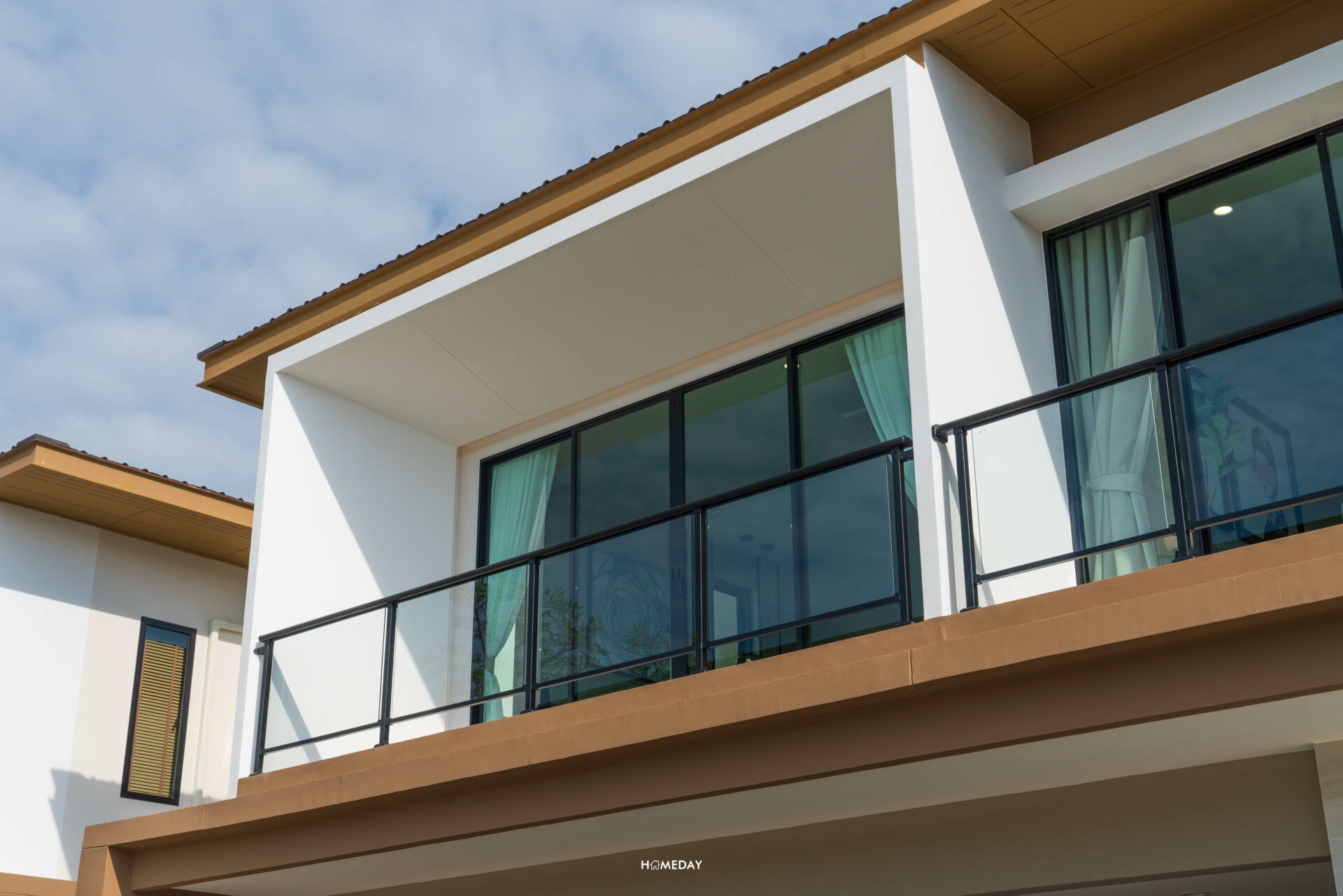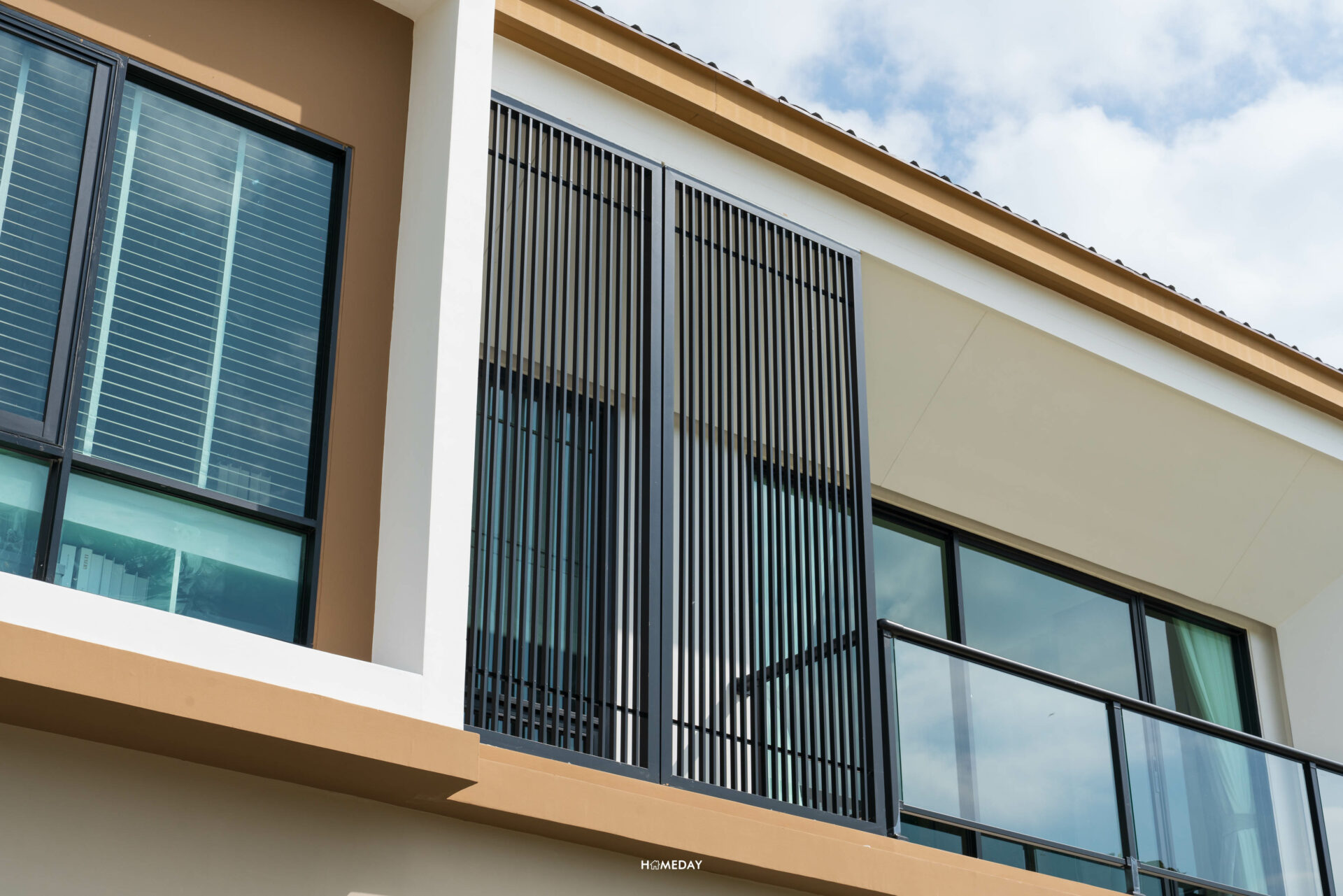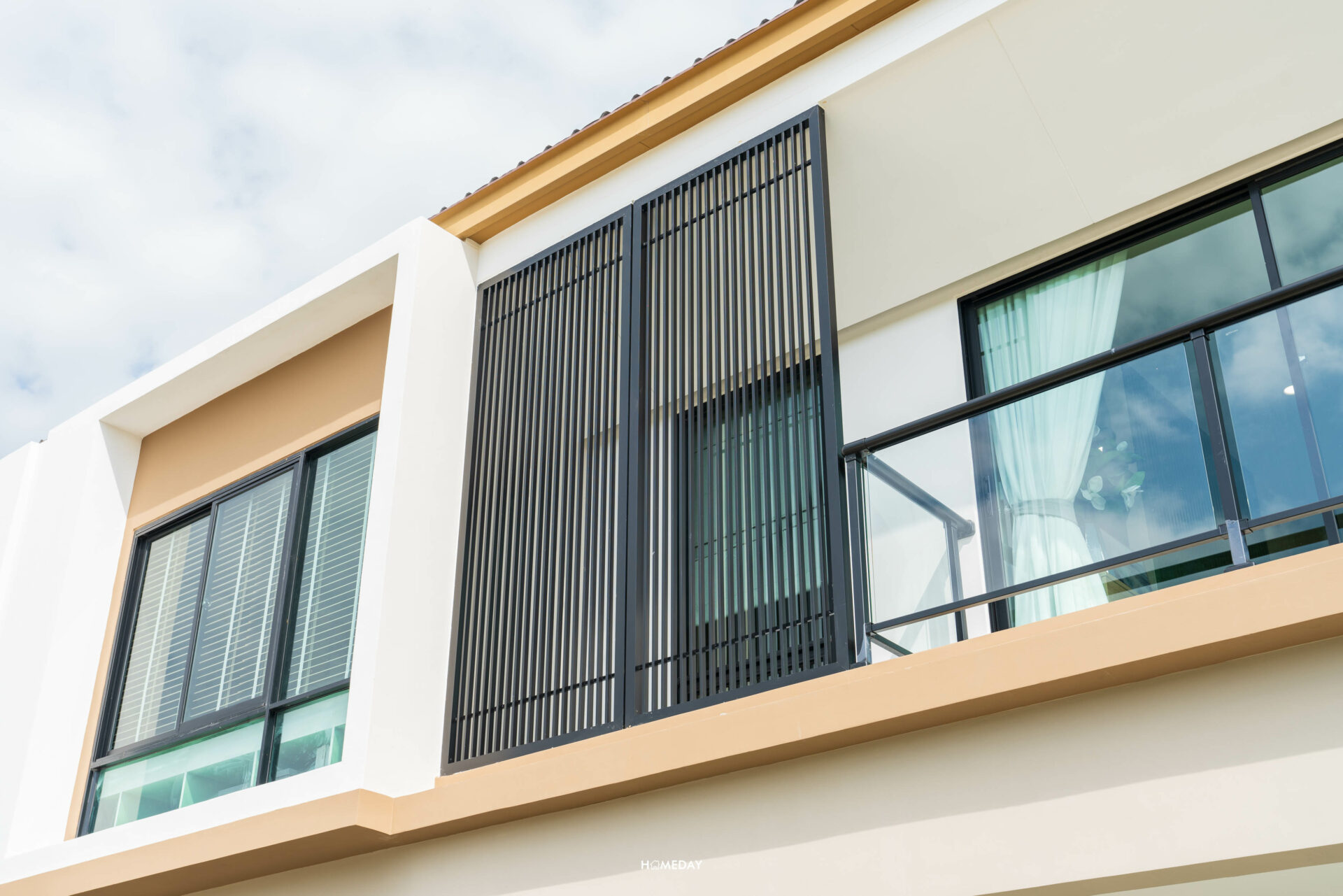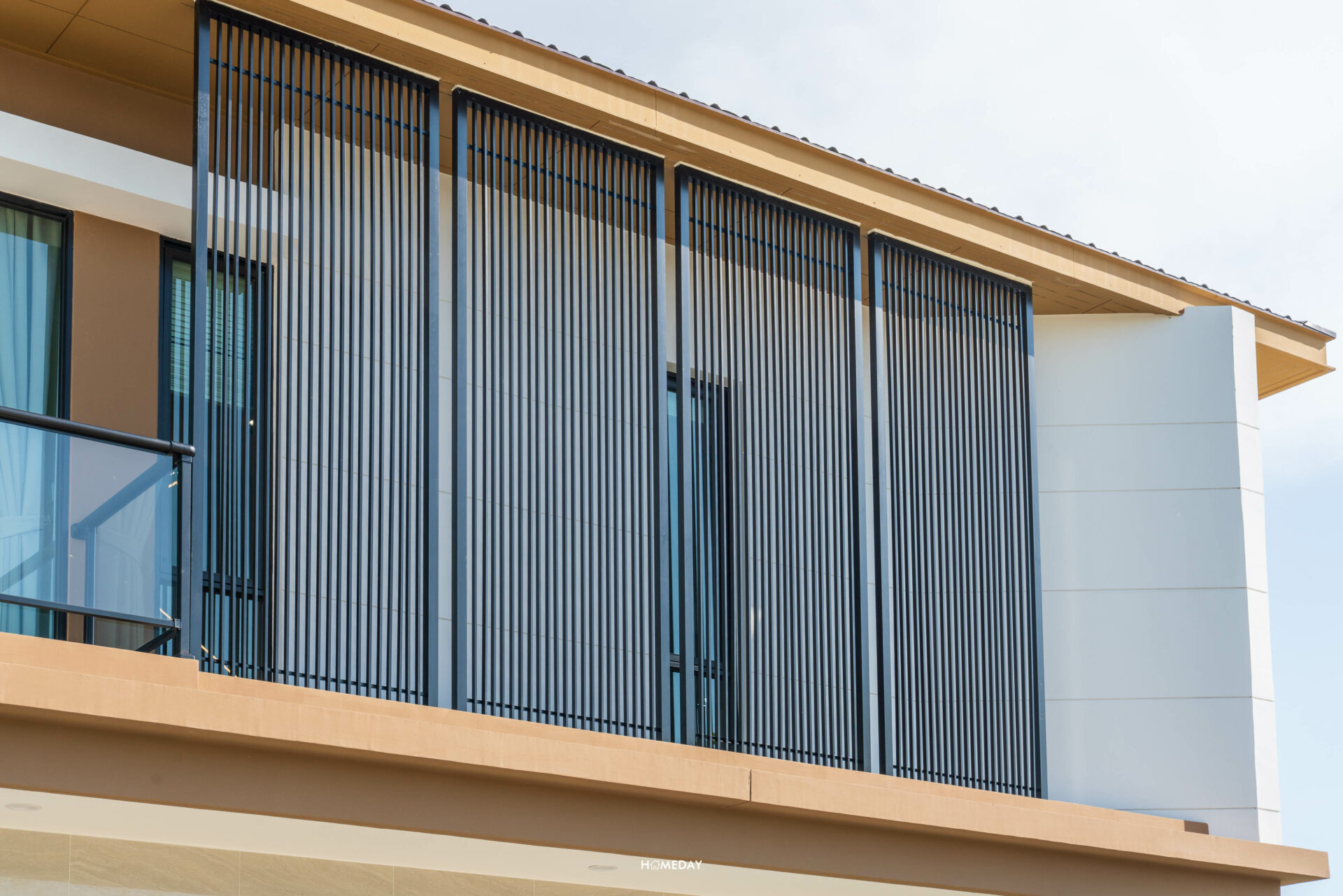 ดีไซน์ของ Facade ยังคงเอกลักษณ์ สวยงาม สไตล์เดียวกันครับ แตกต่างที่แบบบ้านนี้จะได้เพิ่มเติมในส่วนของระเบียงมาด้วย วัสดุราวระเบียงเป็นโครงเหล็กชุบกัลวาไนซ์ ทำสี Powder Coat ตัวกระจกระเบียงเป็นกระจกเทมเปอร์หนา 8 มิลลิเมตร