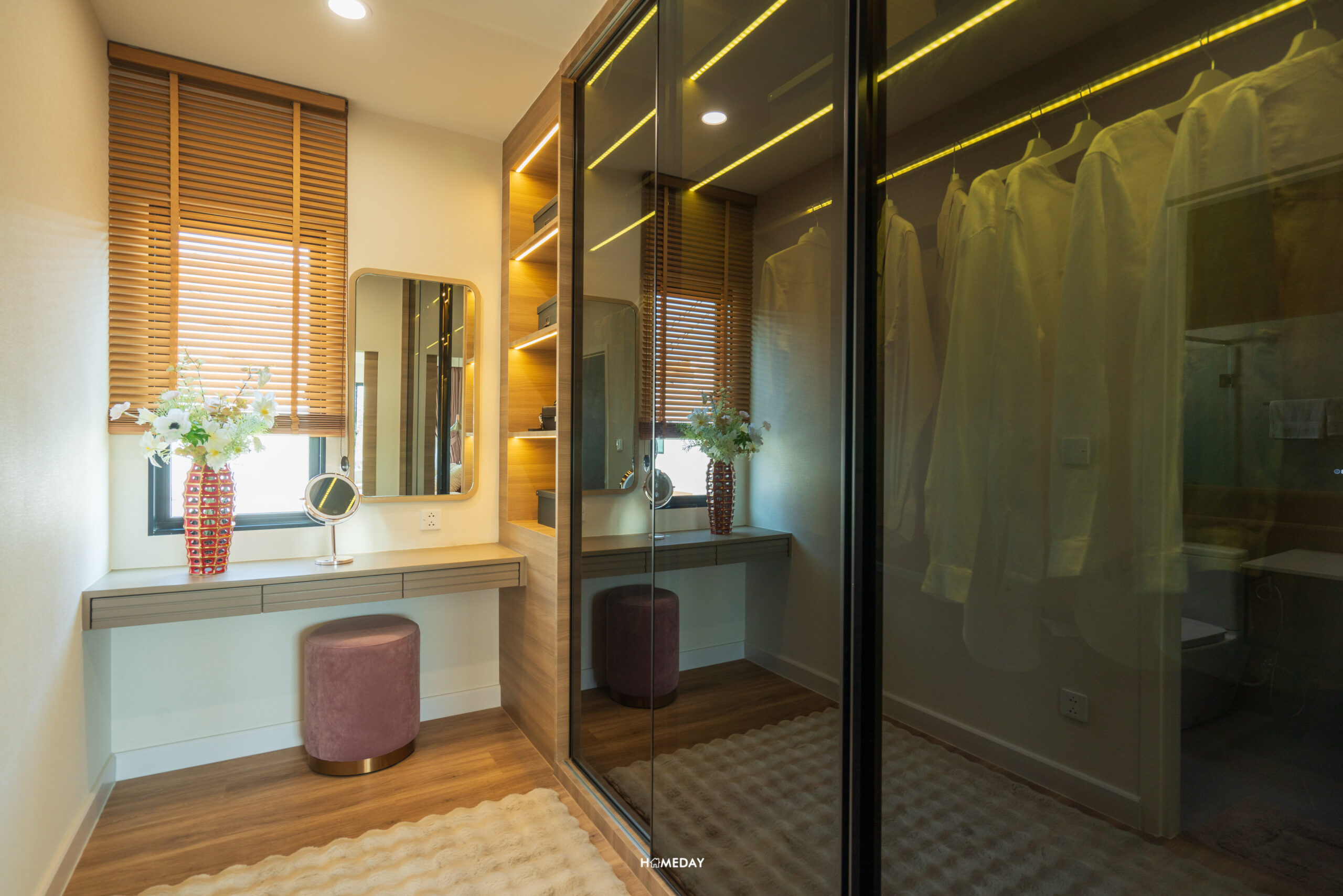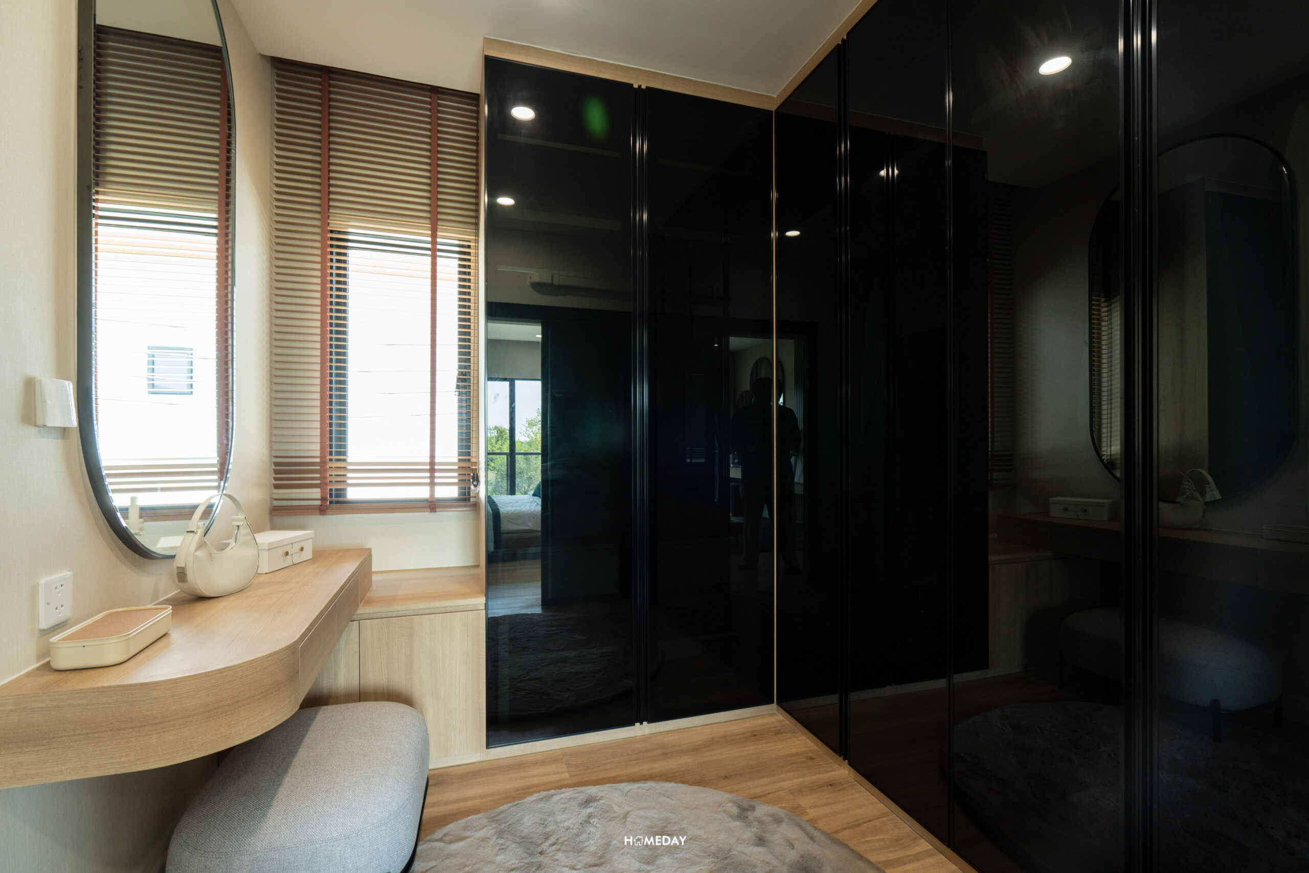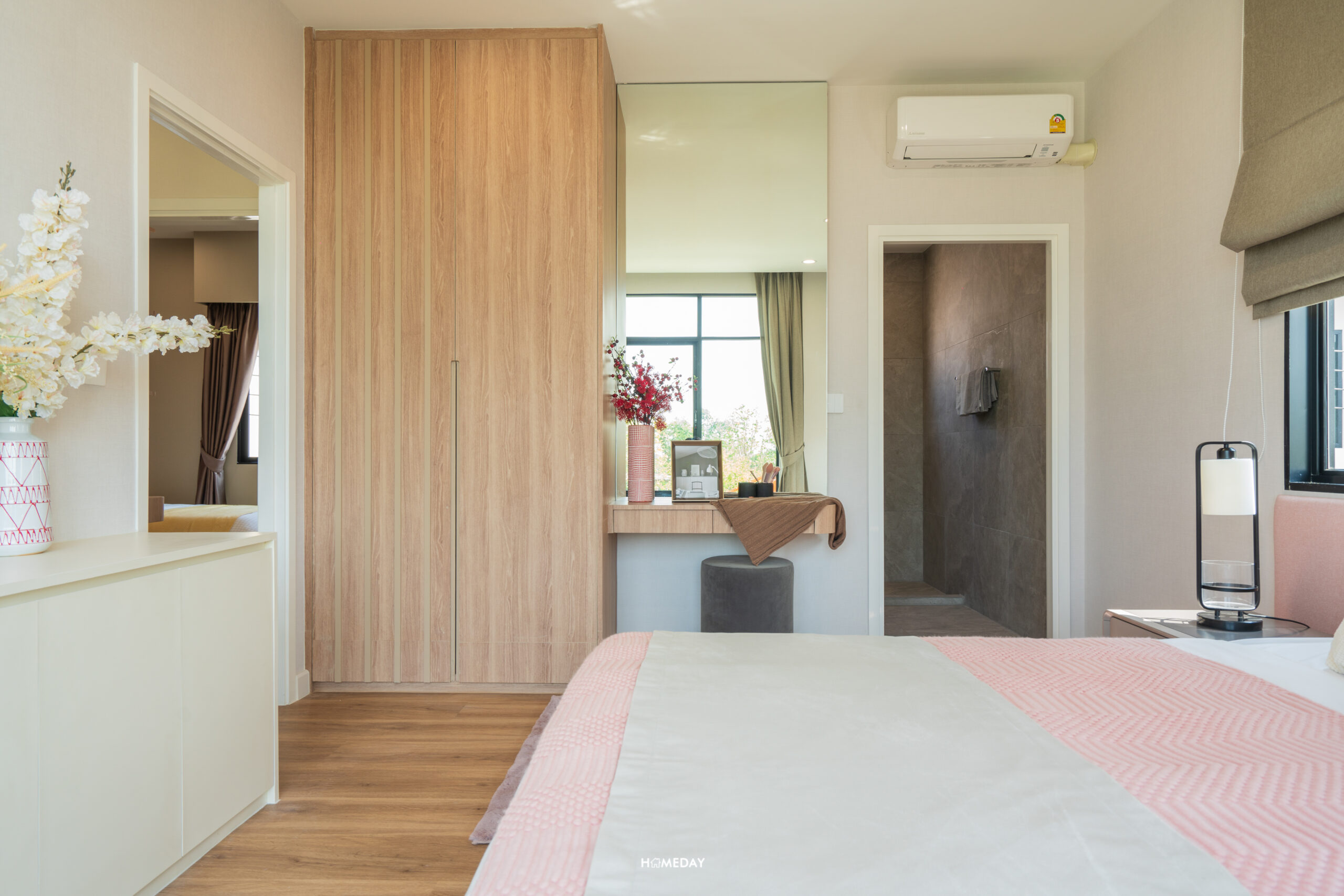 ถัดเข้าไปด้านในสุด จะเป็นพื้นที่รองรับ Walk-in Closet อยู่เชื่อมต่อกับห้องน้ำ สามารถบิลต์อินตู้เสื้อผ้าขนาดใหญ่เข้ามุมพร้อมด้วยโต๊ะเครื่องแป้งได้อย่างลงตัว มีบานหน้าต่างรับแสงมาให้ นั่งแต่งหน้าจากแสงธรรมชาติได้เลยครับ