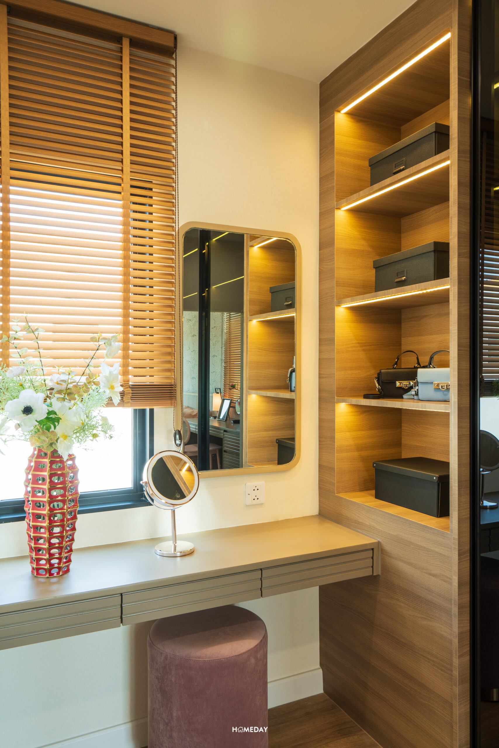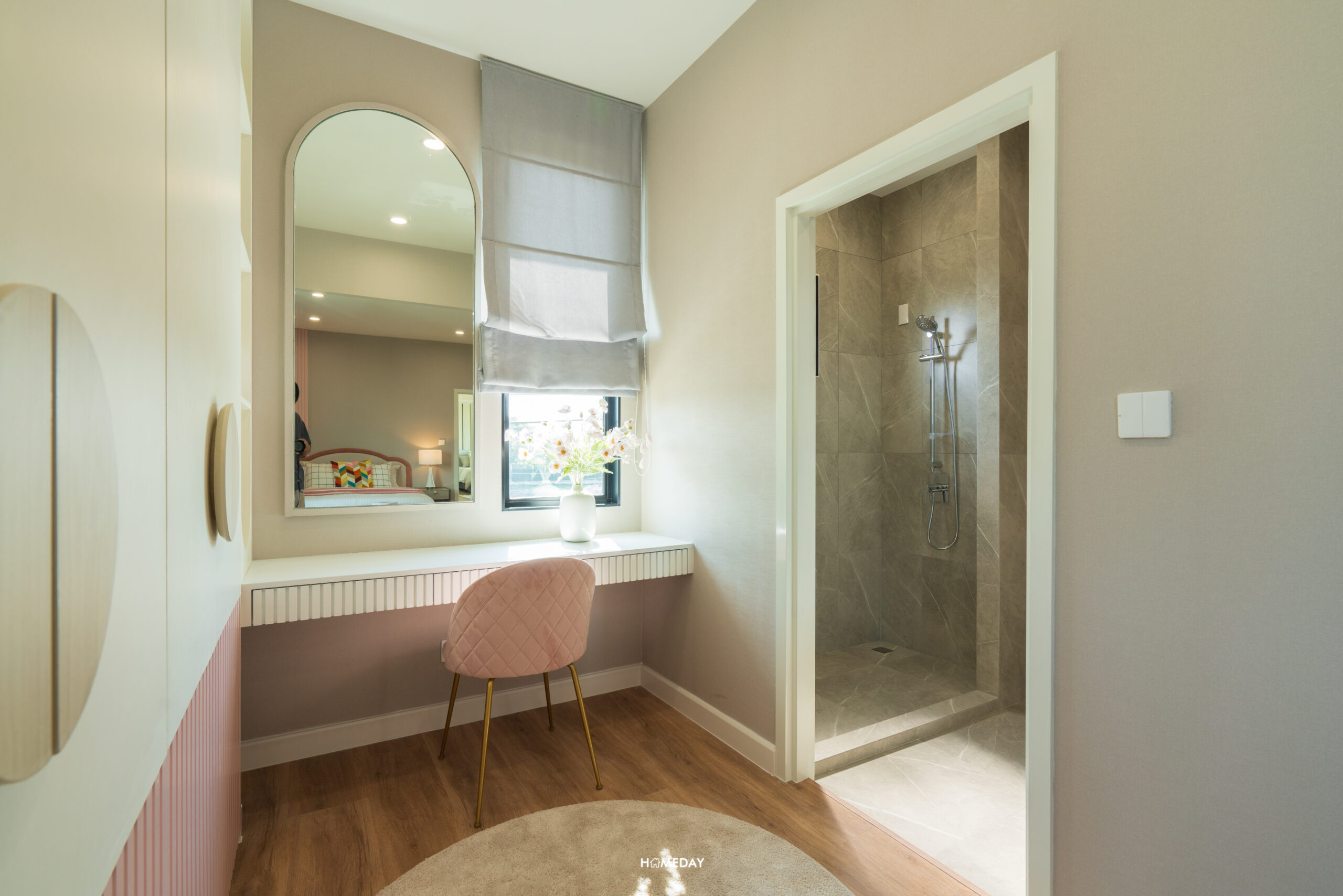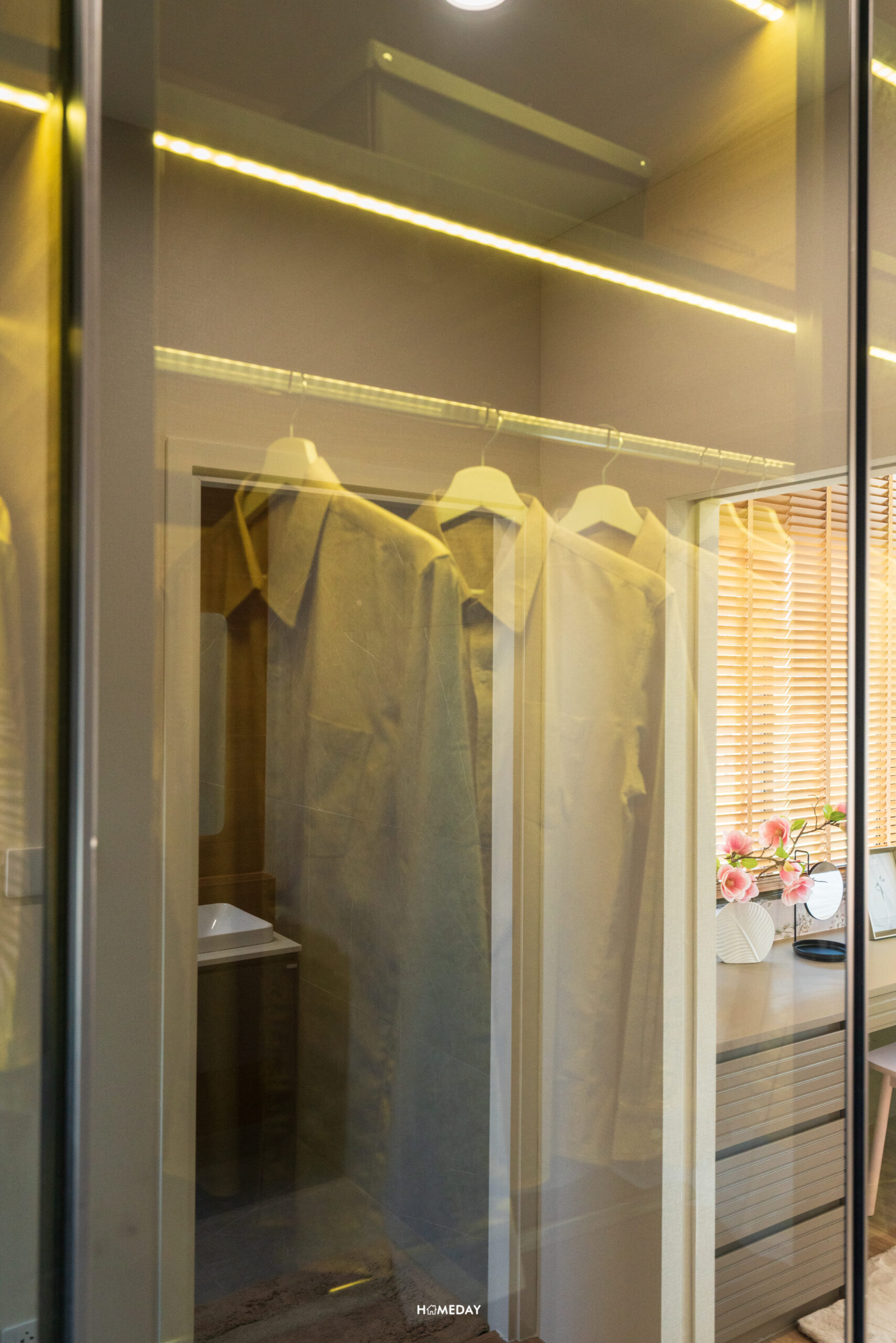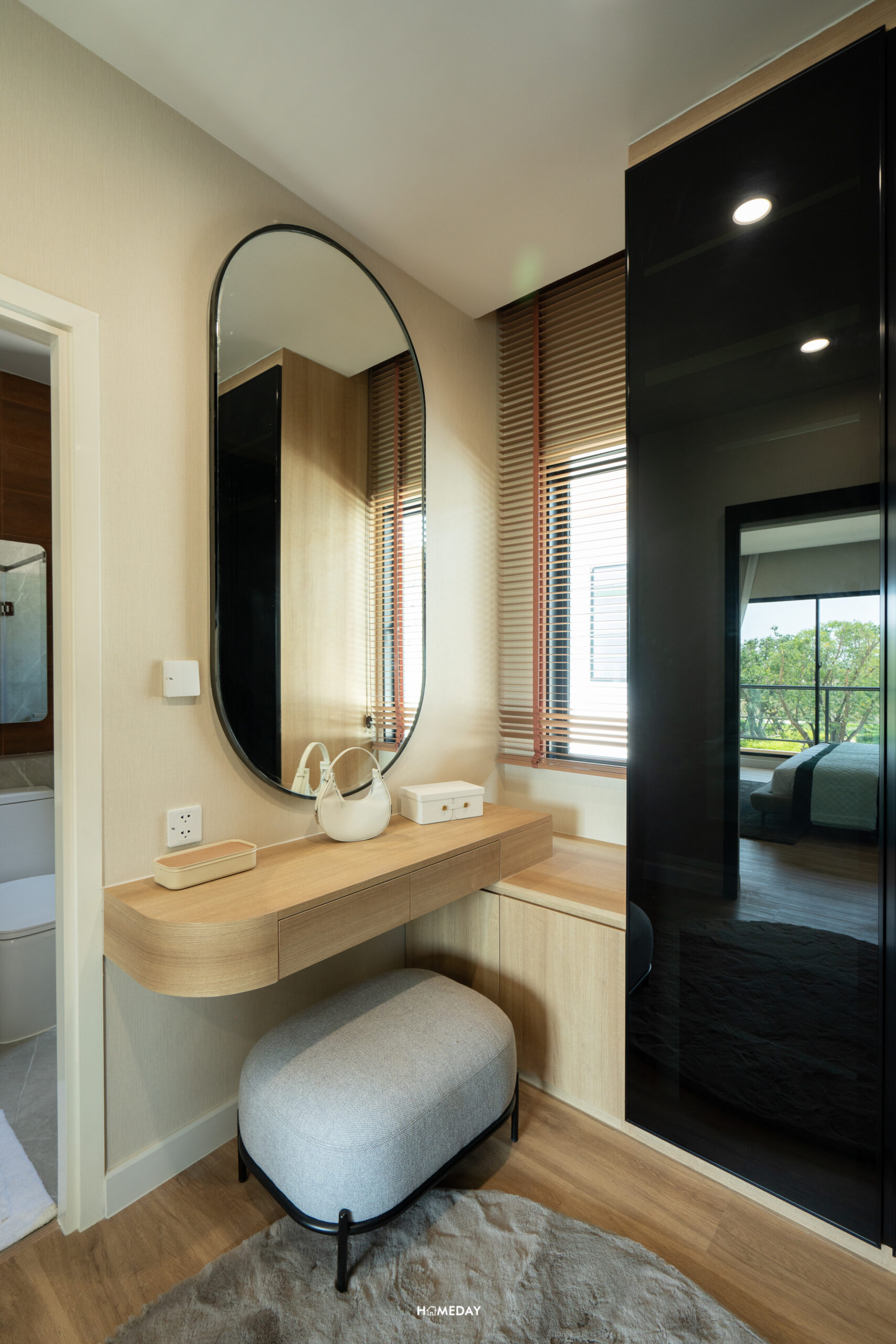 ถัดเข้าไปด้านในสุด จะเป็นพื้นที่รองรับ Walk-in Closet อยู่เชื่อมต่อกับห้องน้ำ สามารถบิลต์อินตู้เสื้อผ้าขนาดใหญ่เข้ามุมพร้อมด้วยโต๊ะเครื่องแป้งได้อย่างลงตัว มีบานหน้าต่างรับแสงมาให้ นั่งแต่งหน้าจากแสงธรรมชาติได้เลยครับ