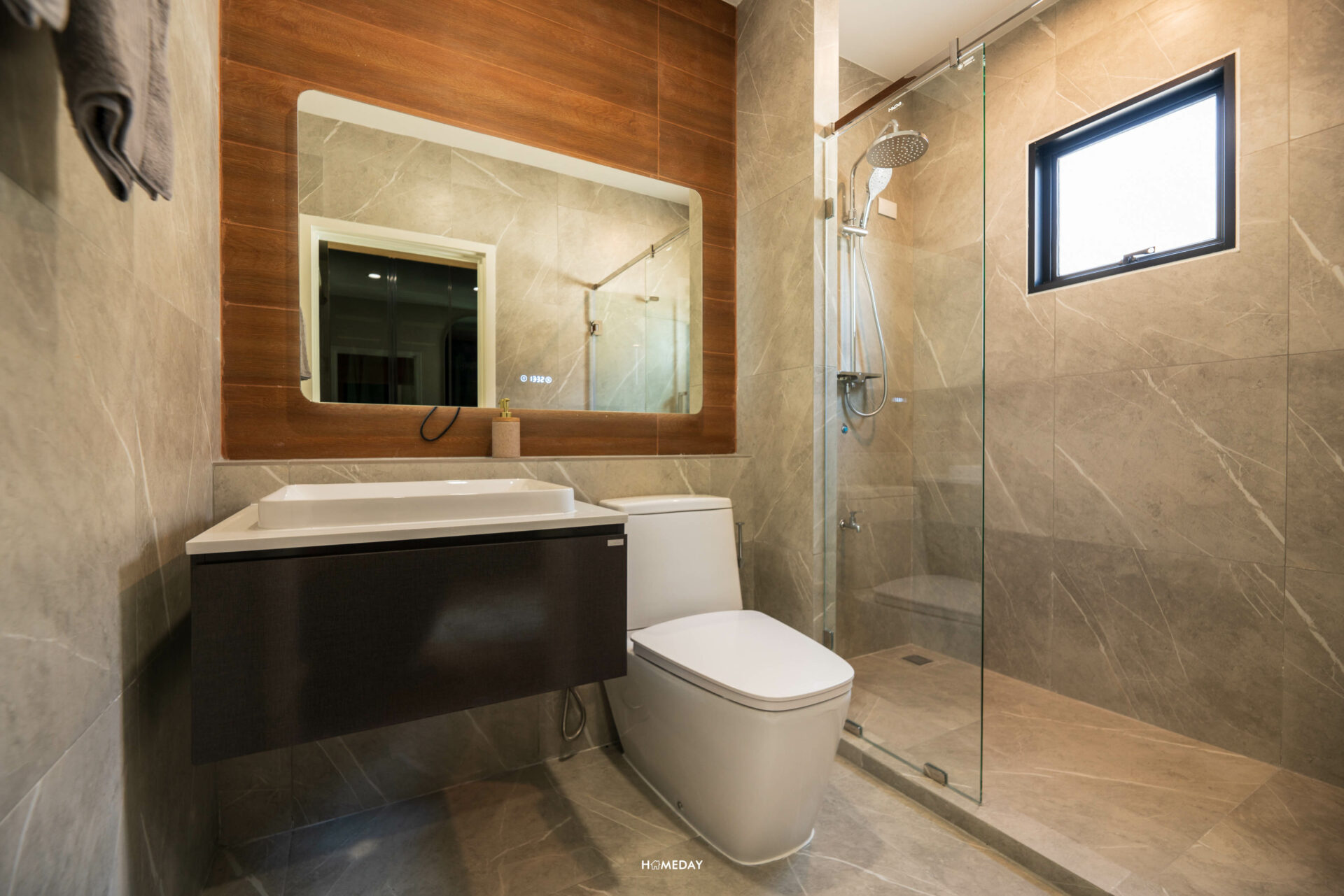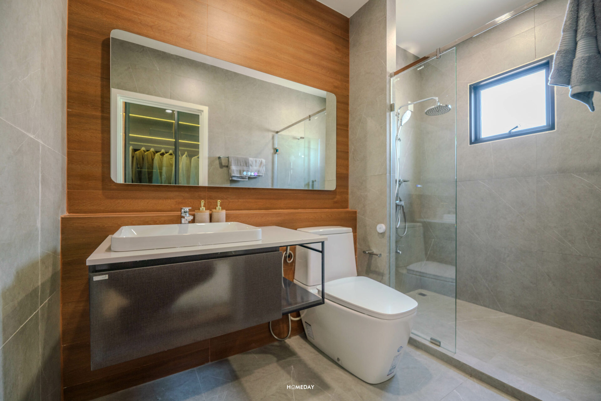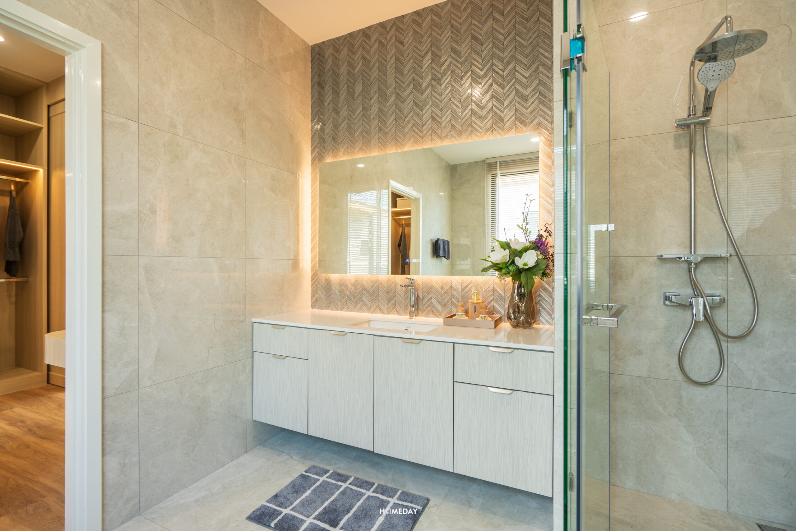 ส่วน Master Bathroom ก็มาพร้อมกับกระจก LED อีกเช่นเคย ฟังก์ชันเหมือนกันกับห้องน้ำรับแขกชั้นล่างเลยครับ โถสุขภัณฑ์ได้แบบ Touchless เช่นเดียวกัน ส่วนของอ่างล้างหน้า ได้ท็อปเคาน์เตอร์ที่ใหญ่ มาพร้อม Low Wall ยาวเต็มพื้นที่ส่วนแห้ง วางของได้เยอะและสะดวกมากขึ้น ส่วนใต้อ่างก็มาพร้อมกับบานตู้เก็บของและชั้นวางของจาก COTTO อีกเช่นเคย กันน้ำได้ 100% ดีไซน์สวยงาม เข้ากับห้องมาก ๆ ครับ Shower Box ได้กระจกกั้นอาบน้ำนิรภัย หนา 10 มิลลิเมตรแบบบานเปิด ภายในให้มาทั้ง Rain Shower และ Hand Shower เลยครับ