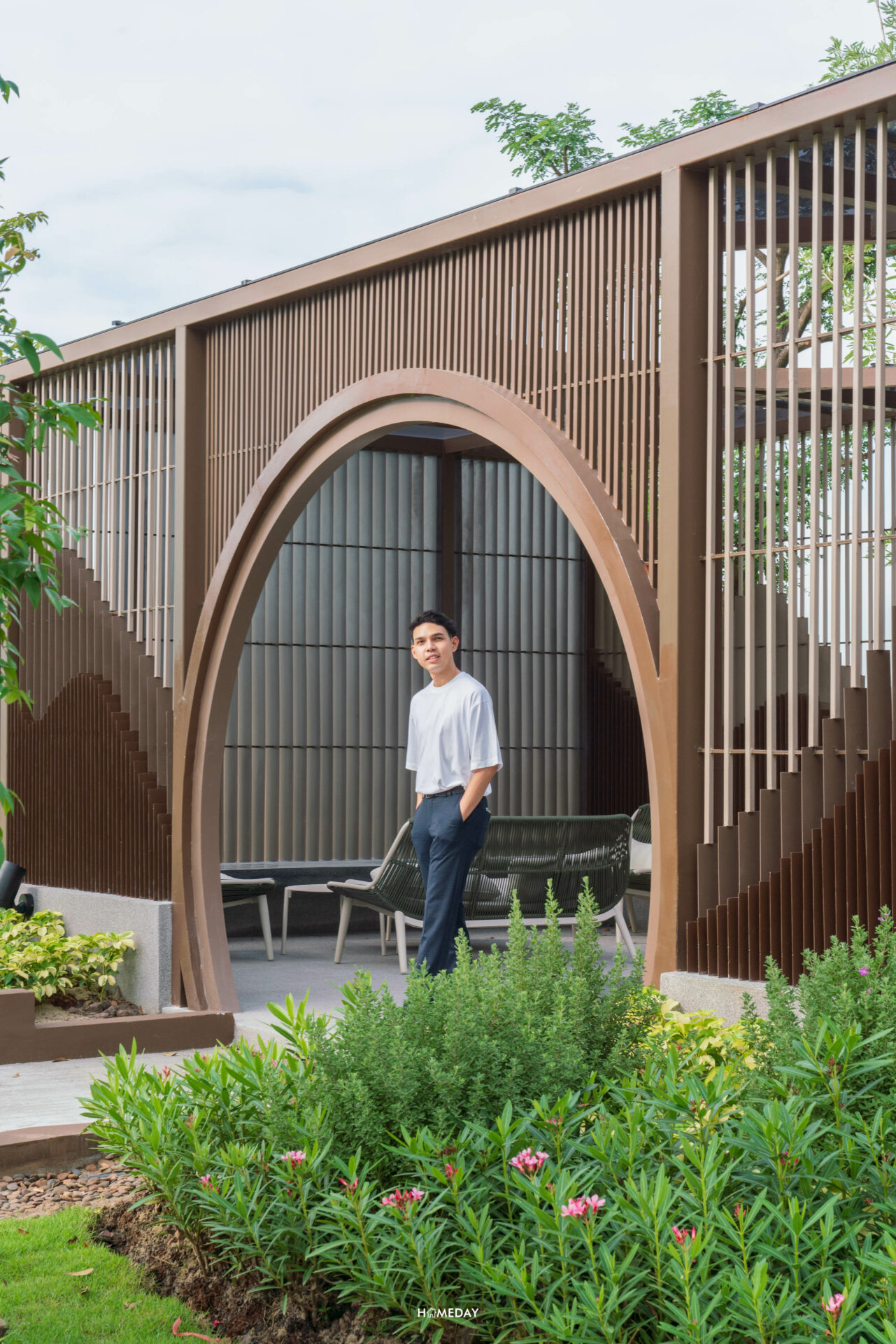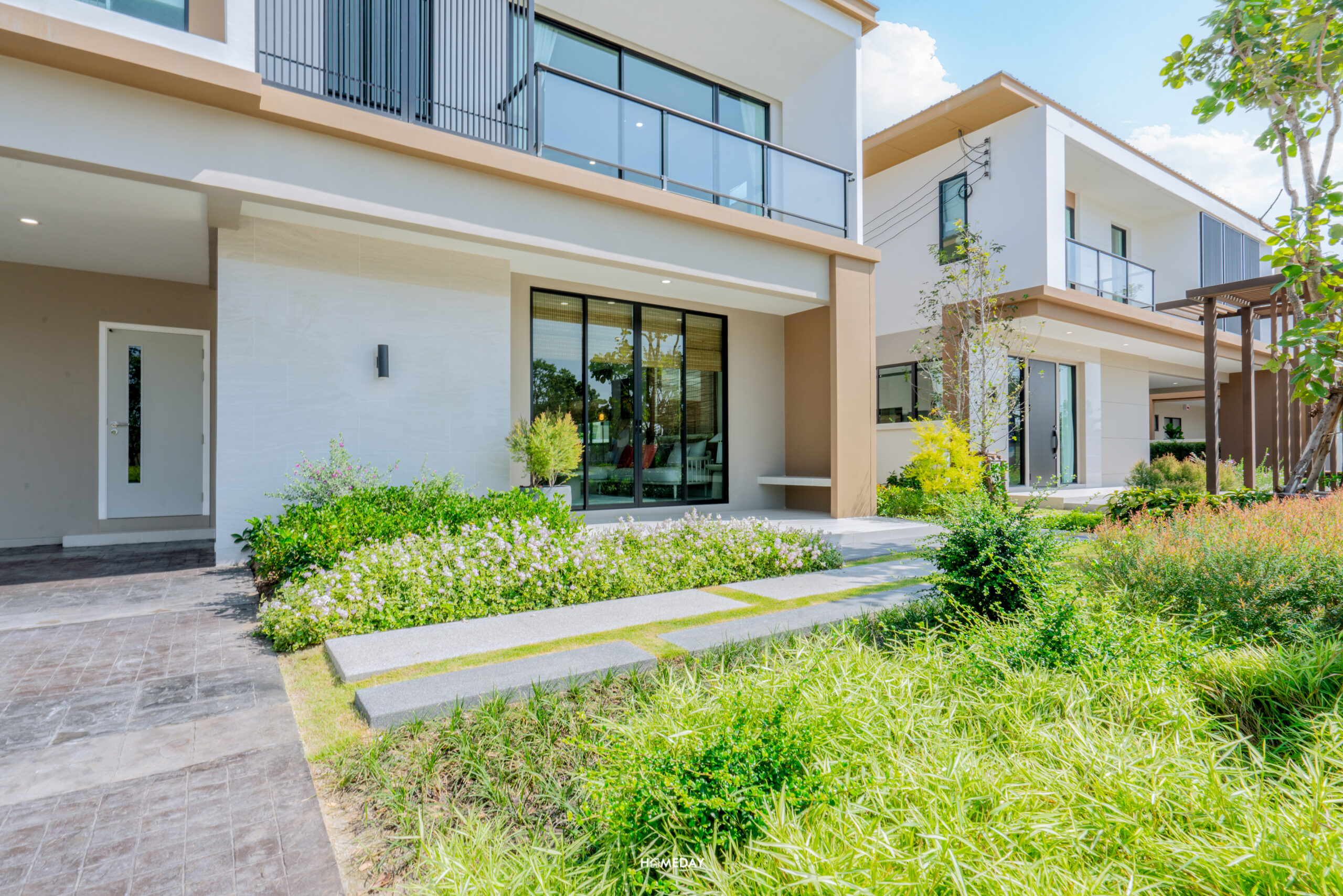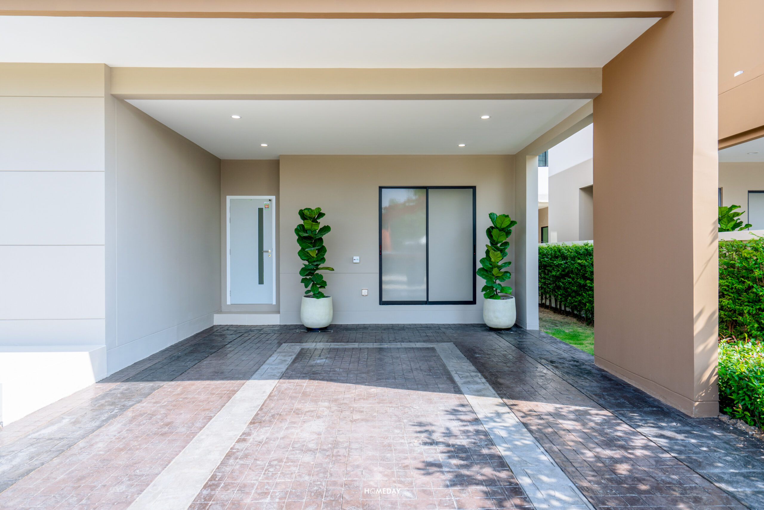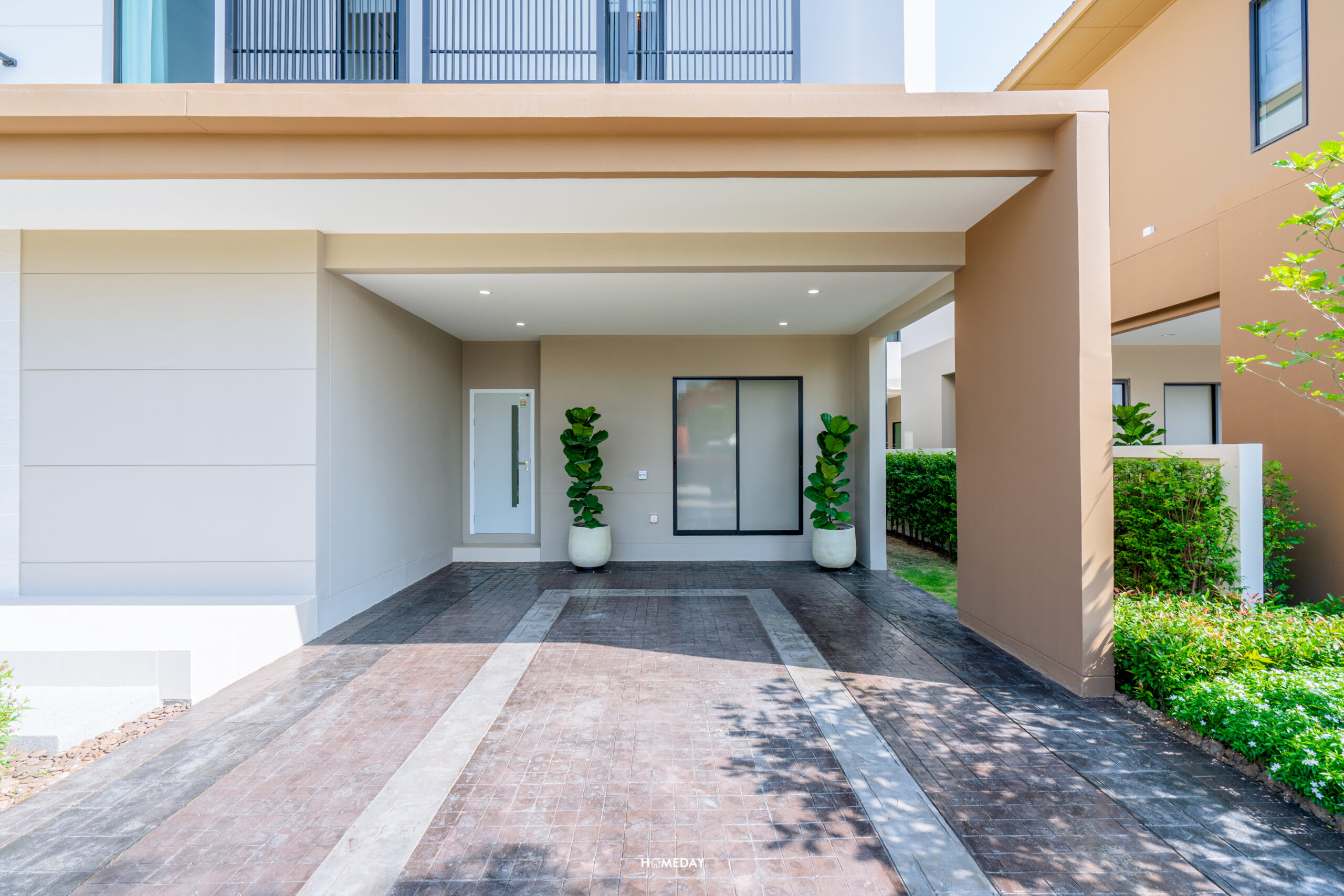 หลังนี้ Main Entrance หน้าบ้านได้ชานแบบกว้าง จะบิลต์อินตู้เก็บรองเท้า วางม้านั่ง หรือวางต้นไม้ประดับตกแต่งก็ได้เหมือนกัน พื้นที่บริเวณหน้าบ้านได้สวนขนาดใหญ่ ให้เราออกแบบมุมนั่งเล่นพักผ่อนตามสไตล์ของเราได้เลย แผงบังตาใช้วัสดุอลูมิเนียม วัสดุราวระเบียงเป็นโครงเหล็กชุบกัลวาไนซ์ ทำสี Powder Coat เหมือนกันทั้งคู่ ส่วนตัวกระจกระเบียงเป็นกระจกเทมเปอร์หนา 8 มิลลิเมตร ลานจอดรถหลังนี้จอดได้สูงสุดถึง 3 คัน ได้ประตูทางเข้าเชื่อมลานจอดรถ และยังมีพื้นที่เก็บของบานสไลด์ ให้ใช้งานเก็บอุปกรณ์ดูแลรถและสวนได้อย่างเป็นระเบียบเรียบร้อย
