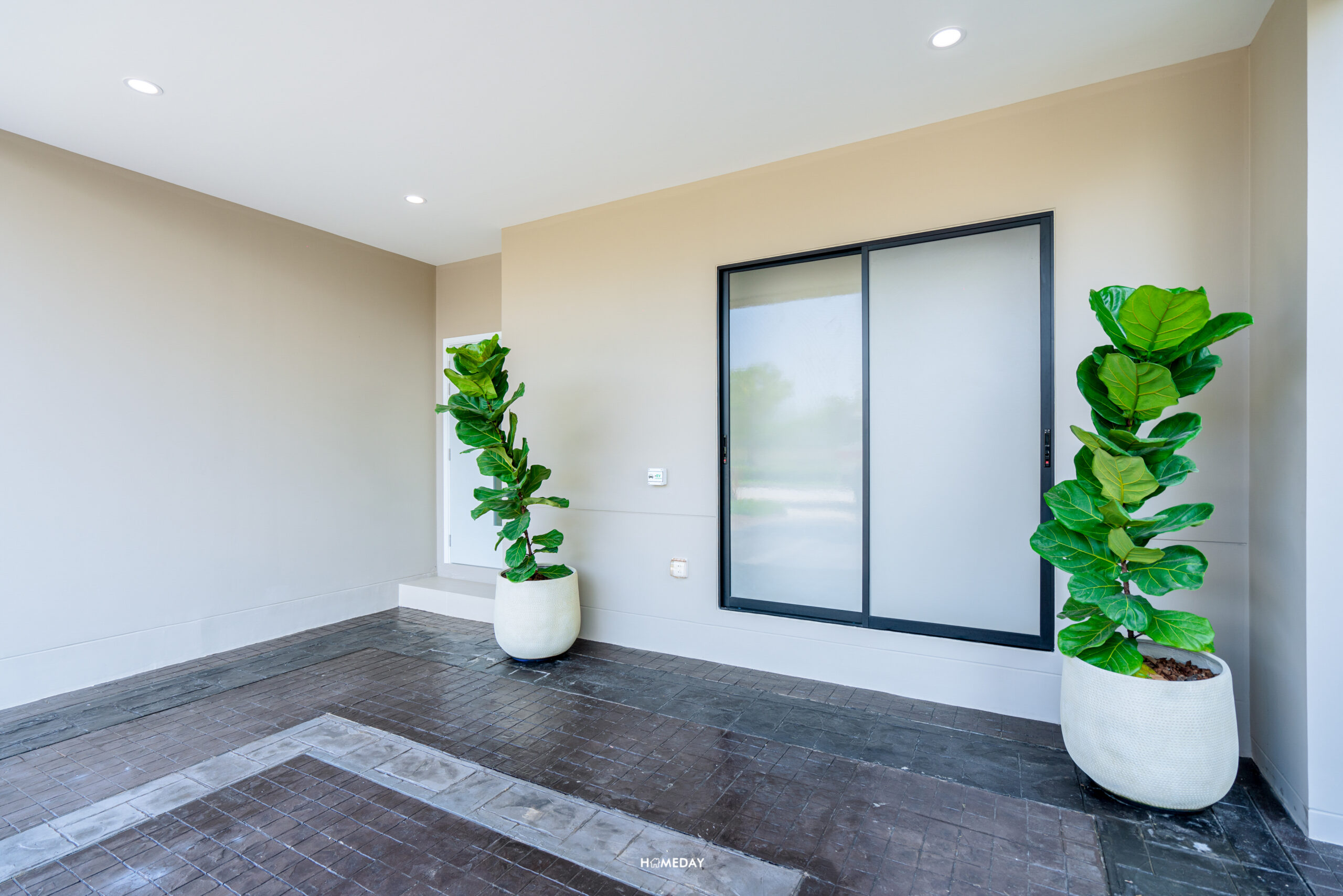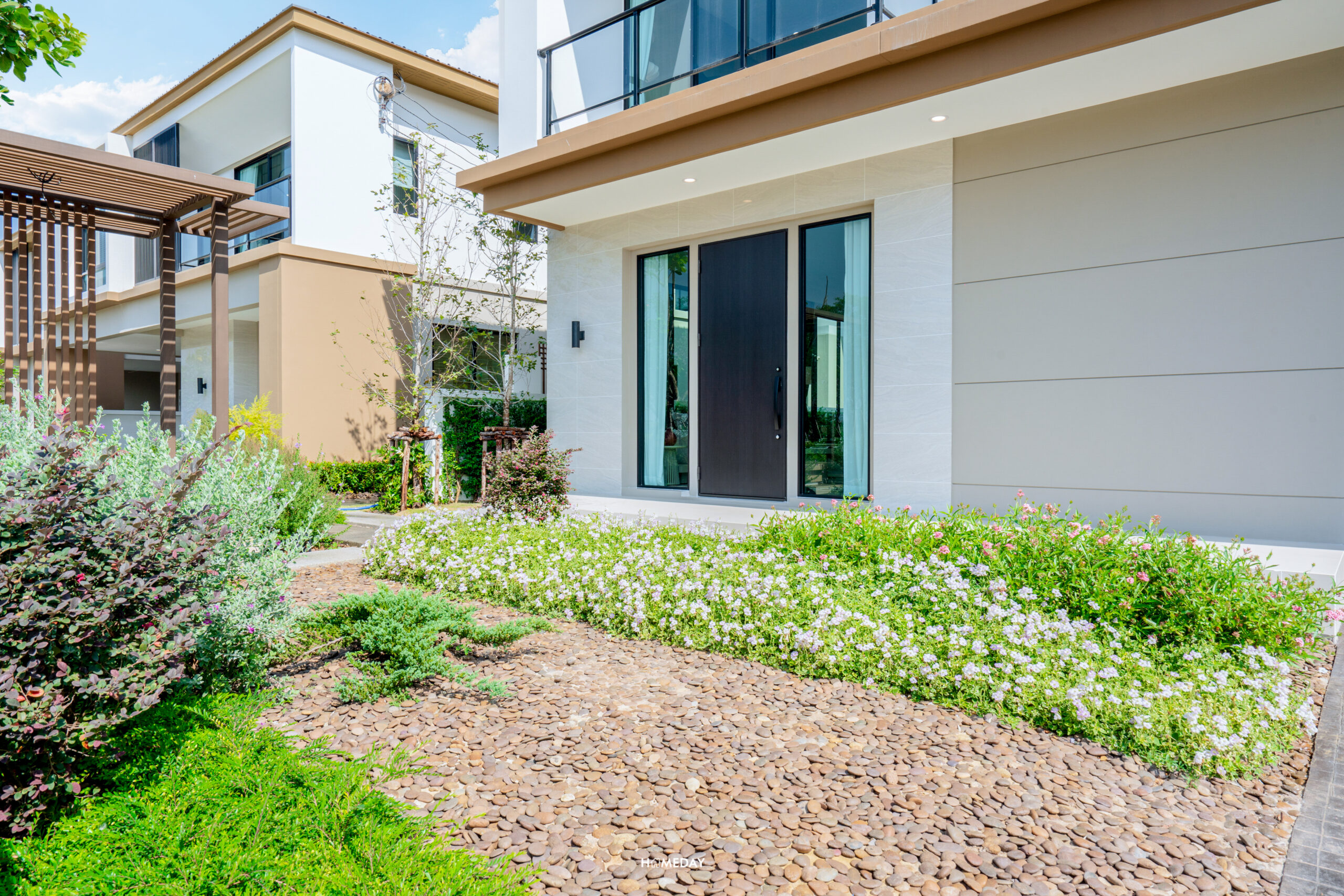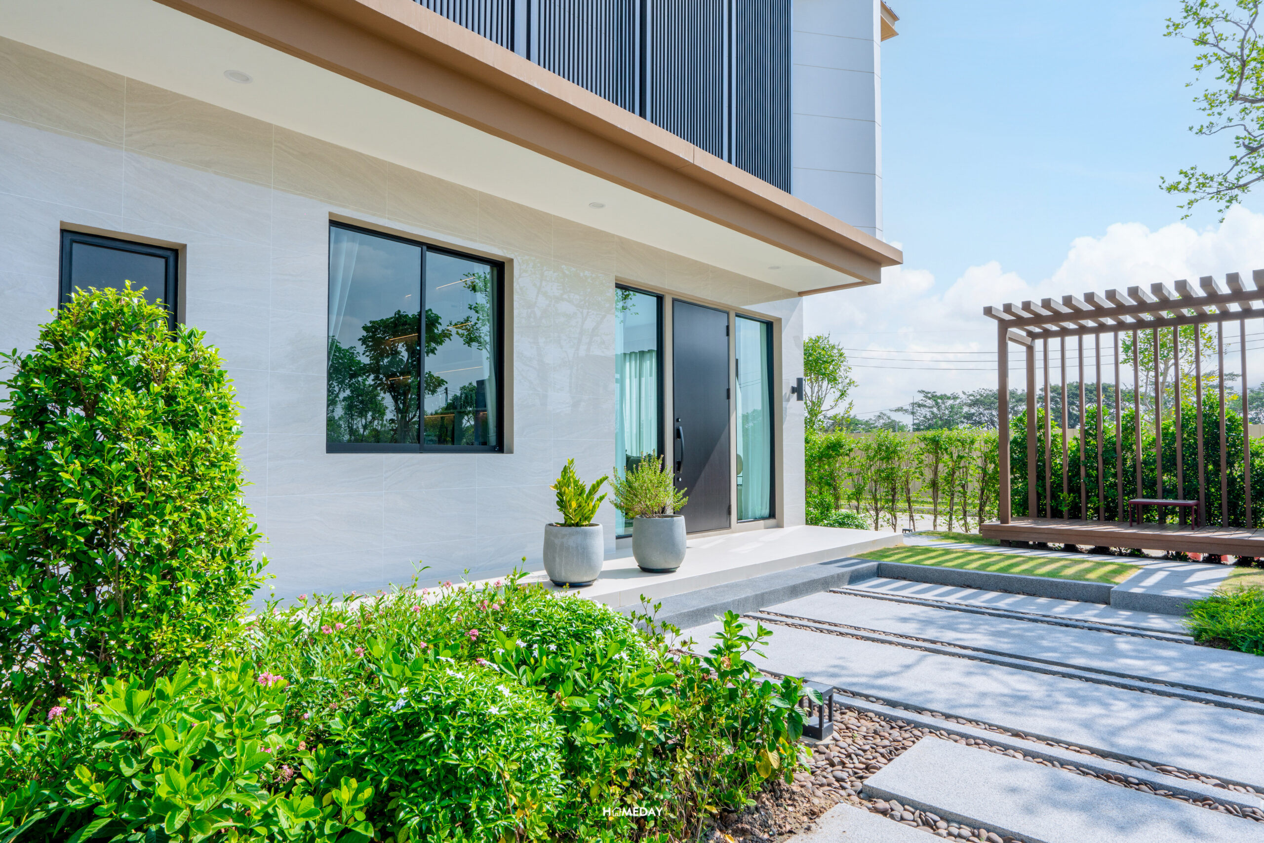 Facade หน้าบ้านสวยงามครับ ชั้น 1 มีการกรุกระเบื้องสวยงาม ตัดสีขาวให้อบอุ่นขึ้นด้วยโทนสีเบจ มีพื้นที่รอบบ้านทั้งด้านหน้าและด้านข้าง สามารถออกแบบตกแต่งสวนได้เอง หรือจะทำมุมนั่งเล่นพักผ่อนก็ได้ครับ ชั้น 2 แผงบังตาใช้วัสดุอลูมิเนียม สีดำ Powder Coat เข้ากับกรอบประตูและหน้าต่างได้อย่างลงตัว Main Entrance มีชานพักด้านหน้า สามารถวางตู้รองเท้าหรือต้นไม้ประดับตกแต่งก็ได้ครับ