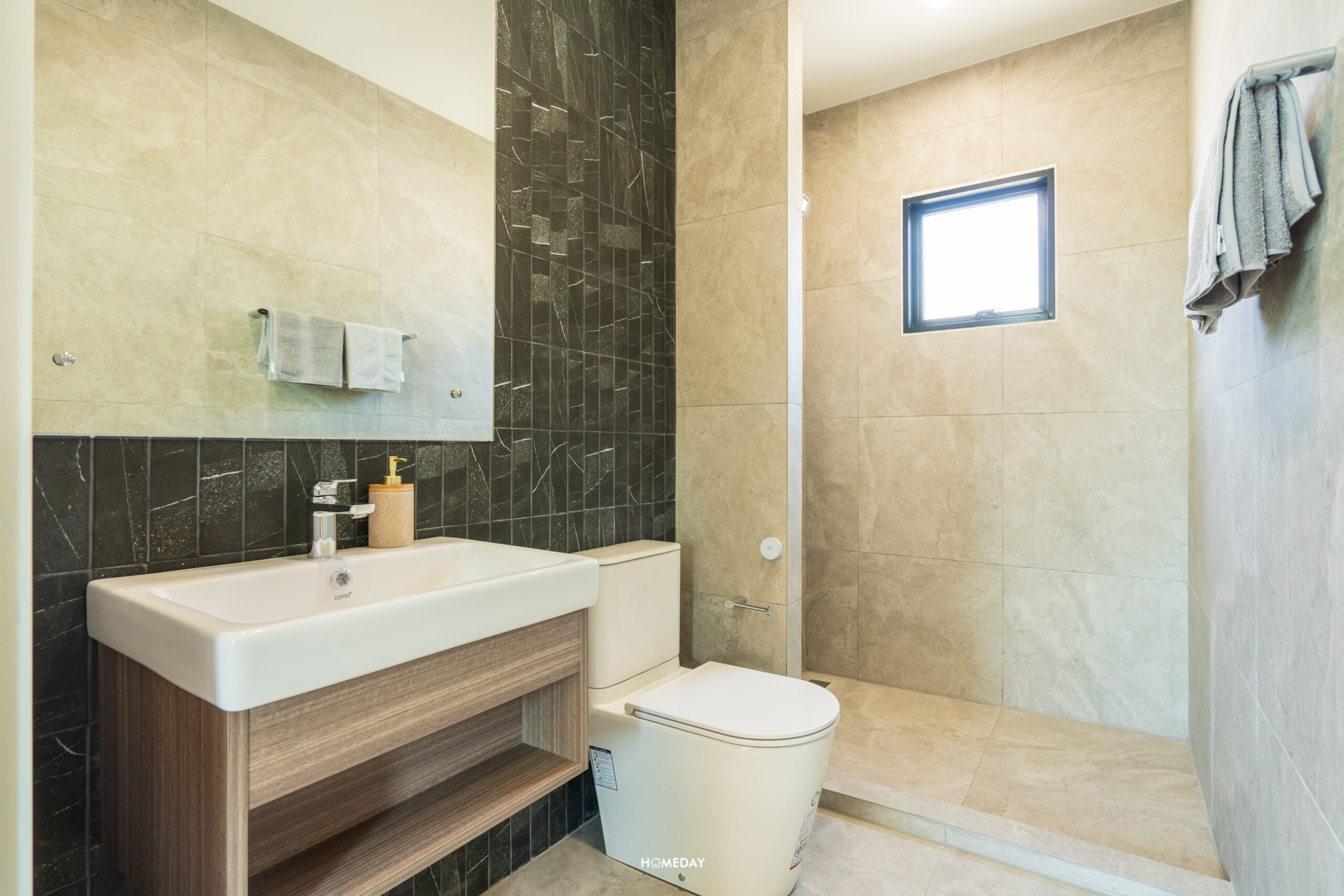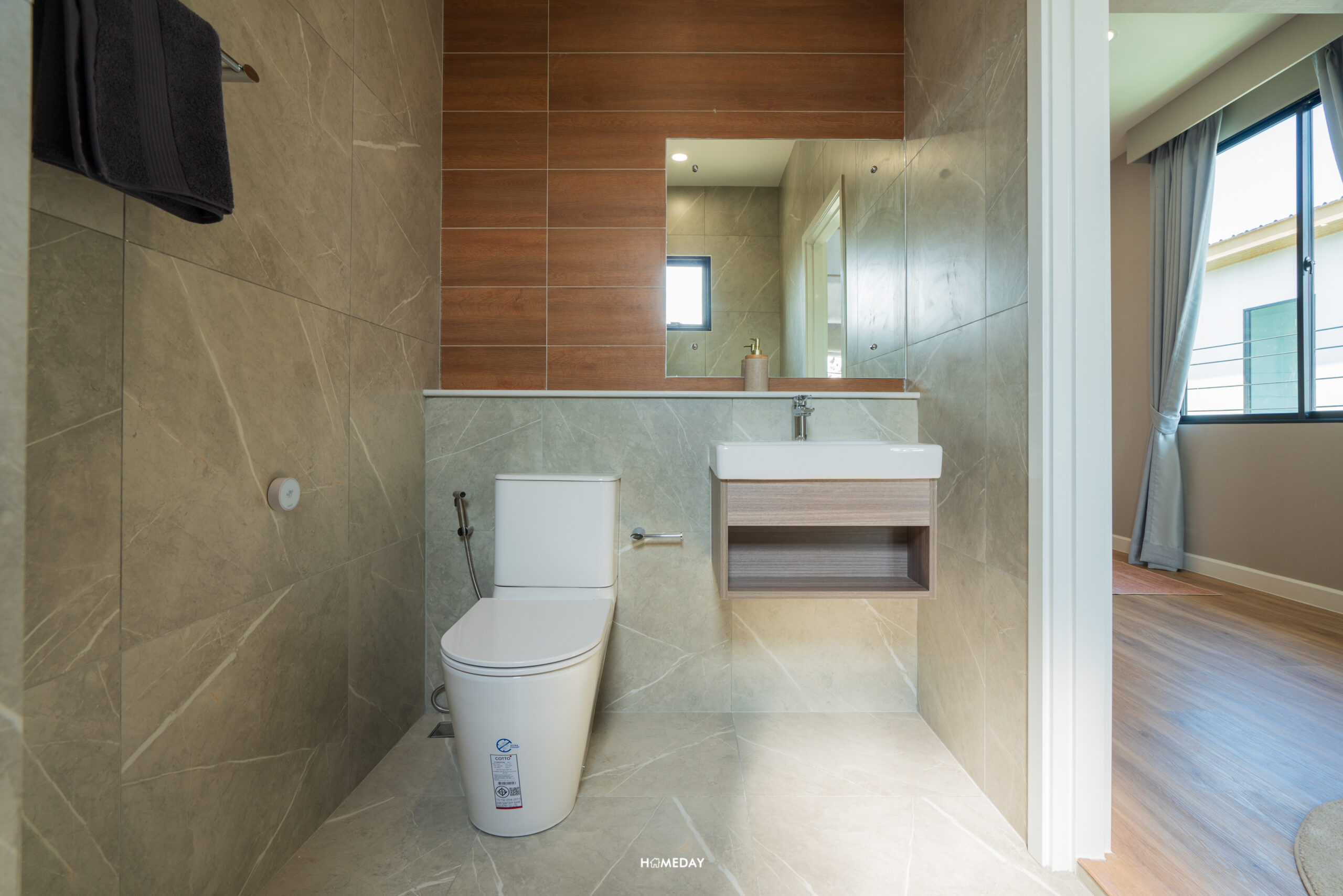 Master Bathroom ขนาดกว้างขวาง แบ่งแยกโซนเปียกและแห้งเอาไว้ให้อย่างดี พื้นที่โซนแห้งมาพร้อมกับบานกระจก LED อ่างล้างหน้ามาพร้อมกับบานตู้เก็บของใต้อ่างล้างมือและ Low Wall ขนาดใหญ่ ใช้วางของได้เยอะเลยครับ ตัวโถสุขภัณฑ์ระบบ Touchless เหมือนเคย ส่วนเปียกได้ Partition กระจกนิรภัยหนา 10 มิลลิเมตรบานเปิด ภายในได้มาครบทั้ง Rain Shower และ Hand Shower มาตรฐานคุณภาพจาก COTTO ทุกชิ้นครับ