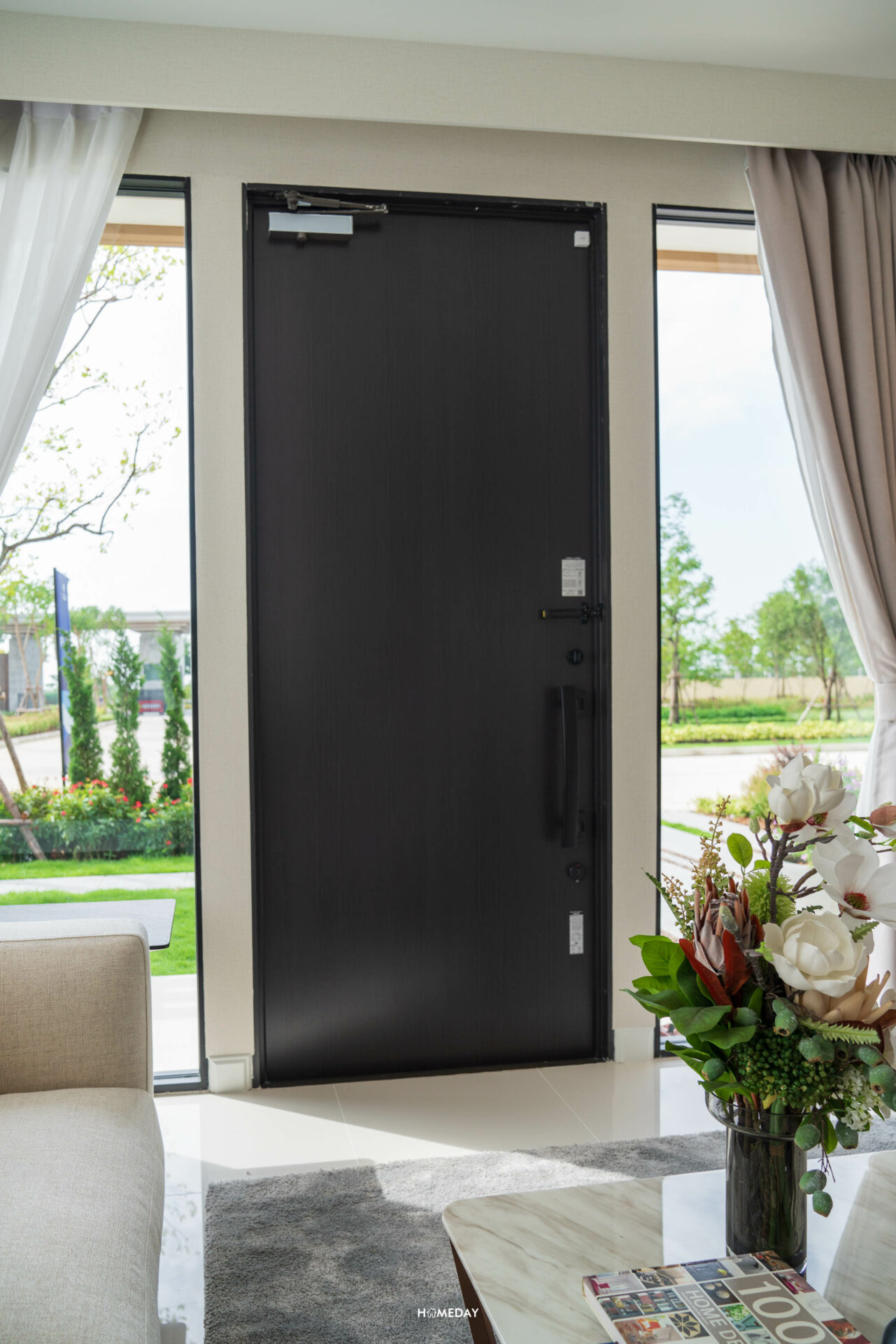 ทางเข้าหลัก บานประตูของแบบบ้านนี้จะแตกต่างจาก UME และ TA-KE โดยหลังนี้จะใช้เป็นบานสวิง อลูมิเนียมสี TURIN PINE จากแบรนด์ TOSTEM มีคุณสมบัติป้องกันการถ่ายเทความร้อน ต้านแรงรม กันน้ำฝนรั่วซึม และอากาศรั่วไหล ทนต่อความร้อนและความชื้นได้ดี ไม่บิดงอ ใช้งานได้ยาวนานแน่นอนครับ